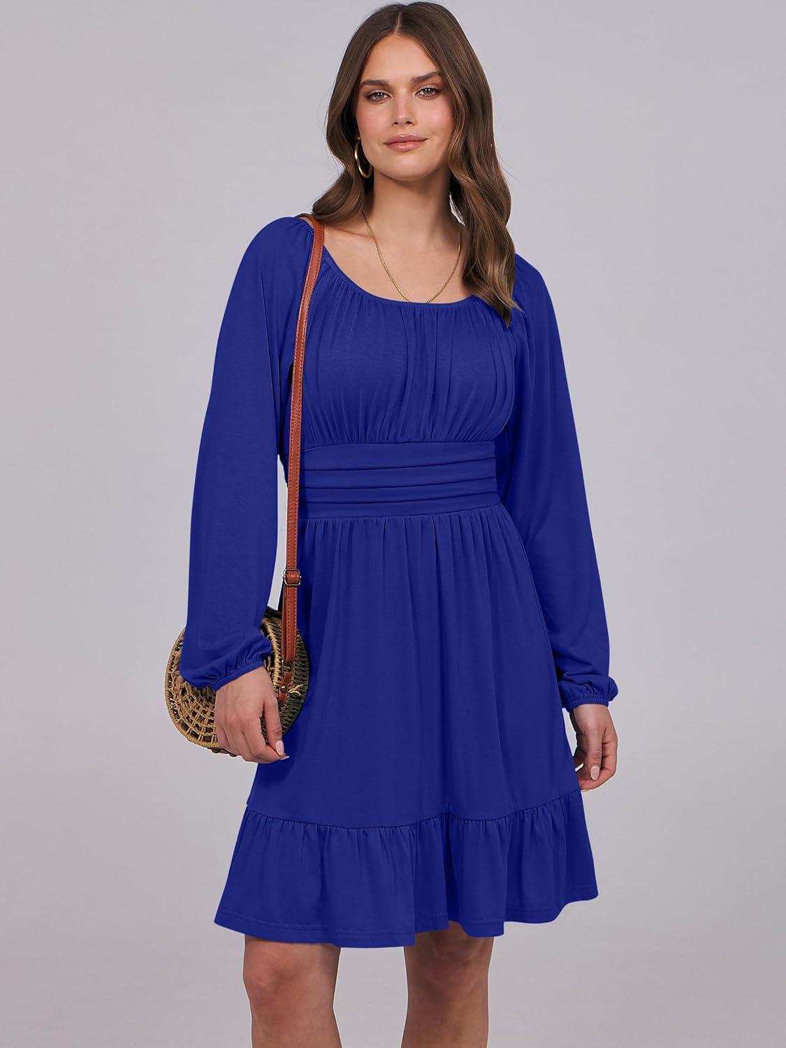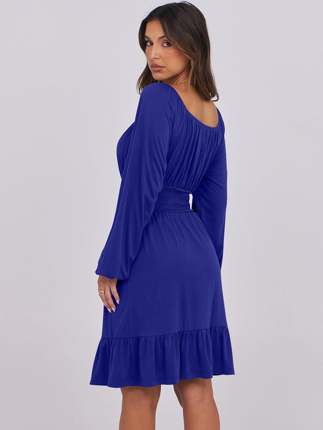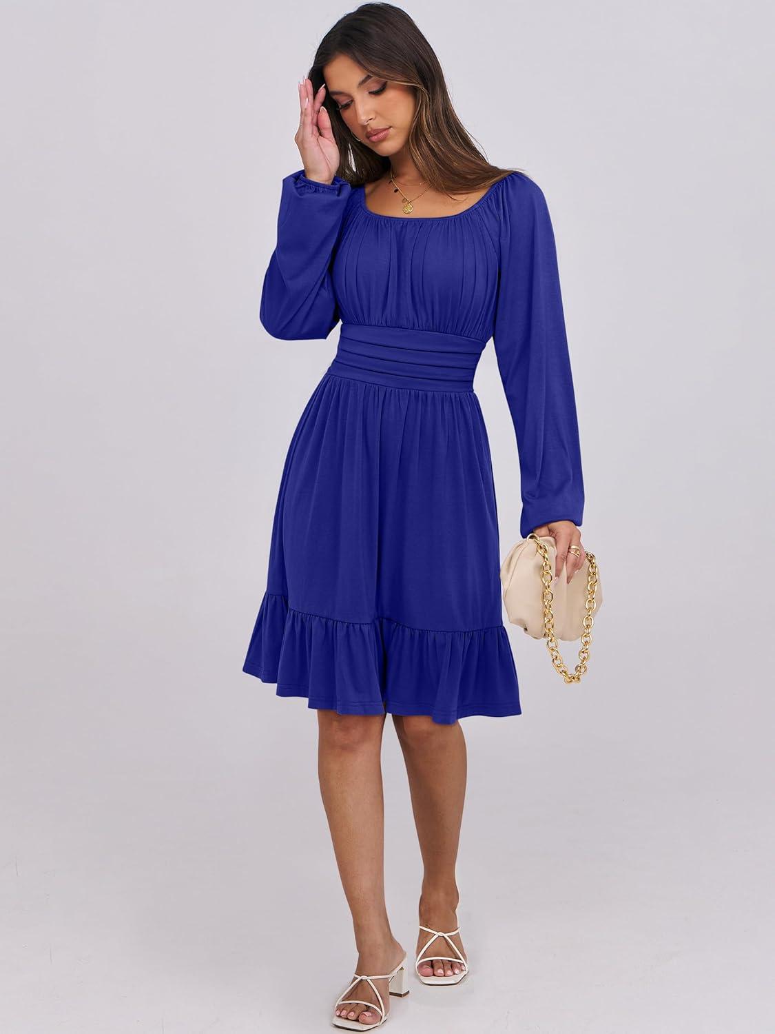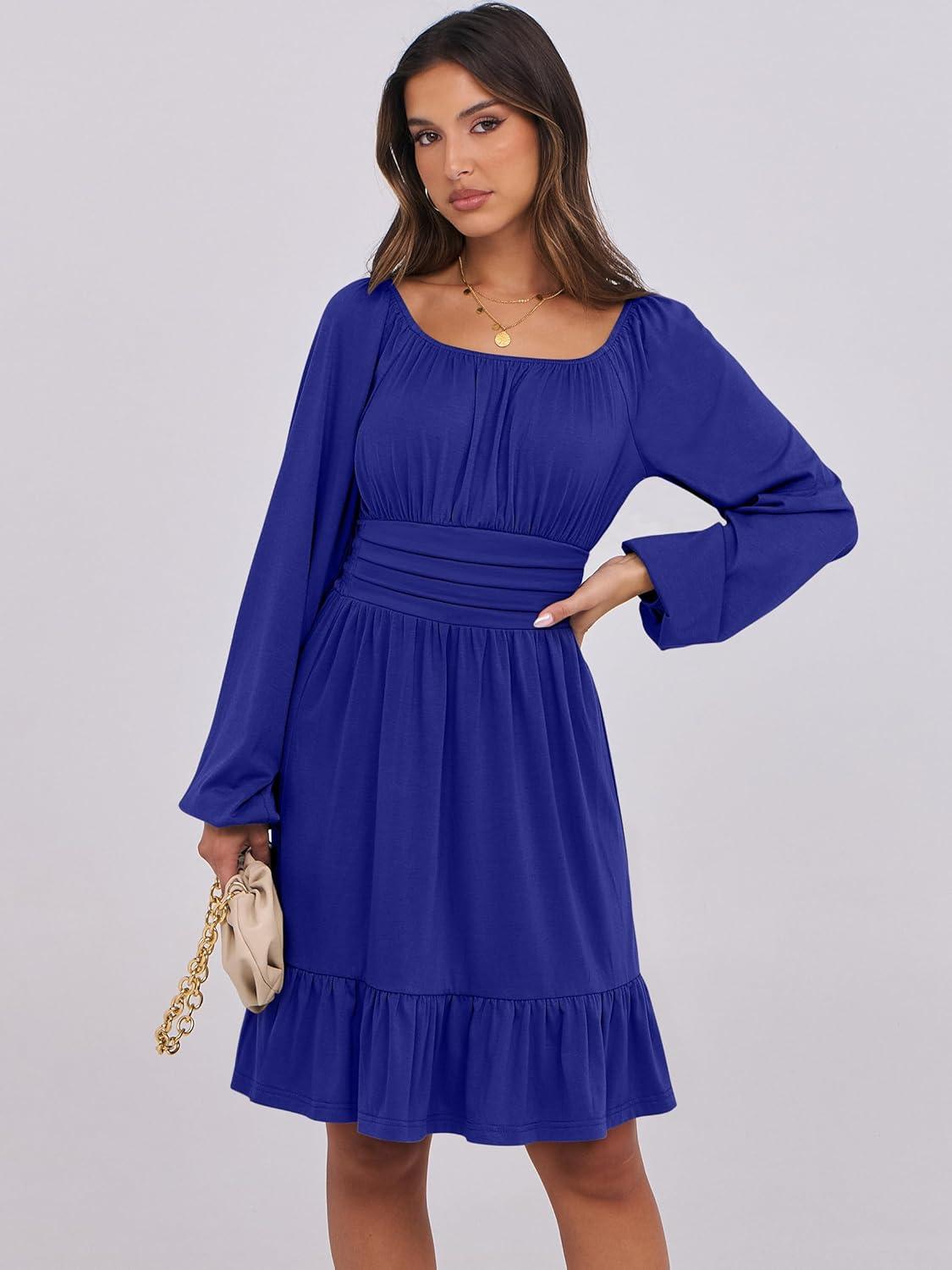 ANRABESS Womens Dress Long Lantern Sleeve Square Neck Elastic Waist Ruffle Flowy Swing A-Line Short Dresses 2025 Fall Fashion(Royal)