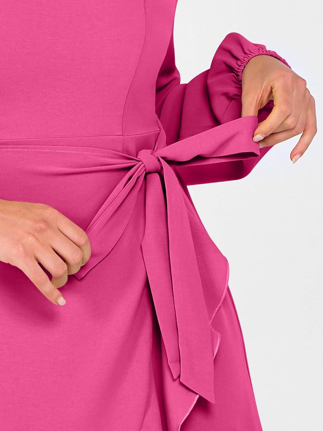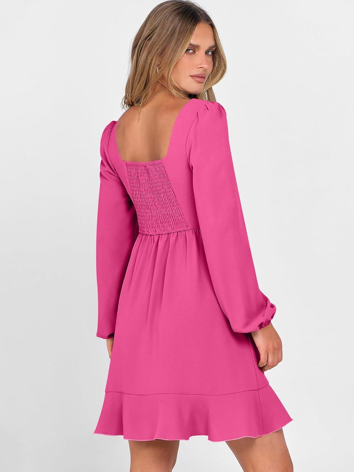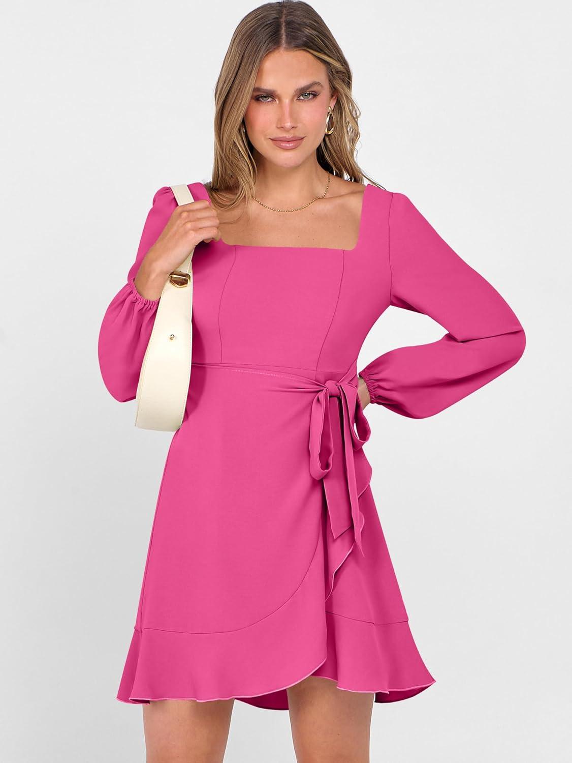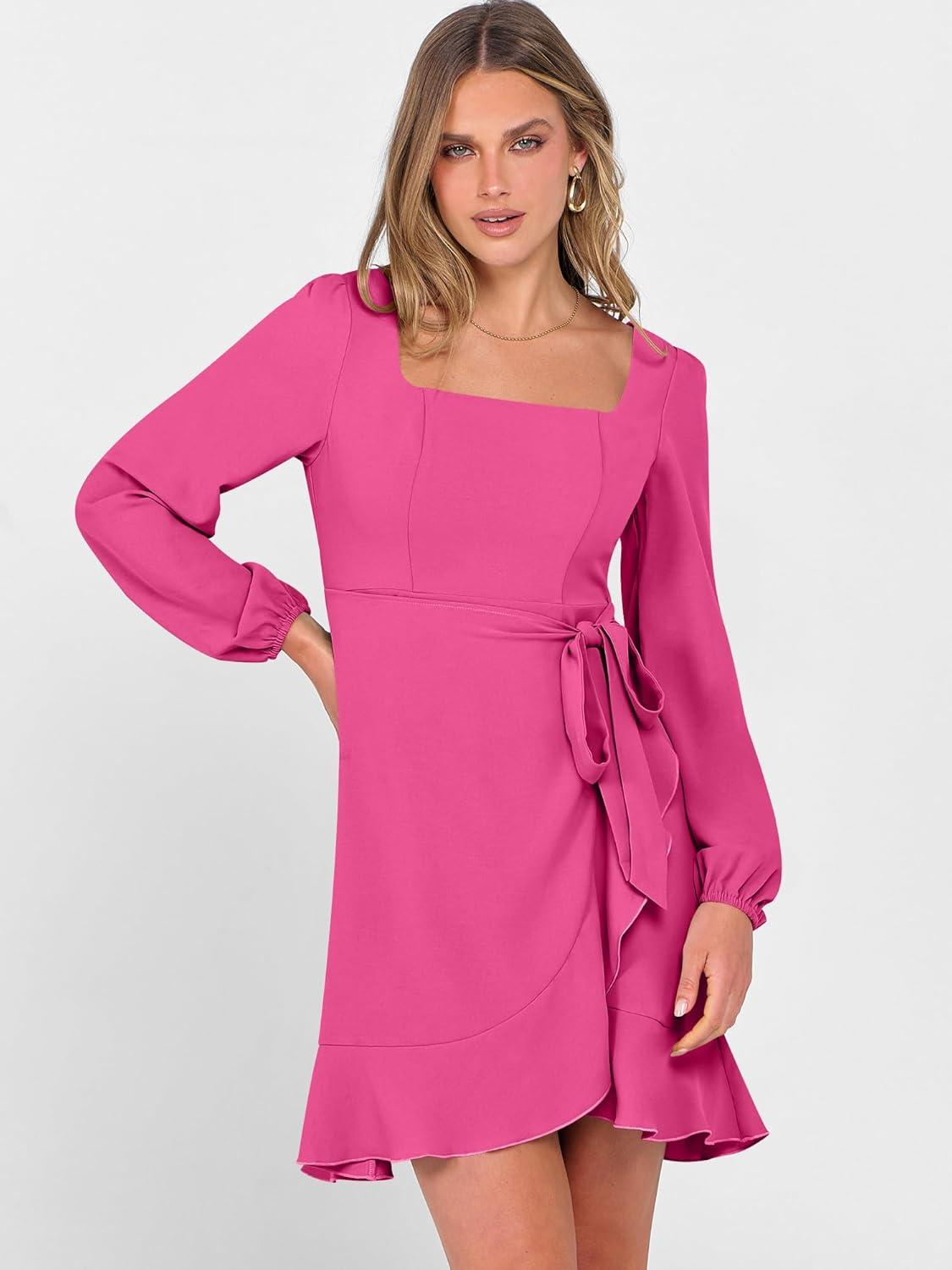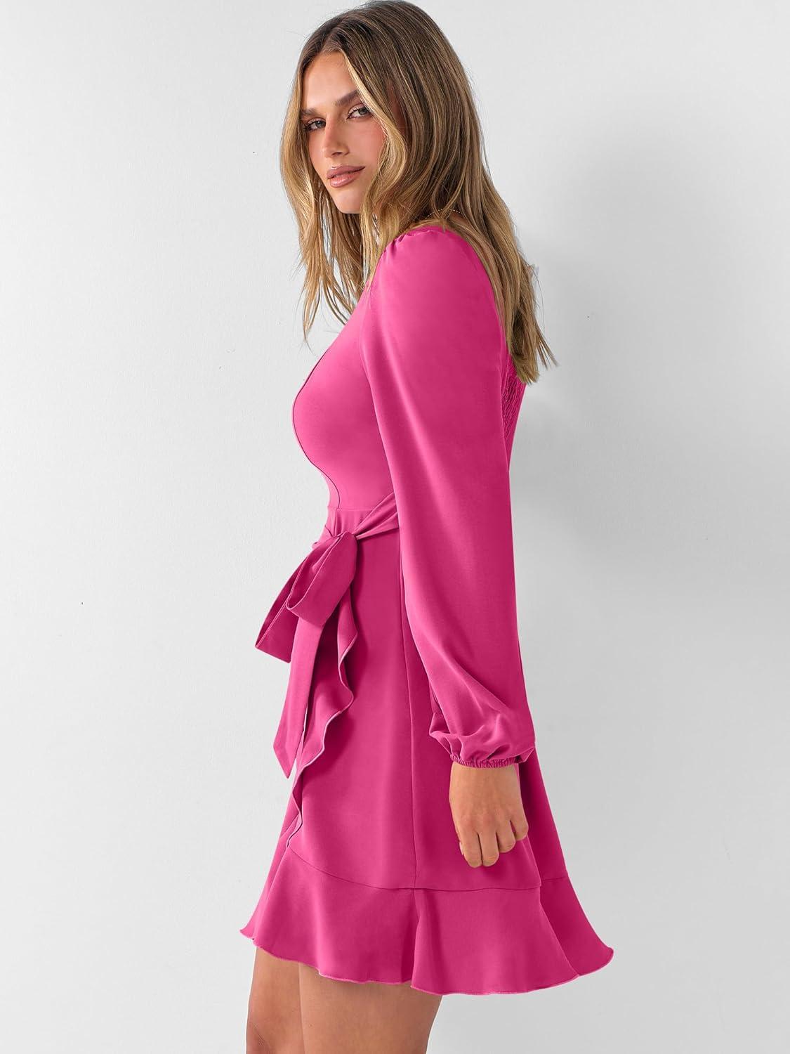 imageANRABESS Womens Dress Long Sleeve Square Neck Tie Waist Ruffle Hem Short Cocktail Wedding Guest Fall Party Club Mini DressesHot Pink