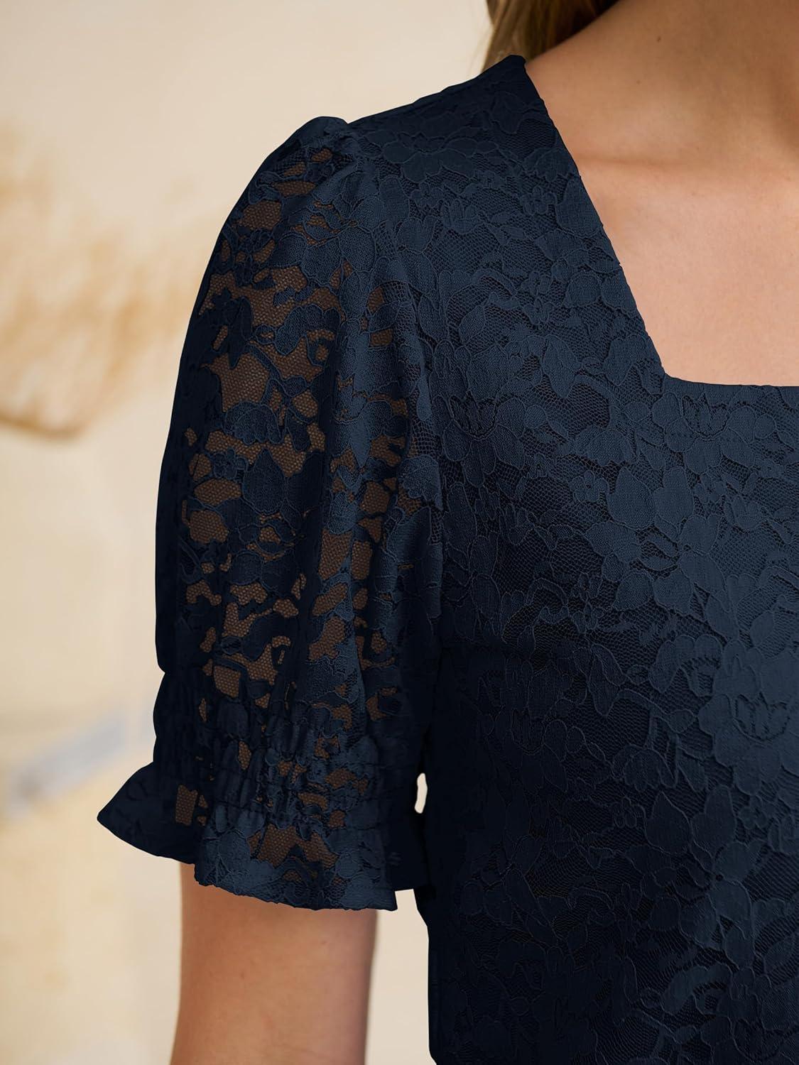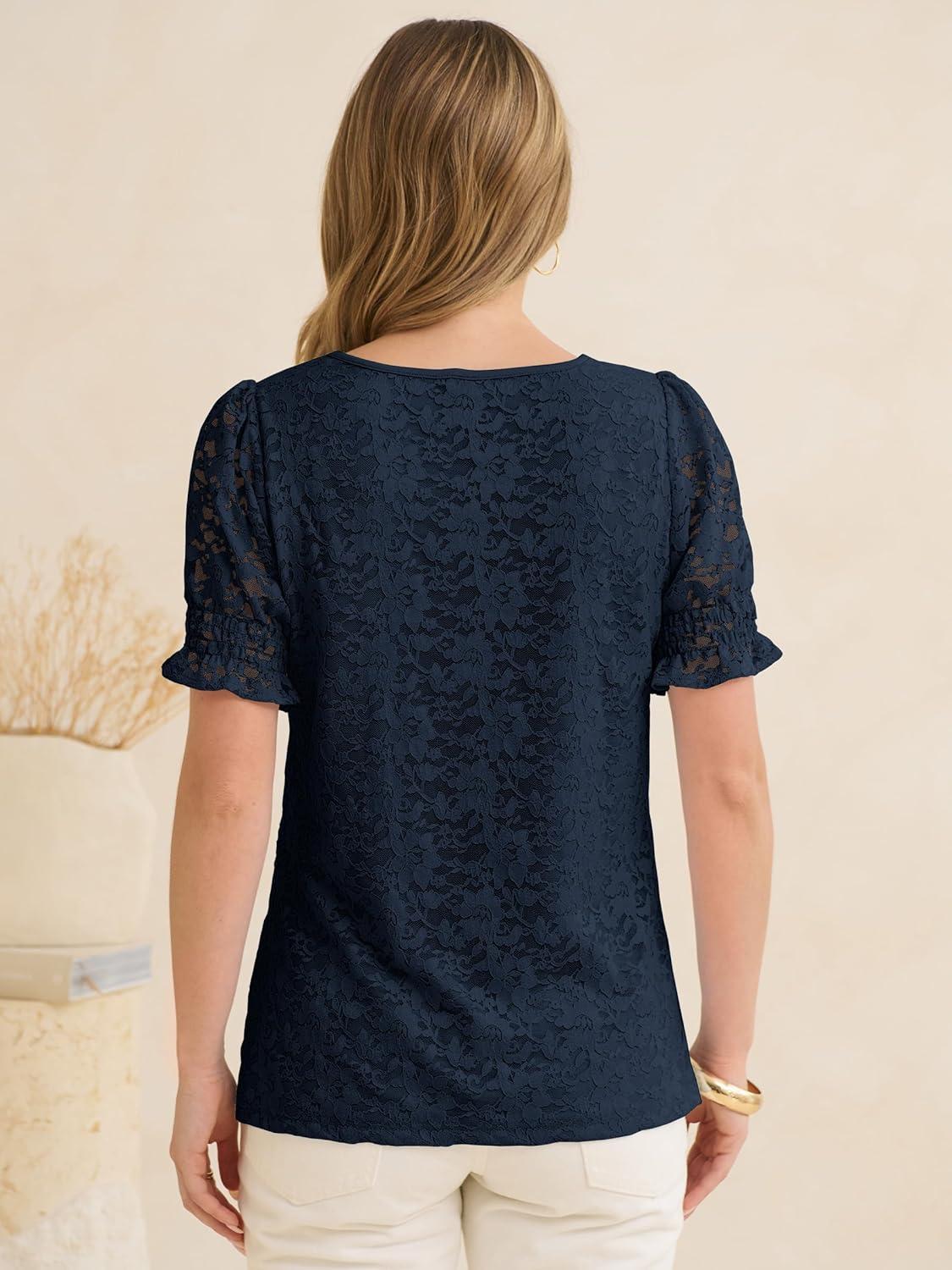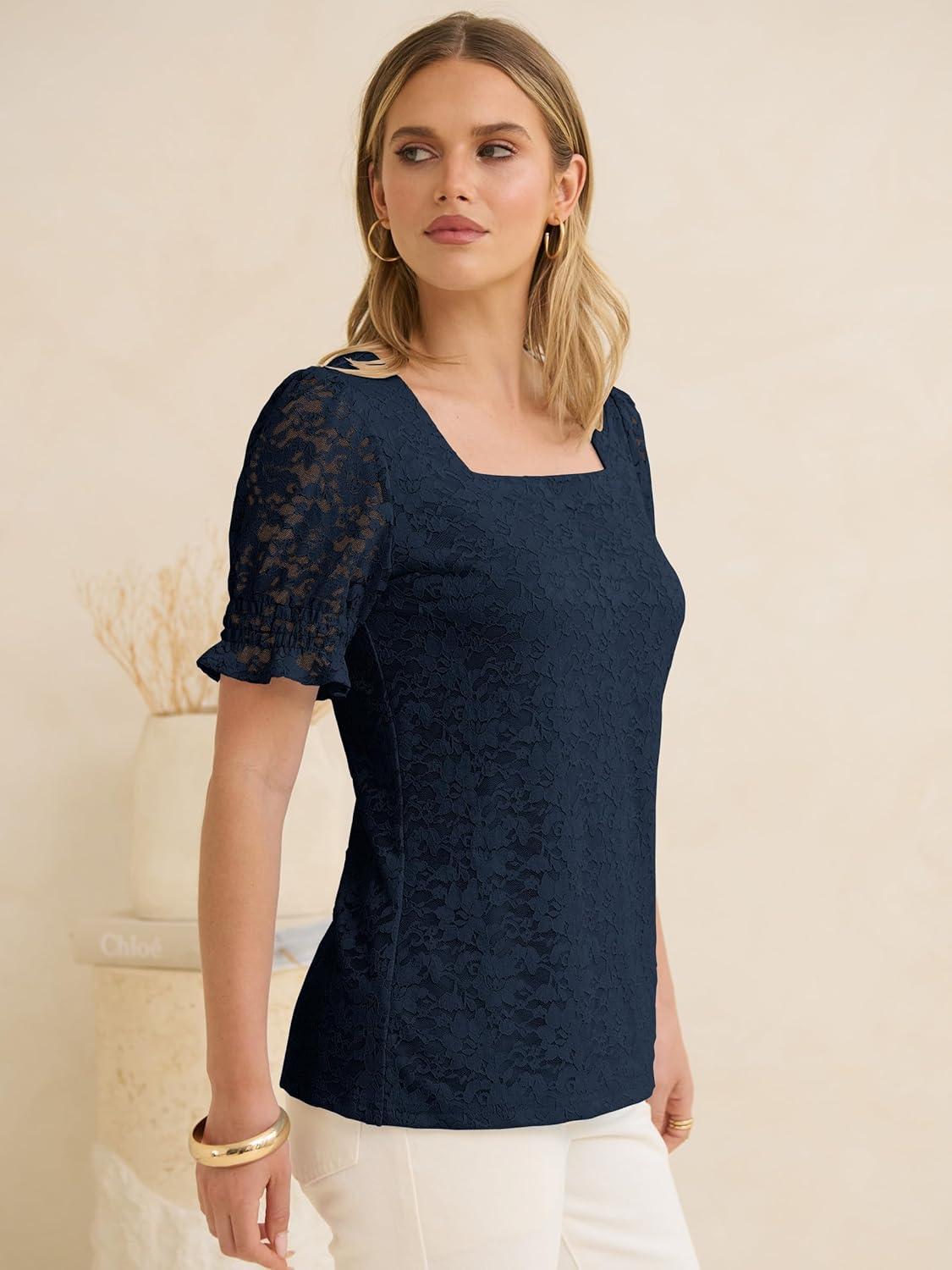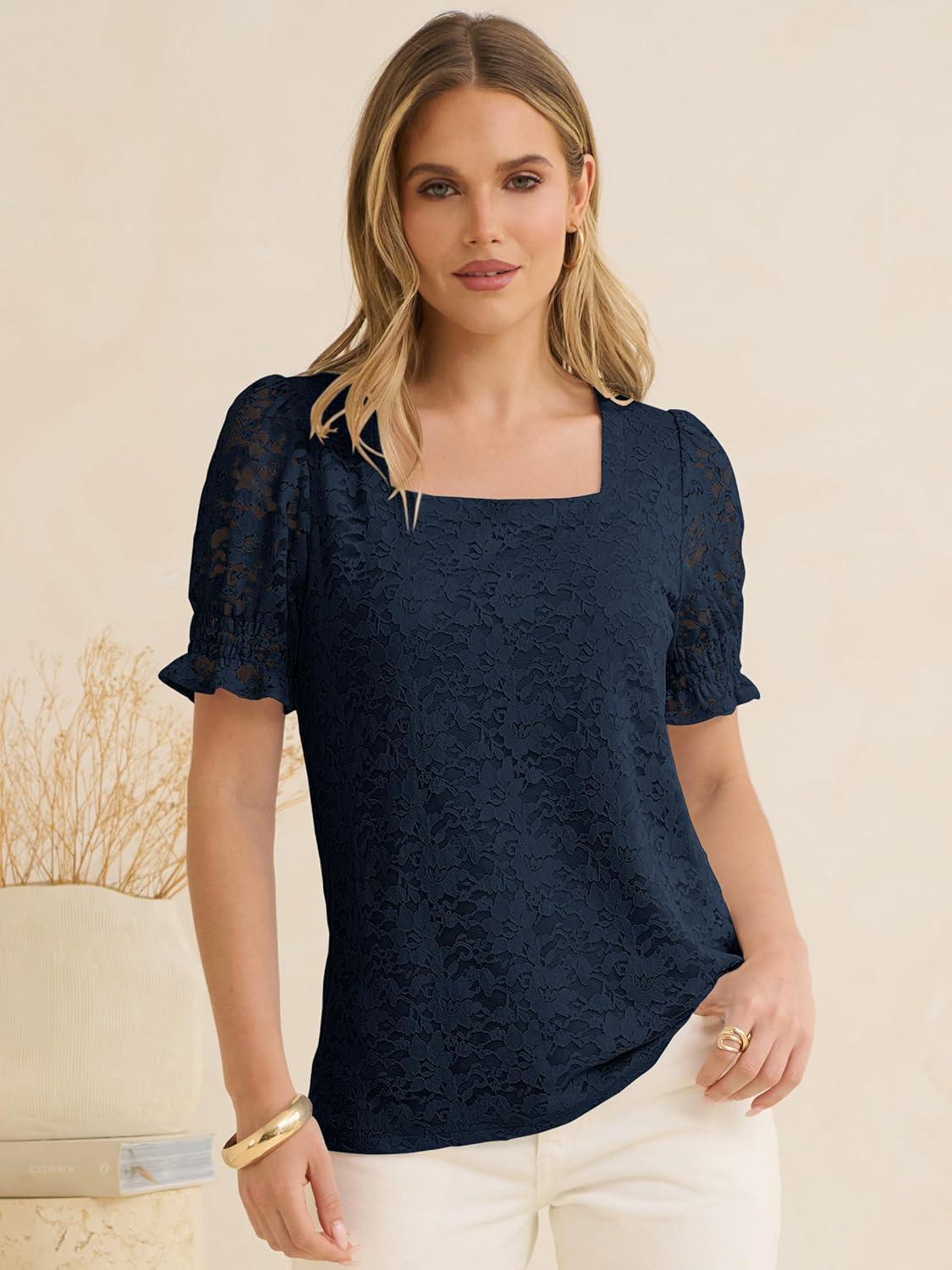 ANRABESS Womens Dressy Casual Blouses 2026 Summer Work Shirts Lace Square Neck Puff Sleeve Tee Tops Spring Fashion Clothes(Navy Blue)
