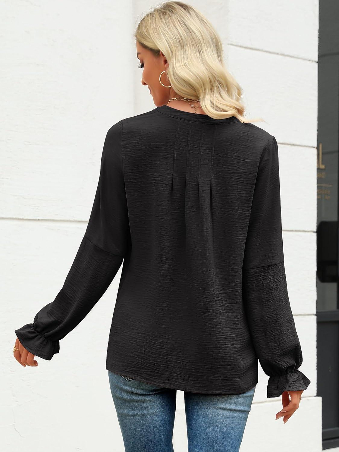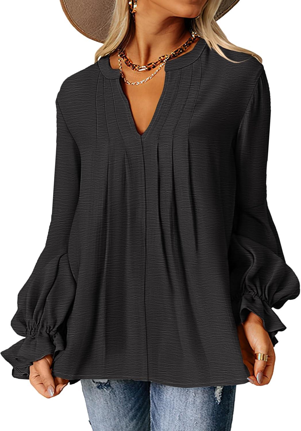 ANRABESS Women’s Dressy Casual Blouses V Neck Long Sleeve 2025 Fall Loose Fit Tunic Tops Pleated T Shirts Trendy Outfits(Black)