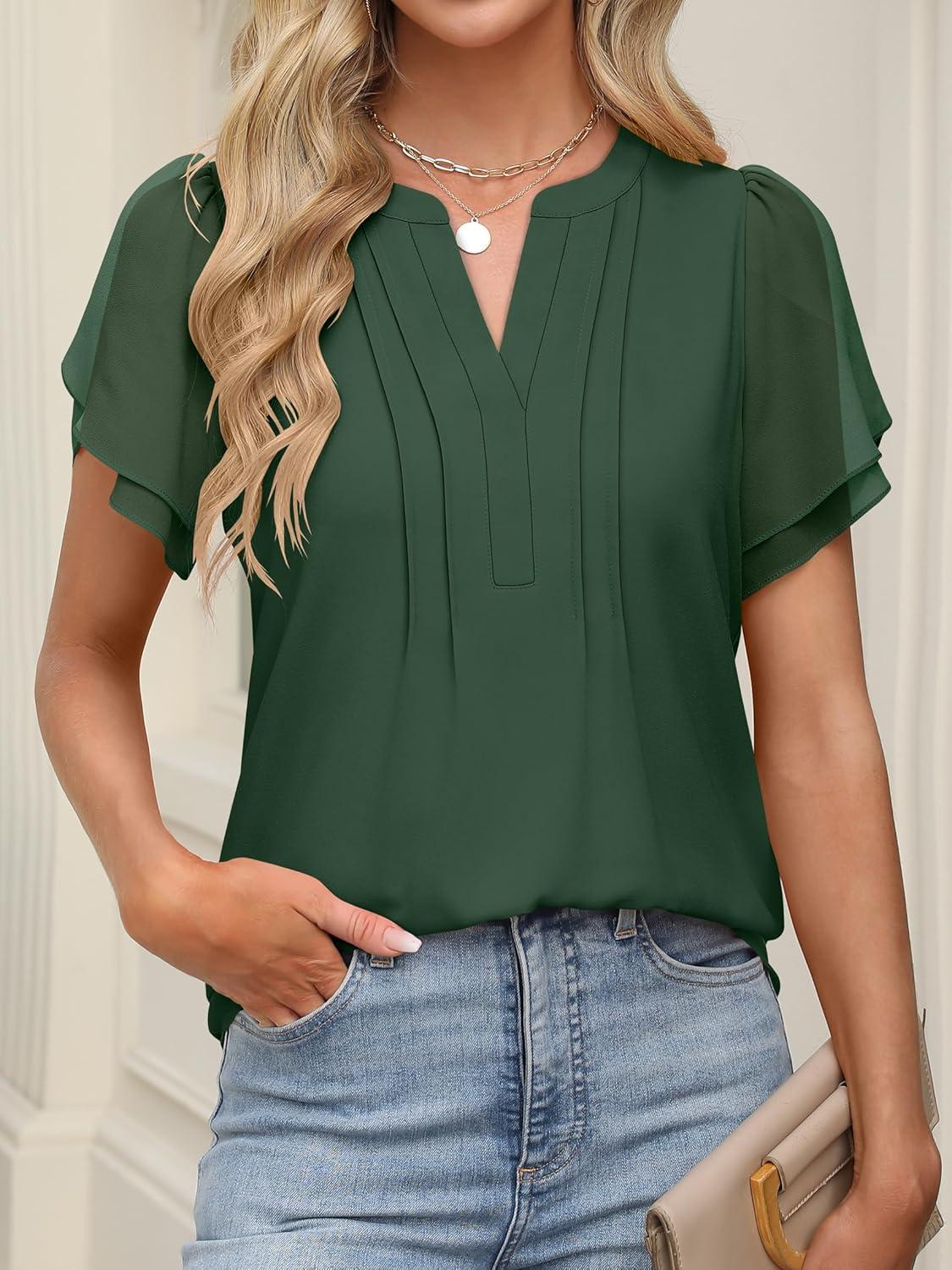 ANRABESS Womens Dressy Chiffon Blouses V Neck Petal Short Sleeve Shirts 2025 Summer Casual Business Office Work Tops(Army Green)