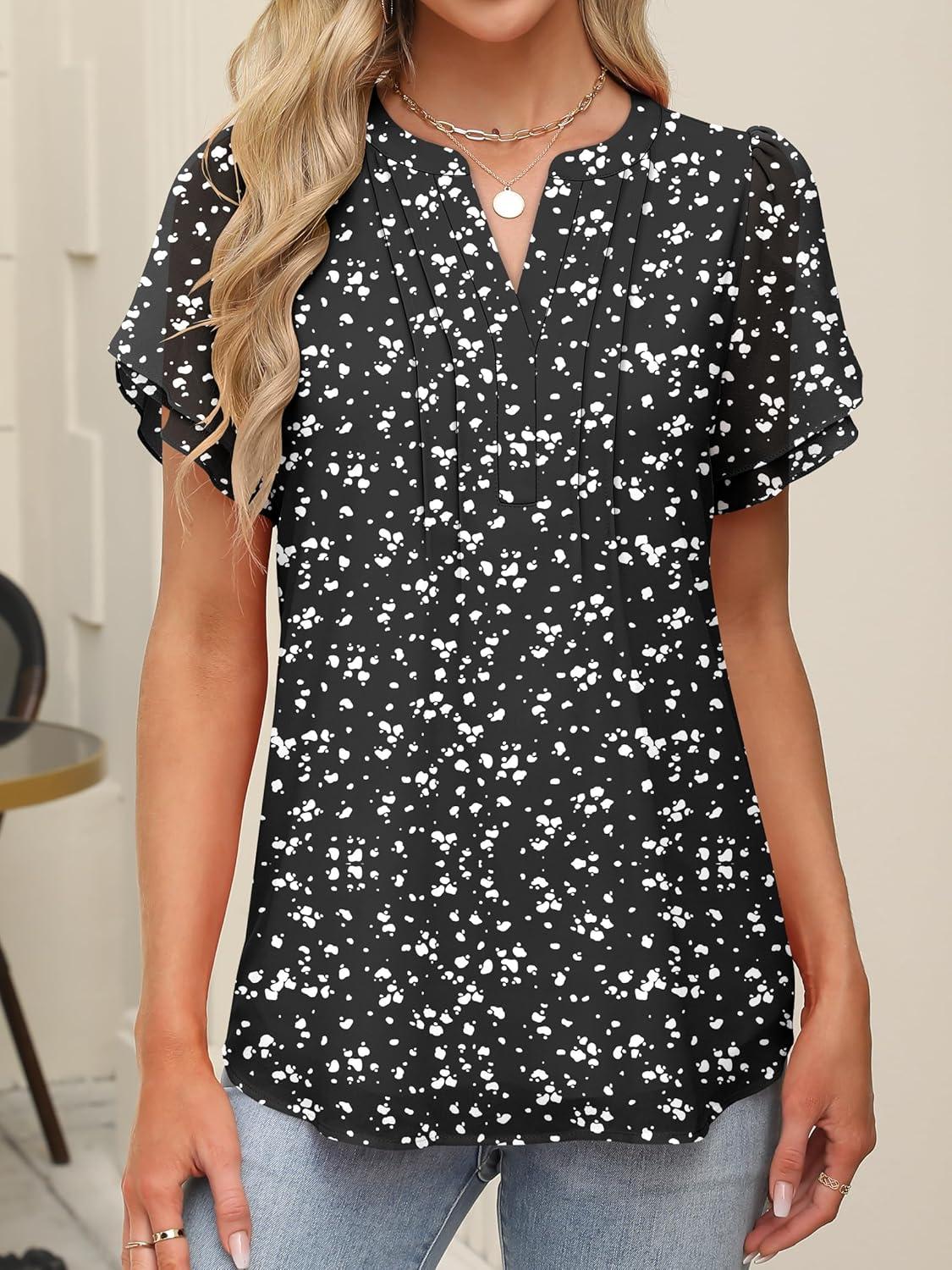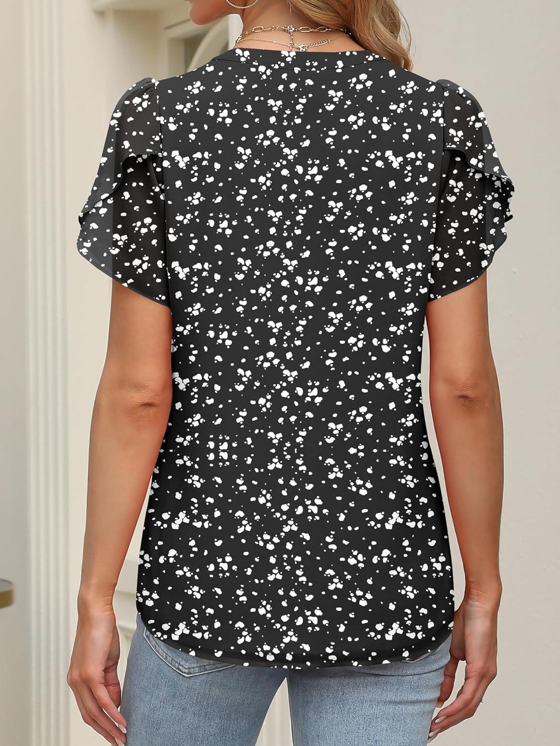 ANRABESS Womens Dressy Chiffon Blouses V Neck Petal Short Sleeve Shirts 2025 Summer Casual Business Office Work Tops(Black Floral)
