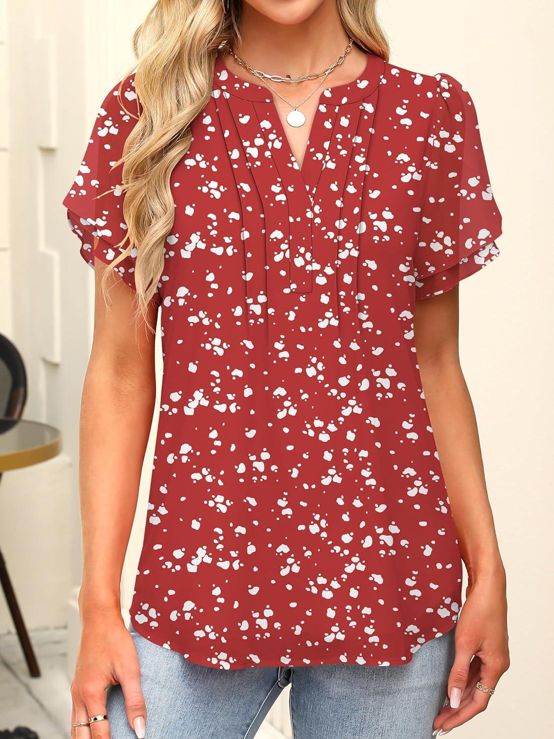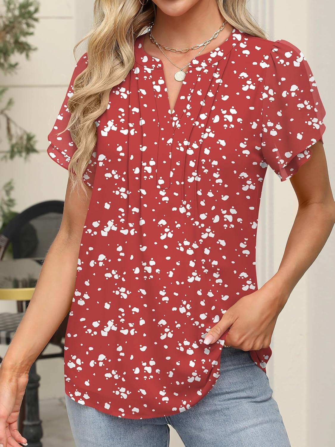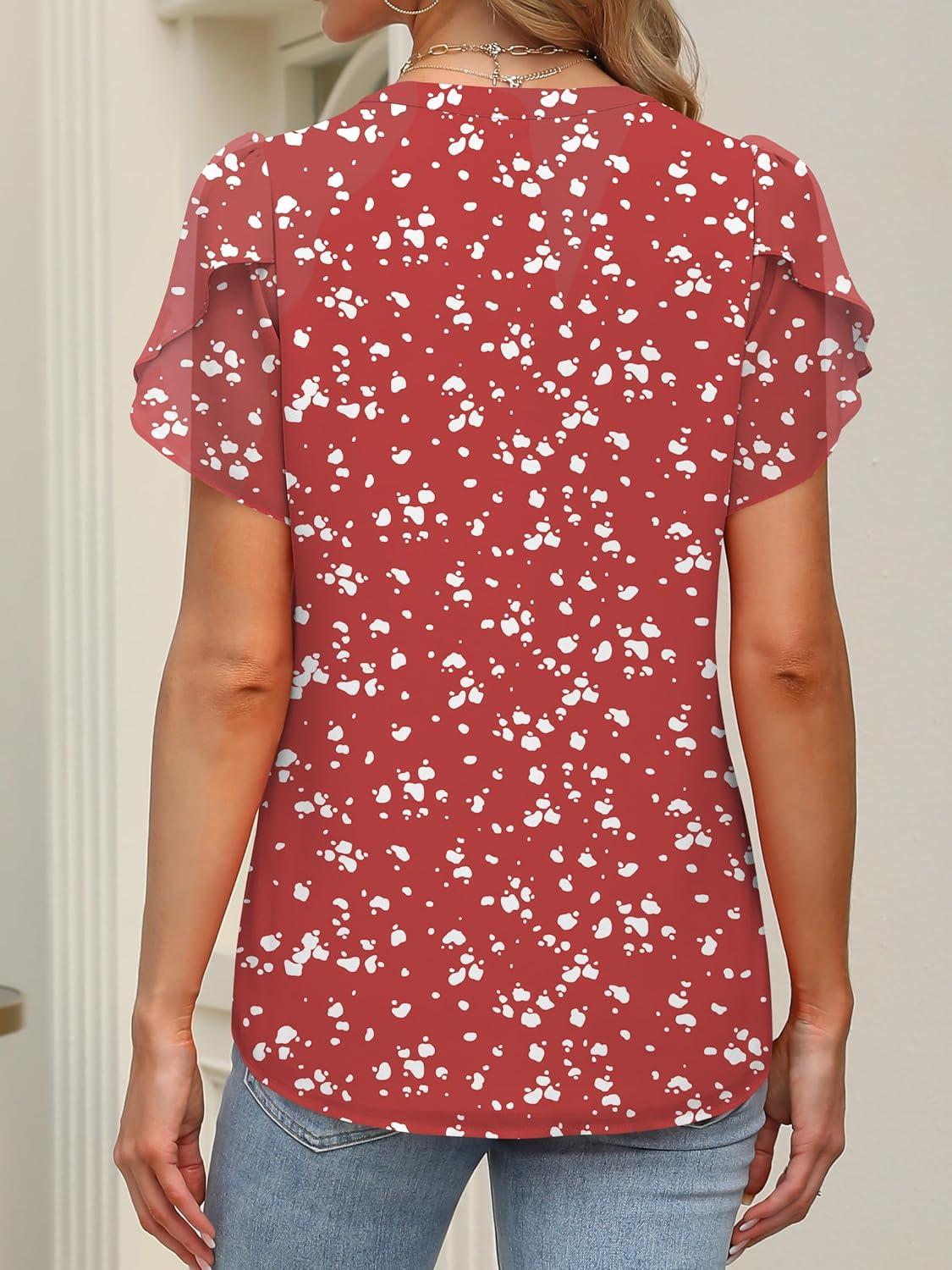 ANRABESS Womens Dressy Chiffon Blouses V Neck Petal Short Sleeve Shirts 2025 Summer Casual Business Office Work Tops(Red Floral)