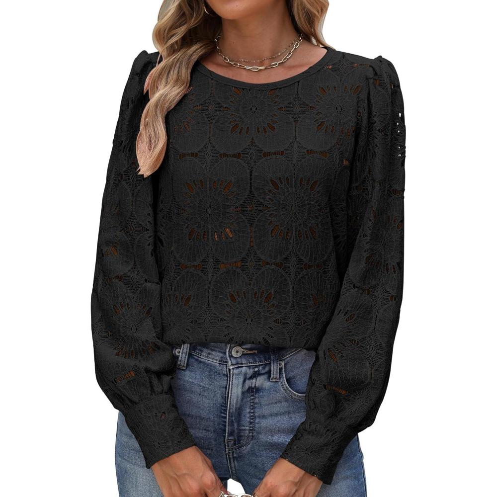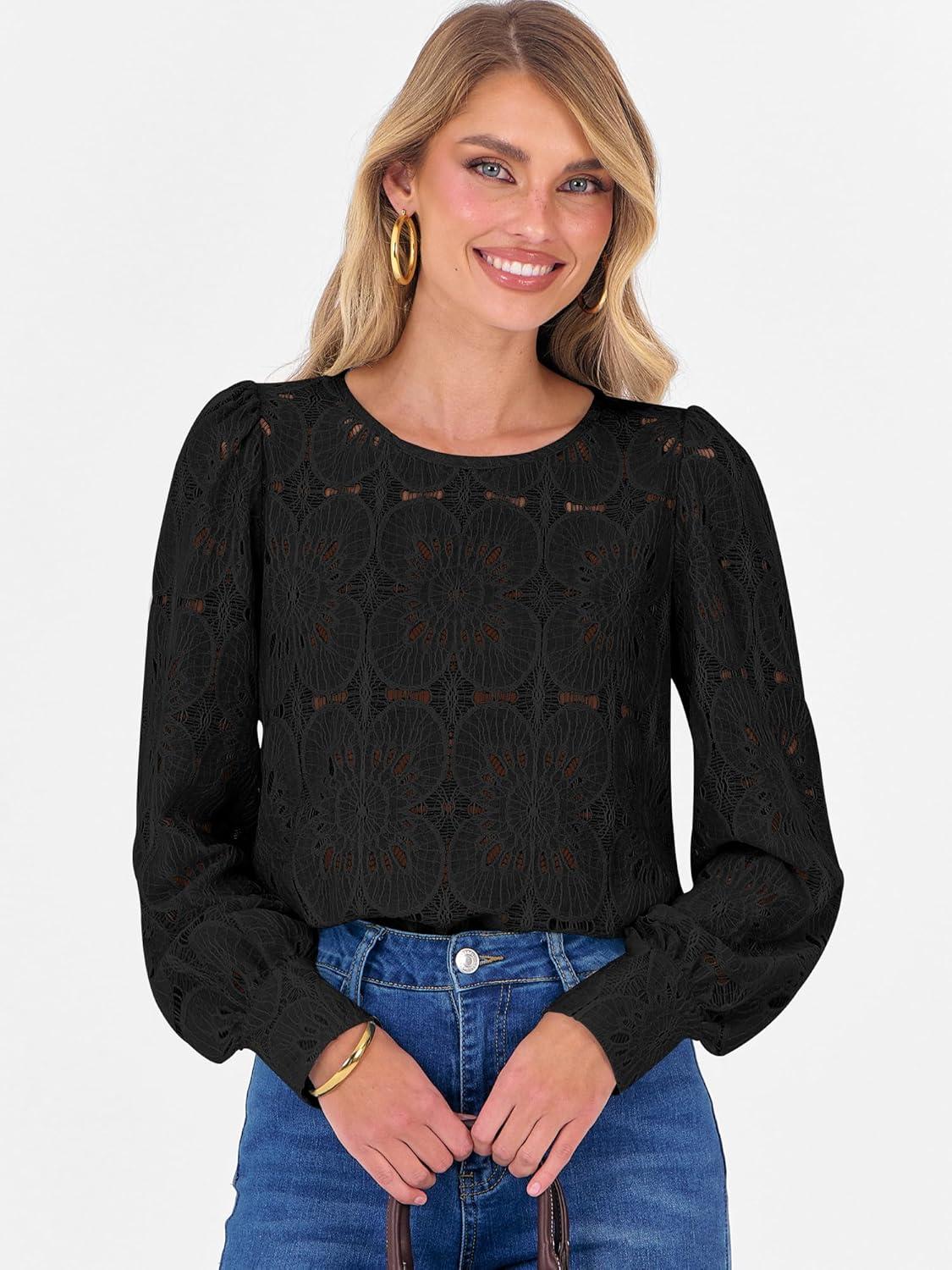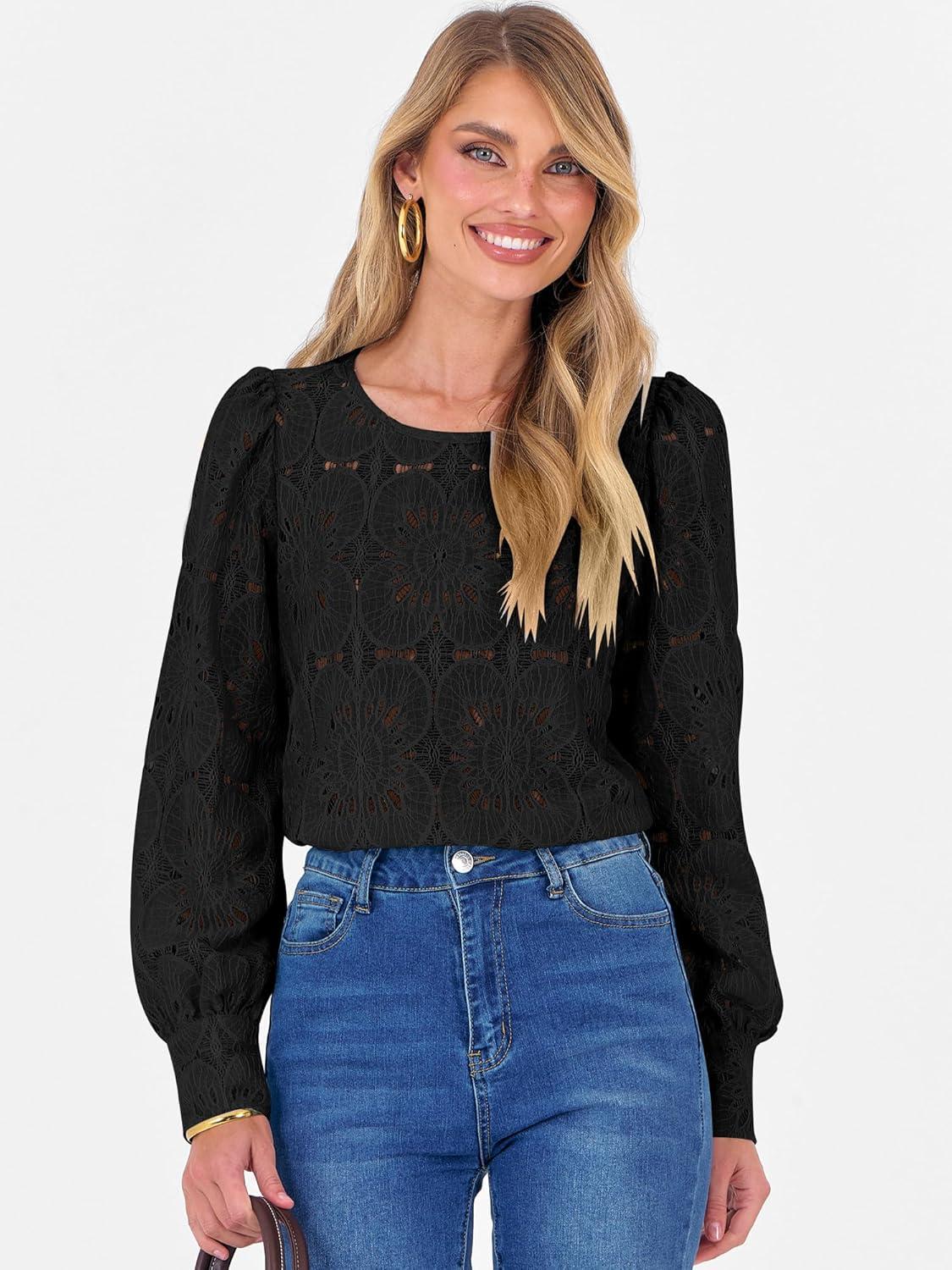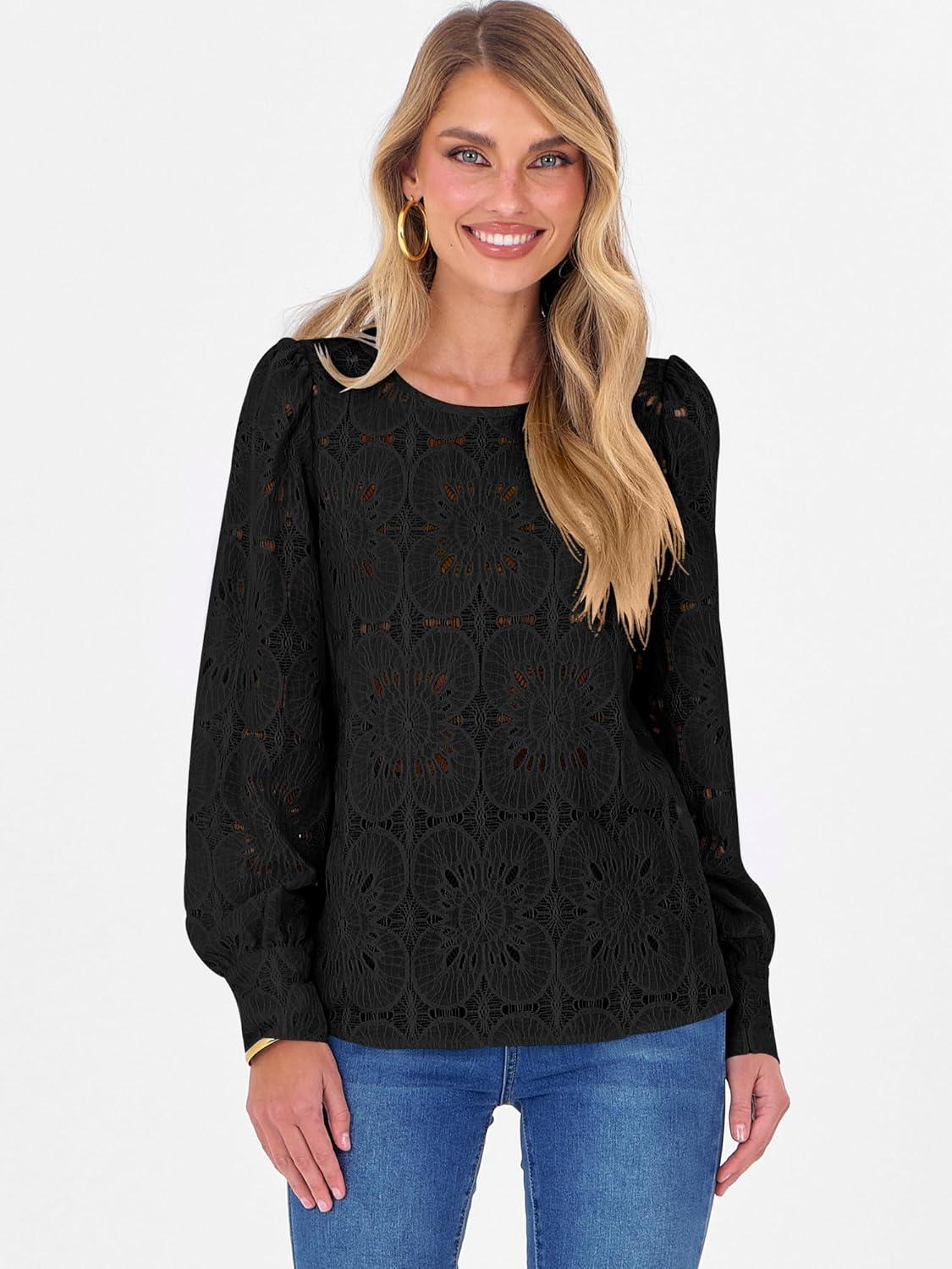 ANRABESS Womens Eyelet Long Sleeve Tops Business Casual Blouses Crochet Lace Shirts 2025 Fall Fashion Outfits(Black)
