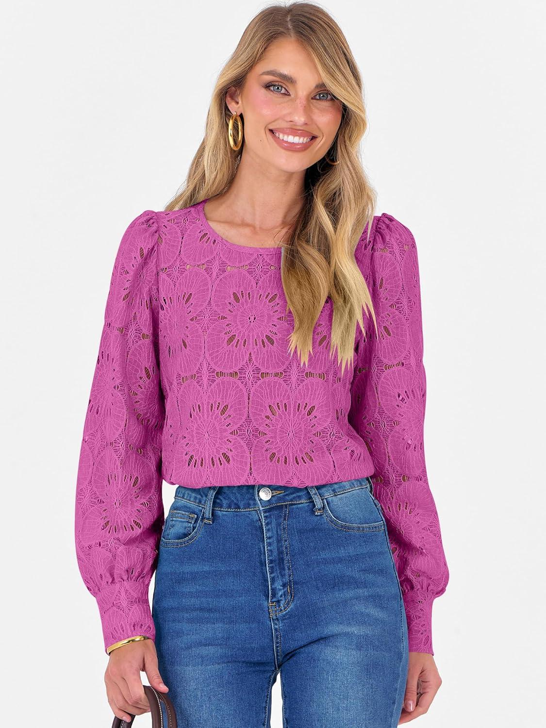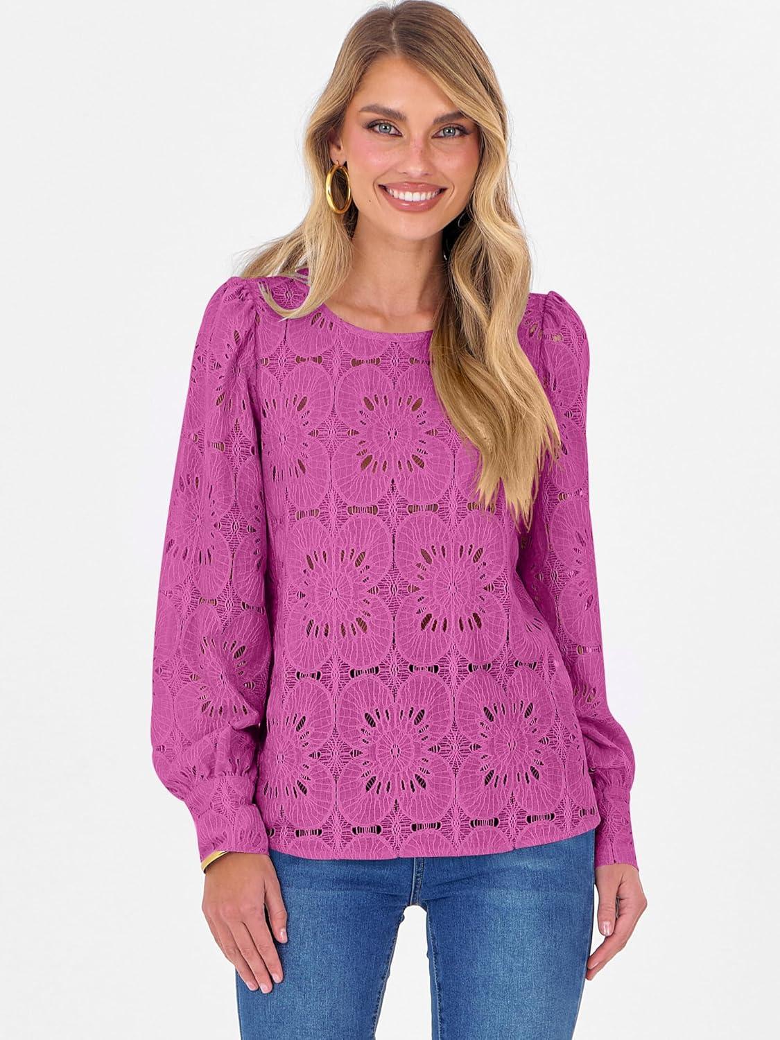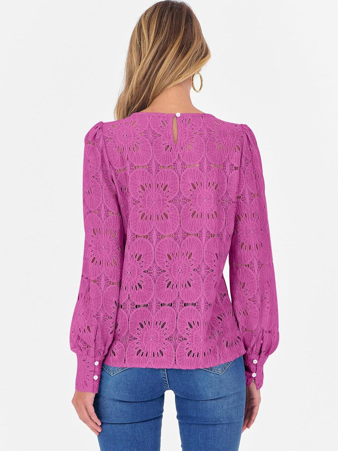 ANRABESS Womens Eyelet Long Sleeve Tops Business Casual Blouses Crochet Lace Shirts 2025 Fall Fashion Outfits(Hot Pink)