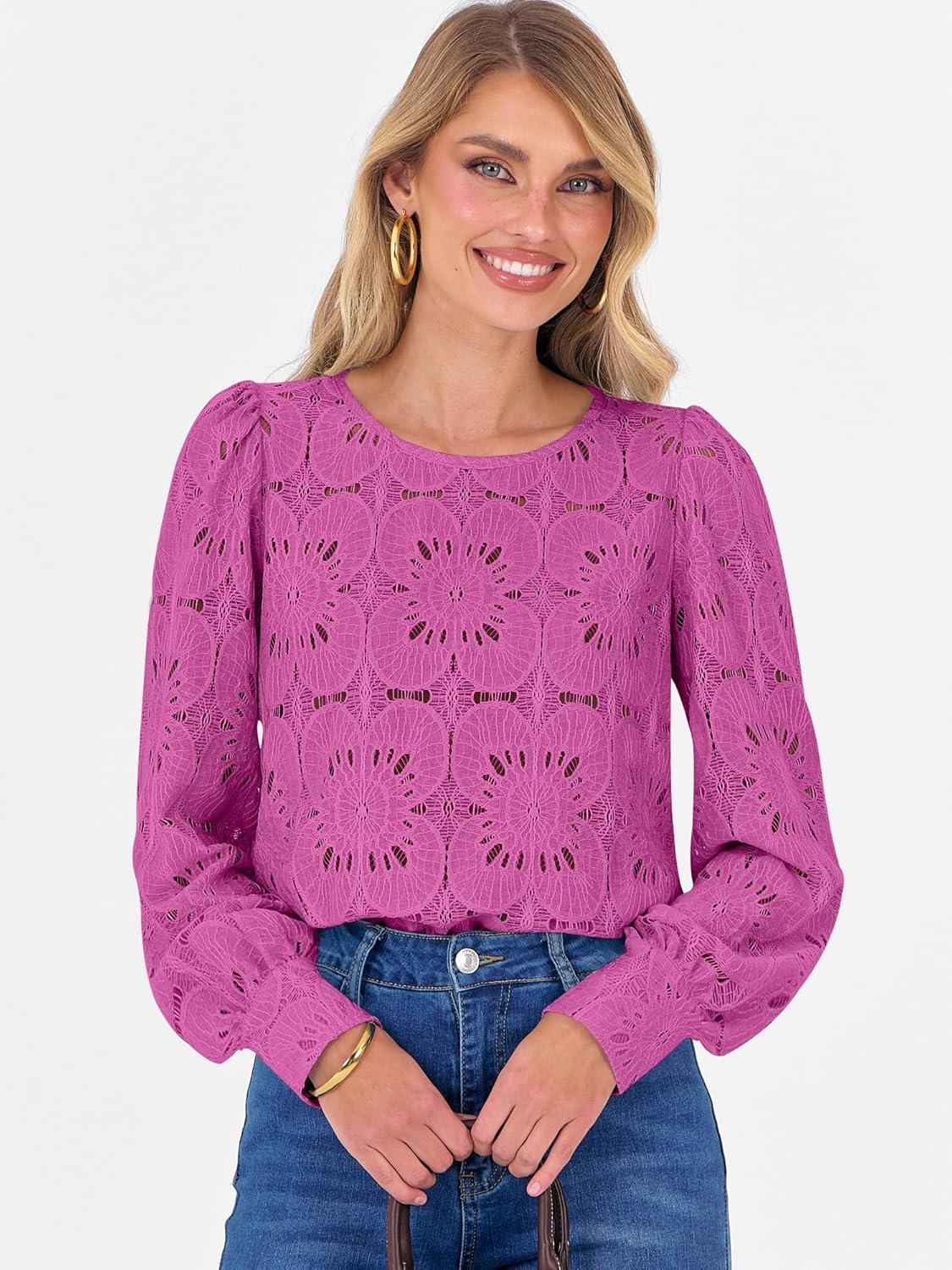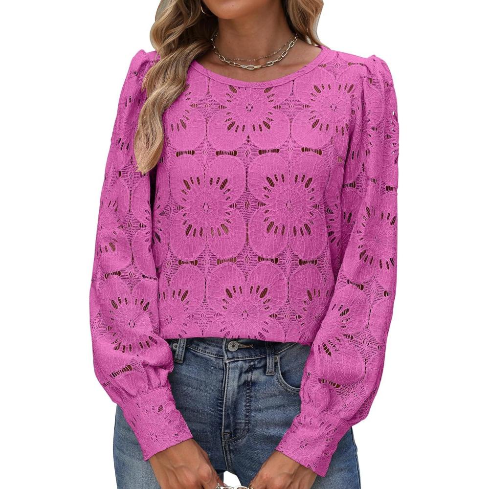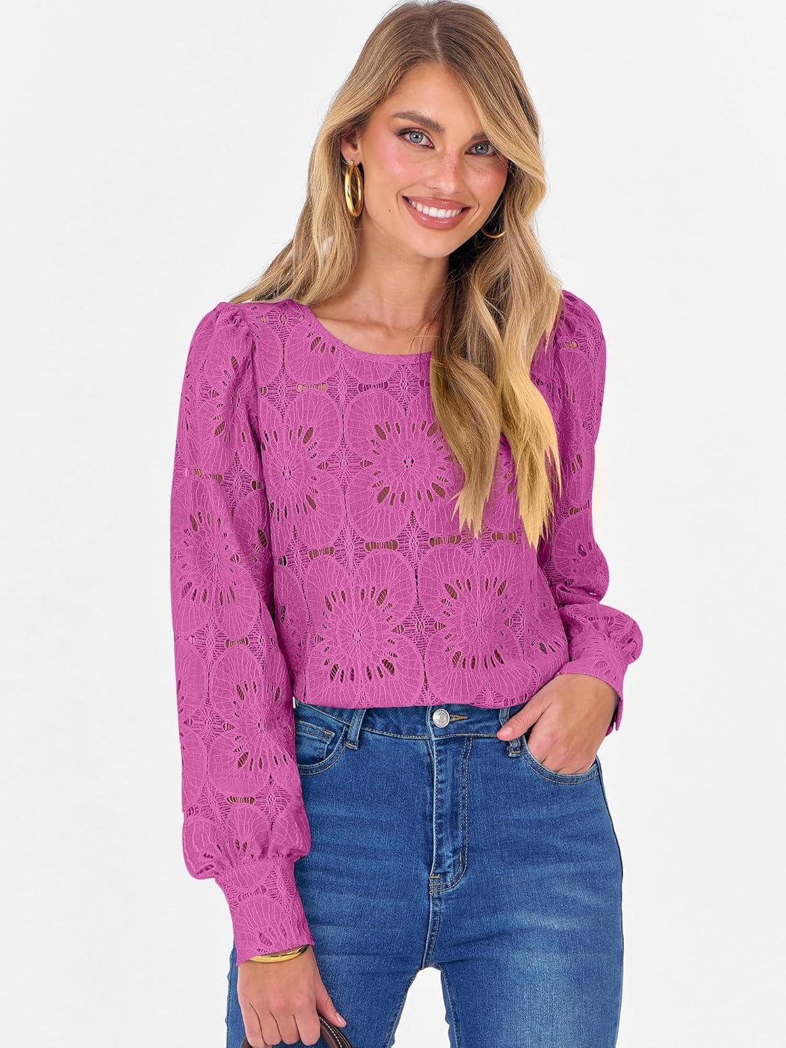 ANRABESS Womens Eyelet Long Sleeve Tops Business Casual Blouses Crochet Lace Shirts 2025 Fall Fashion Outfits(Hot Pink)