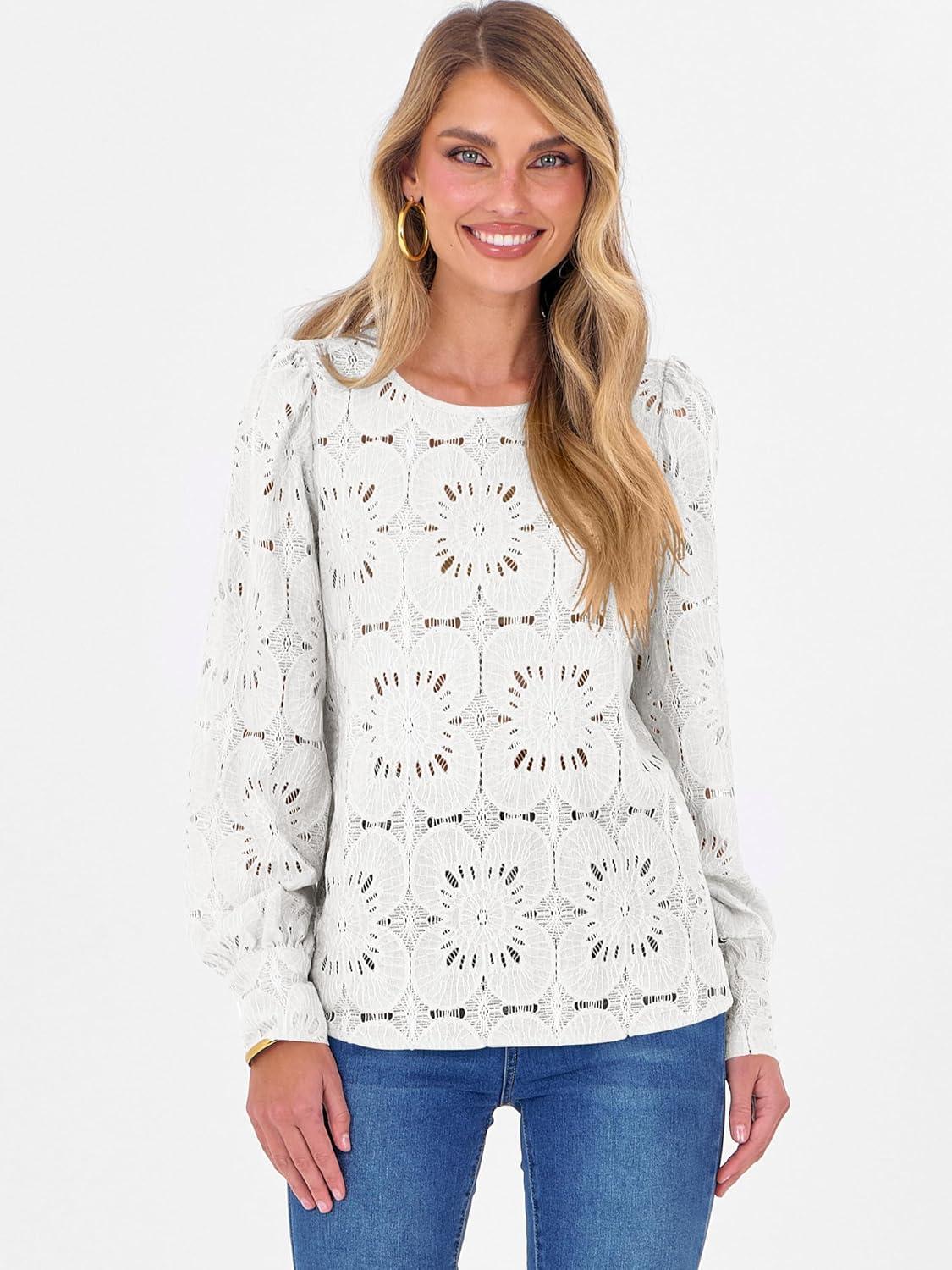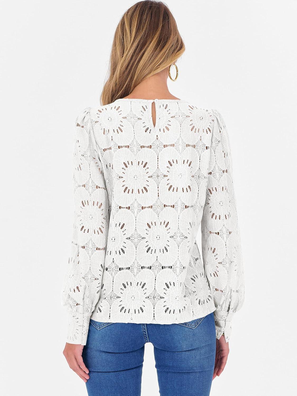 ANRABESS Womens Eyelet Long Sleeve Tops Business Casual Blouses Crochet Lace Shirts 2025 Fall Fashion Outfits(White)