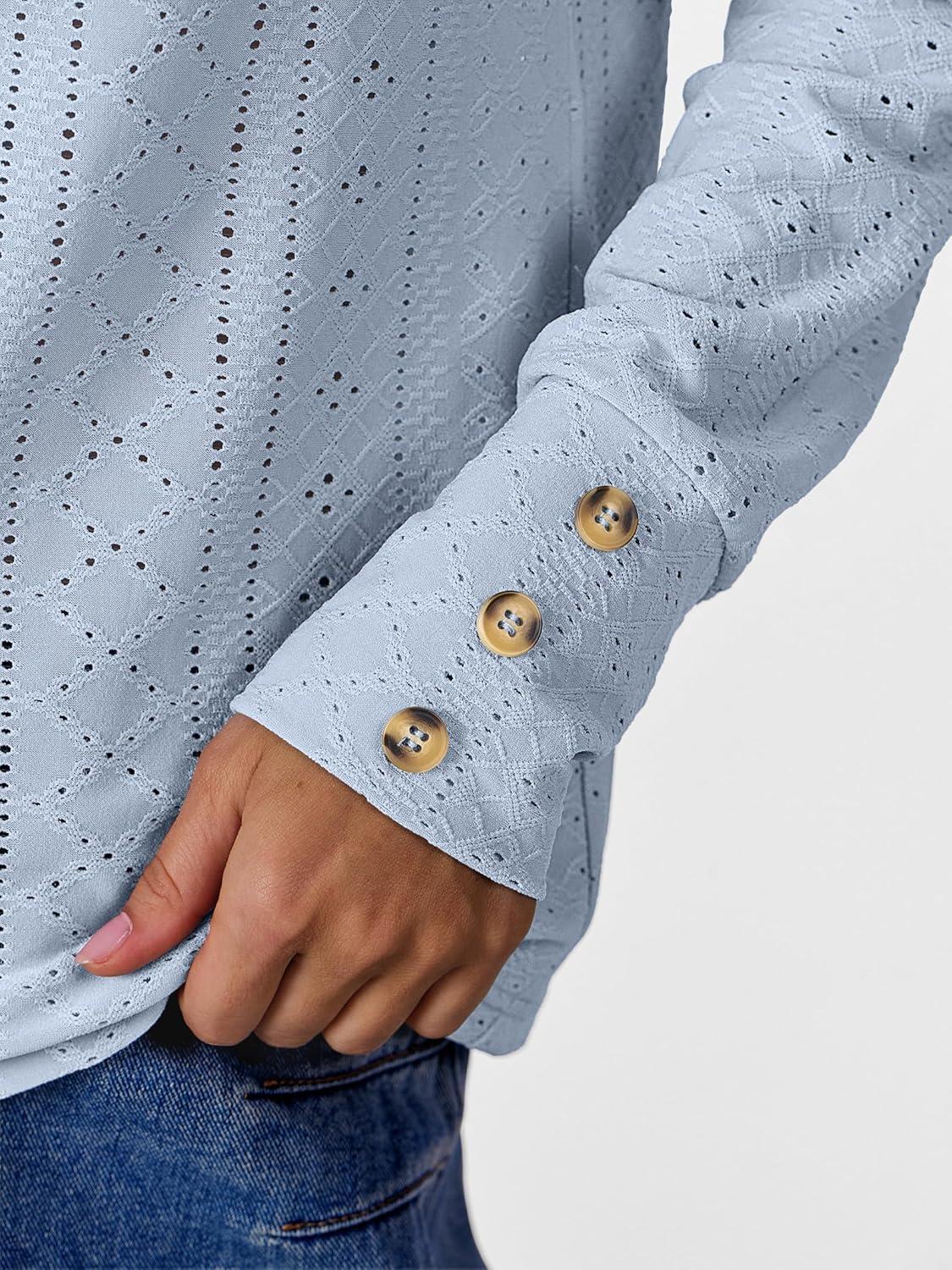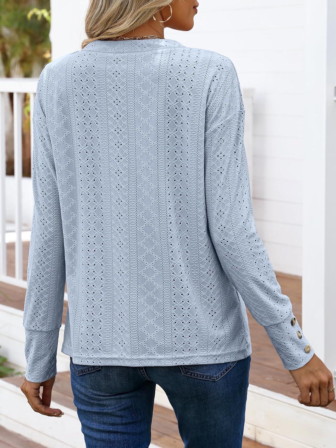 ANRABESS Womens Eyelet Tops Long Sleeve Henley Shirts Business Dressy Casual Blouse Vacation T-Shirt 2025 Fall Outfits(Light Blue)