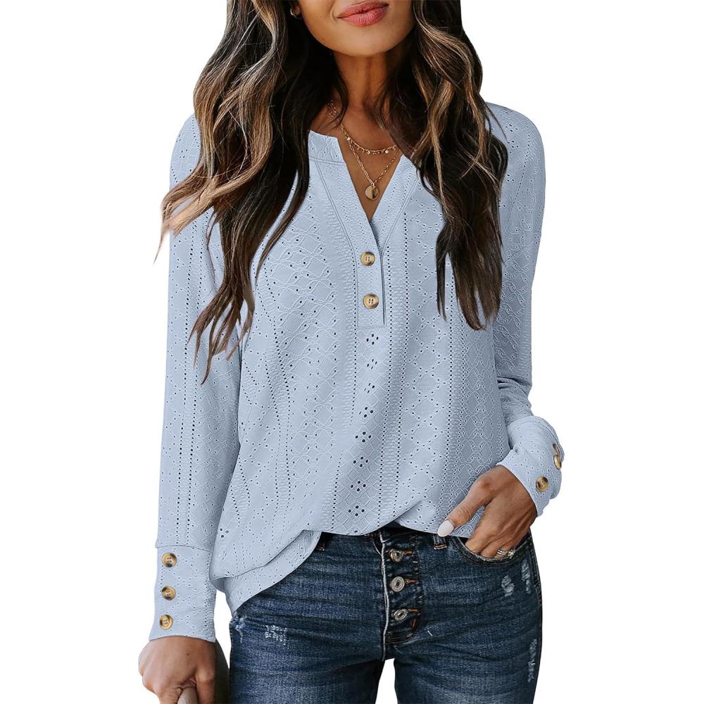 imageANRABESS Womens Eyelet Tops Long Sleeve Henley Shirts Business Dressy Casual Blouse Vacation TShirt 2025 Fall OutfitsLight Blue