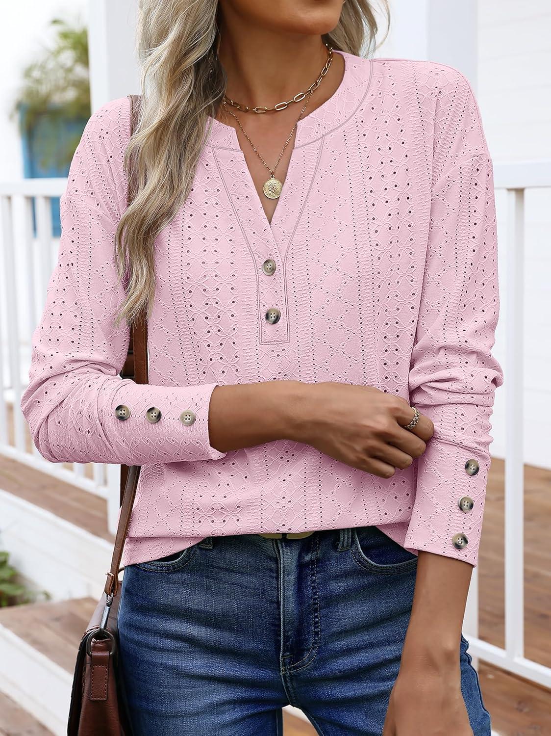 ANRABESS Womens Eyelet Tops Long Sleeve Henley Shirts Business Dressy Casual Blouse Vacation T-Shirt 2025 Fall Outfits(Light Pink)