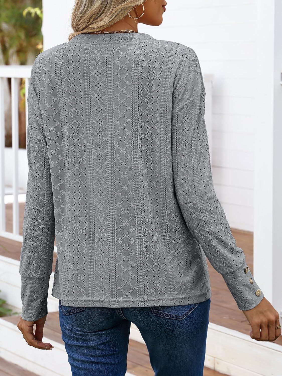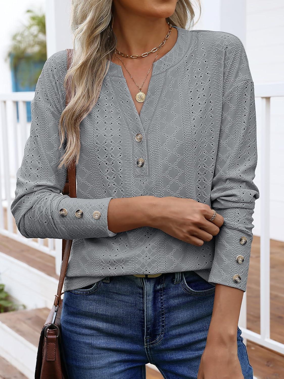 ANRABESS Womens Eyelet Tops Long Sleeve Henley Shirts Business Dressy Casual Blouse Vacation T-Shirt 2025 Fall Outfits(Silver Grey)