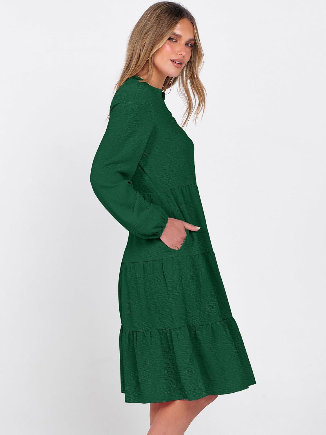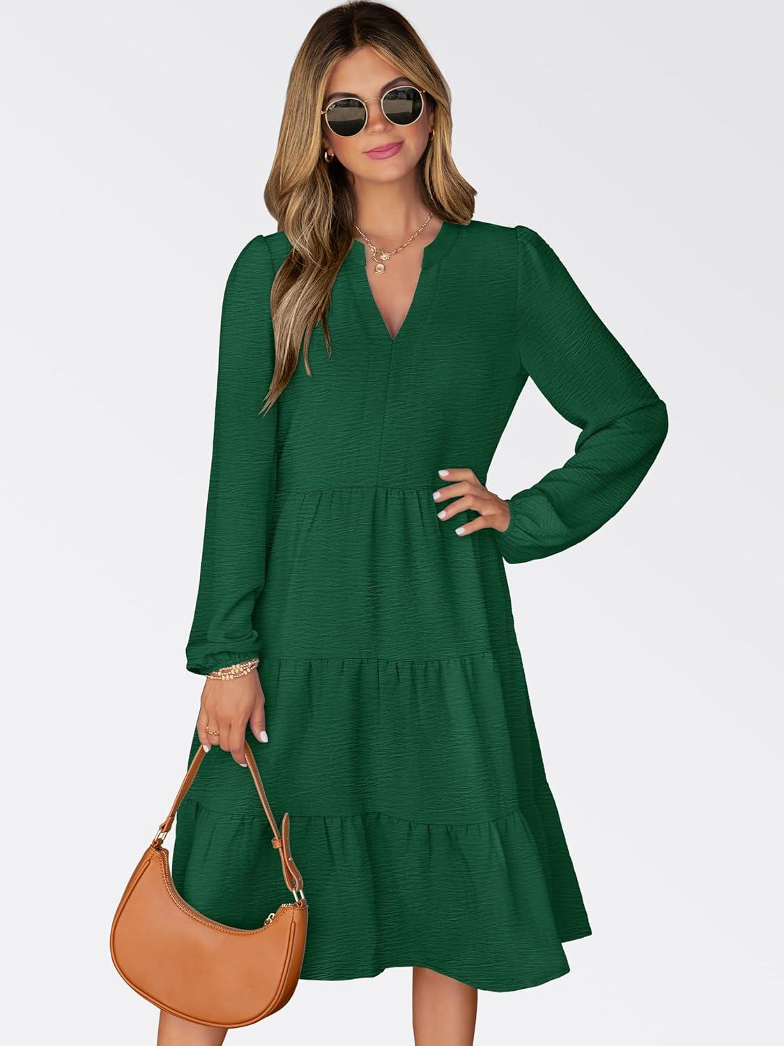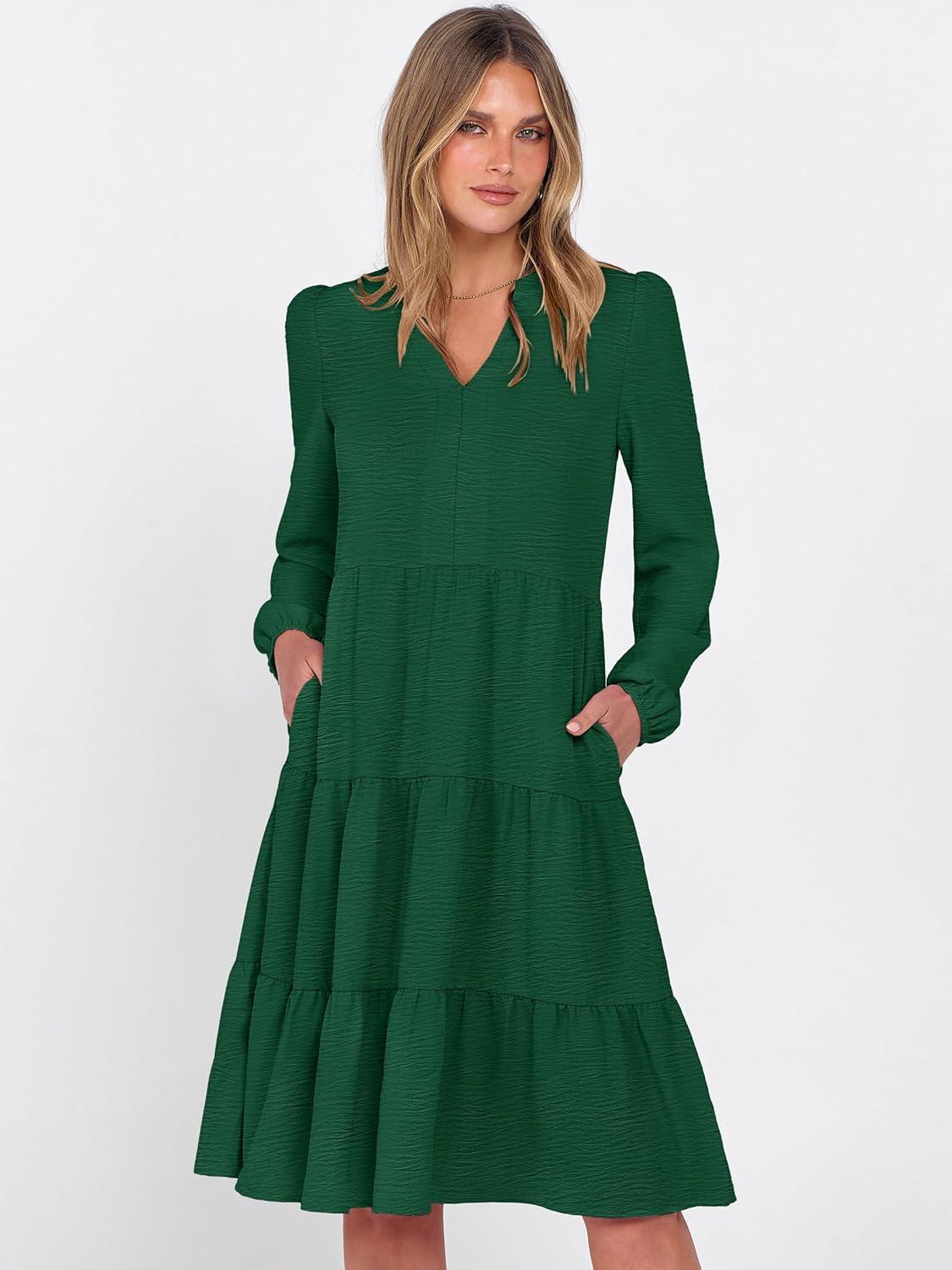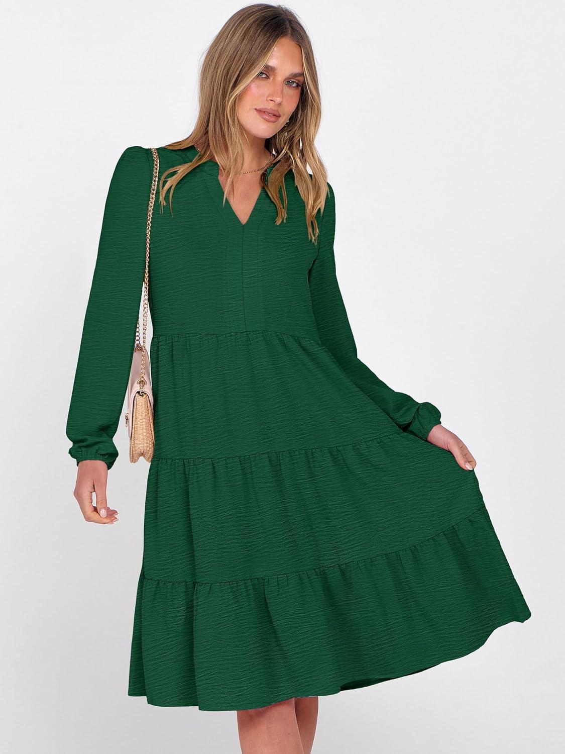 ANRABESS Womens Fall Midi Dresses Long Sleeve V Neck Swing Tiered Work Business Casual 2025 Flowy Beach Vacation Dress(Forest Green)