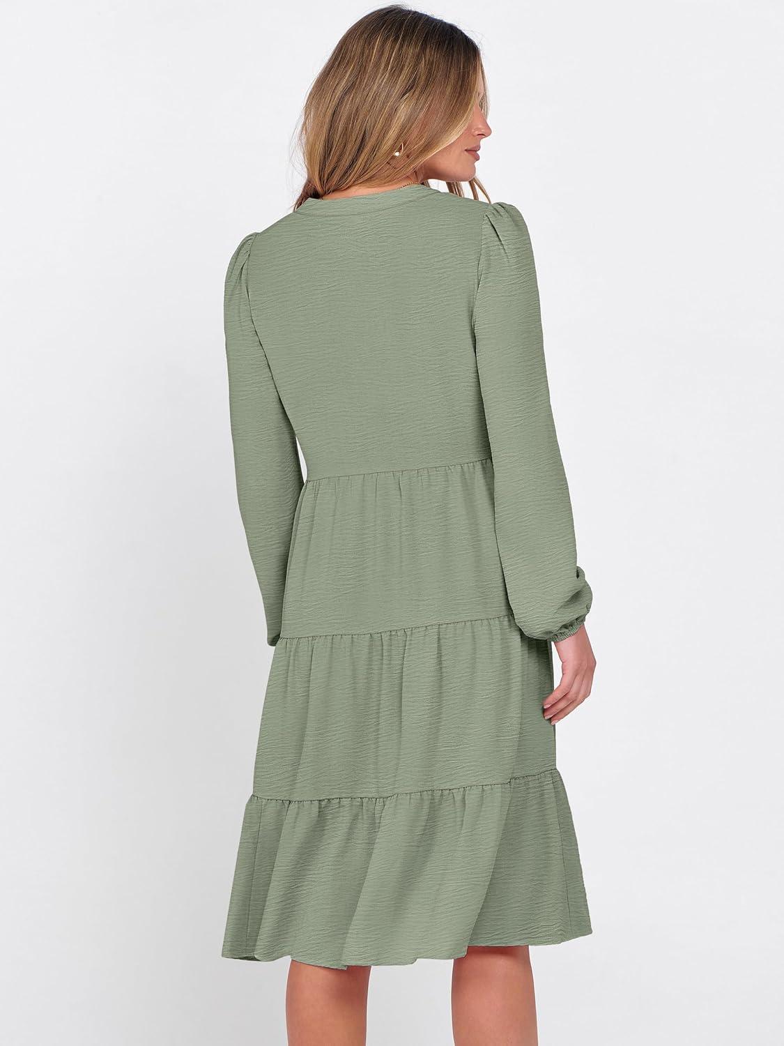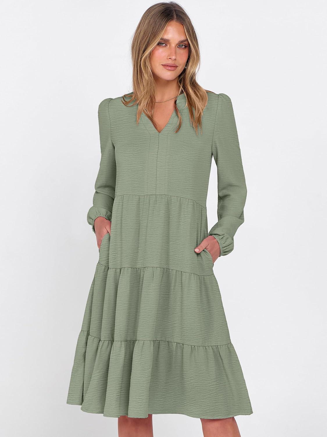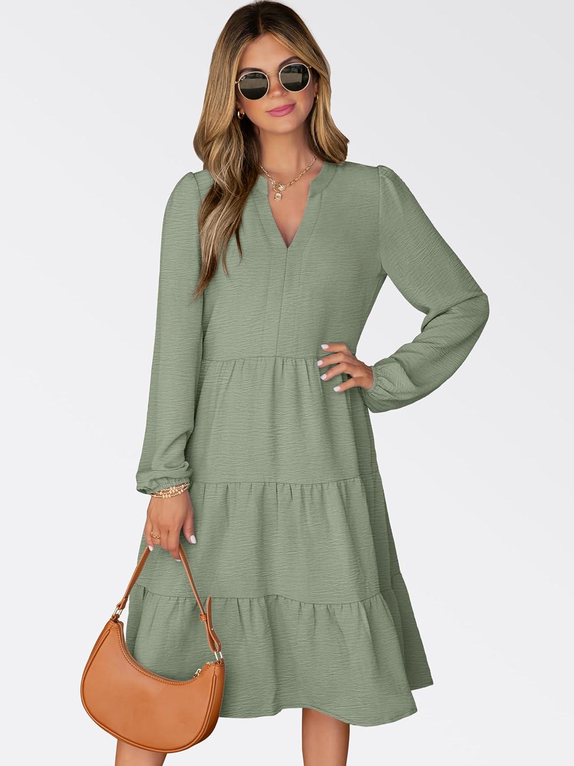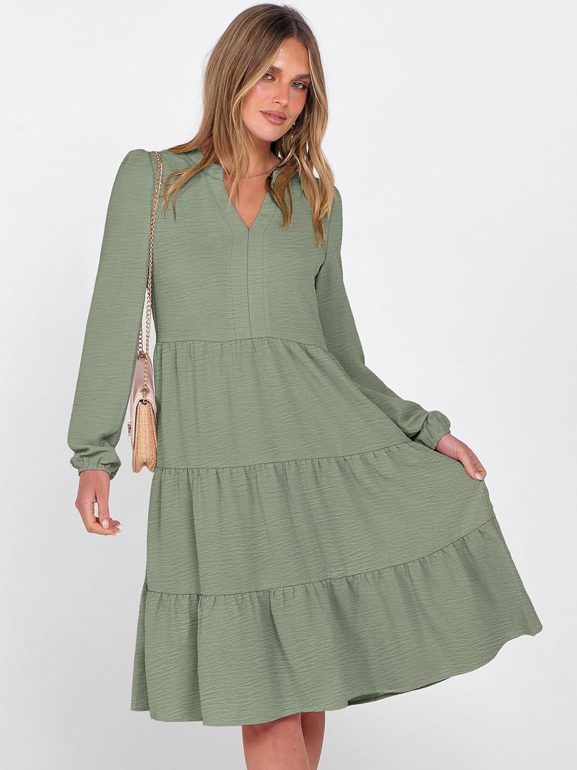 imageANRABESS Womens Fall Midi Dresses Long Sleeve V Neck Swing Tiered Work Business Casual 2025 Flowy Beach Vacation DressLight Green
