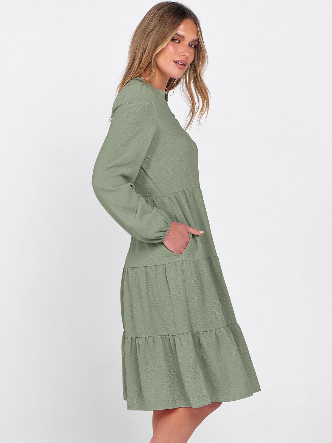 ANRABESS Womens Fall Midi Dresses Long Sleeve V Neck Swing Tiered Work Business Casual 2025 Flowy Beach Vacation Dress(Light Green)