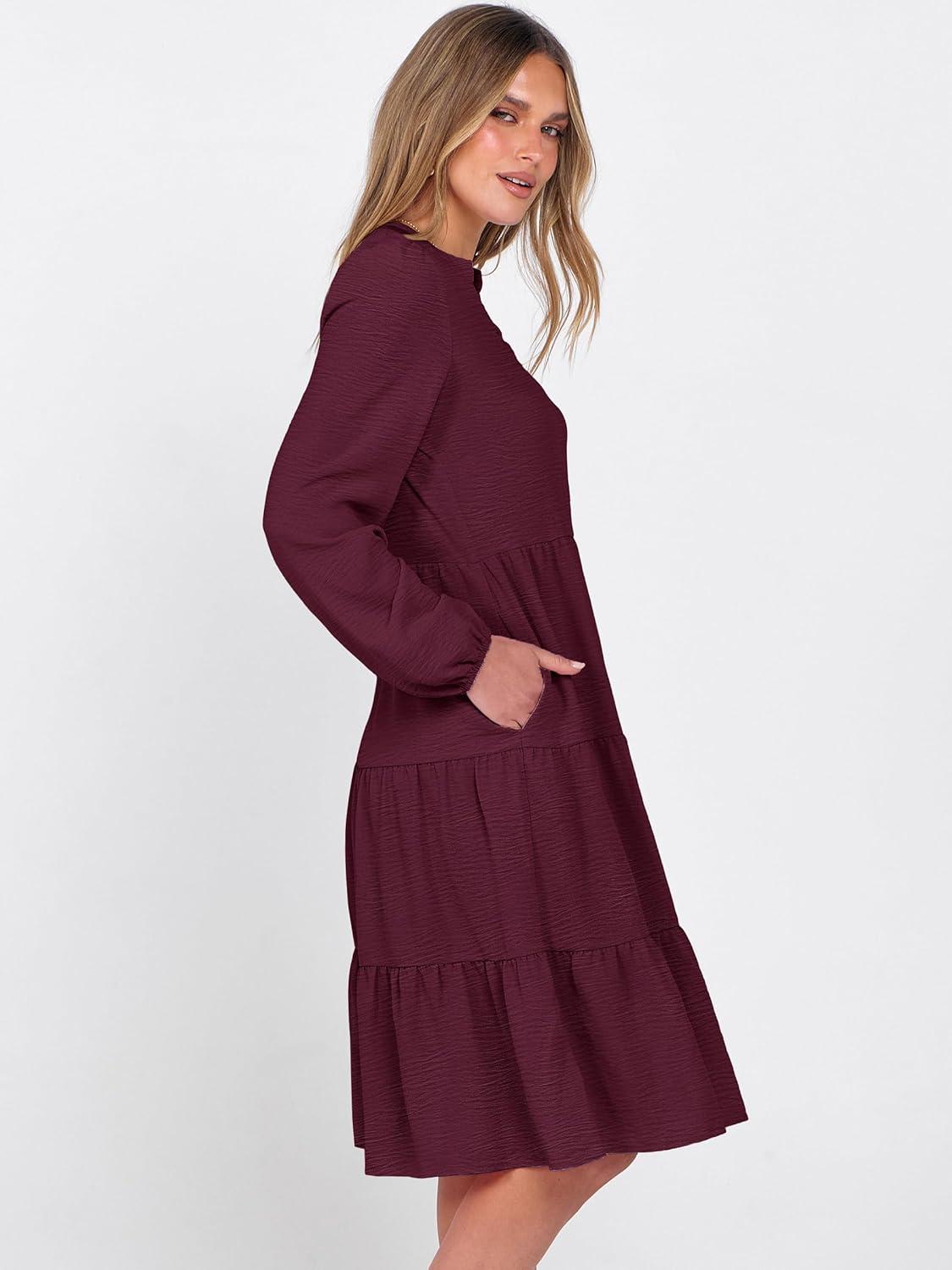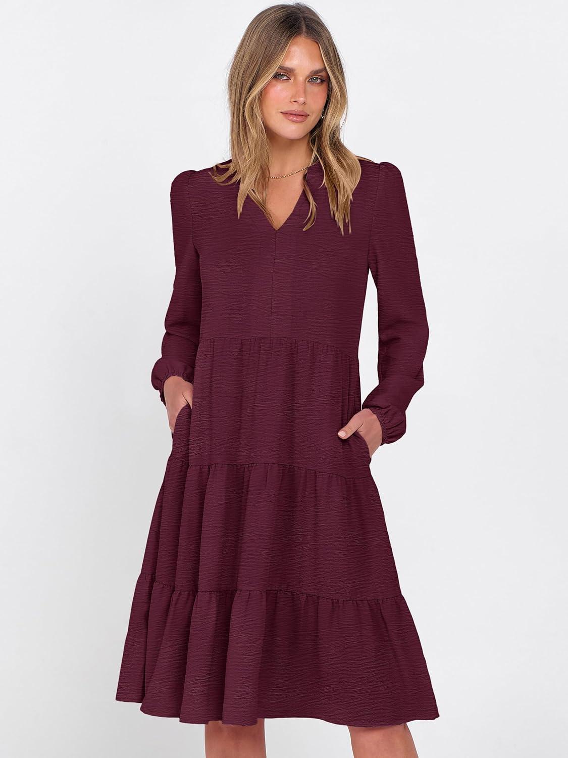 ANRABESS Womens Fall Midi Dresses Long Sleeve V Neck Swing Tiered Work Business Casual 2025 Flowy Beach Vacation Dress(Wine Red)