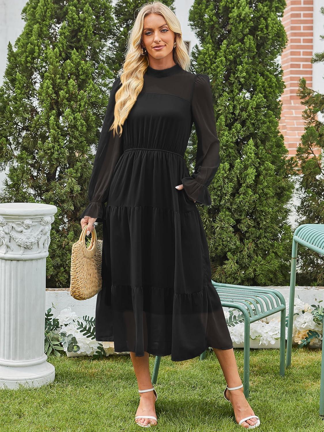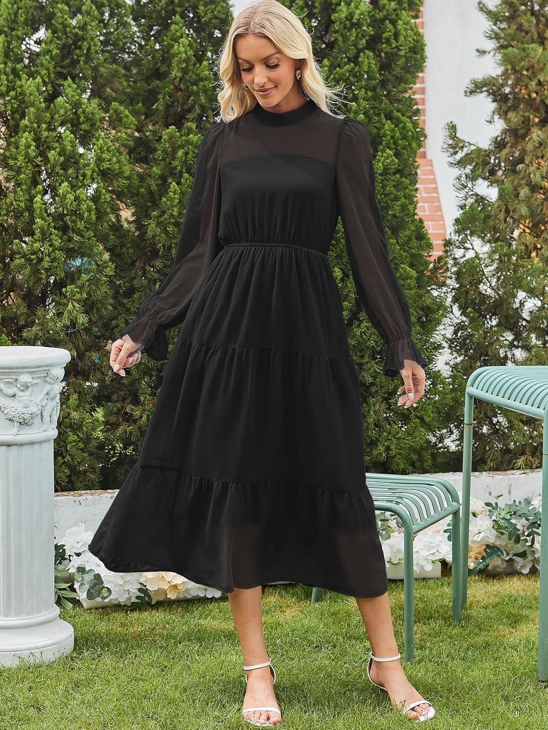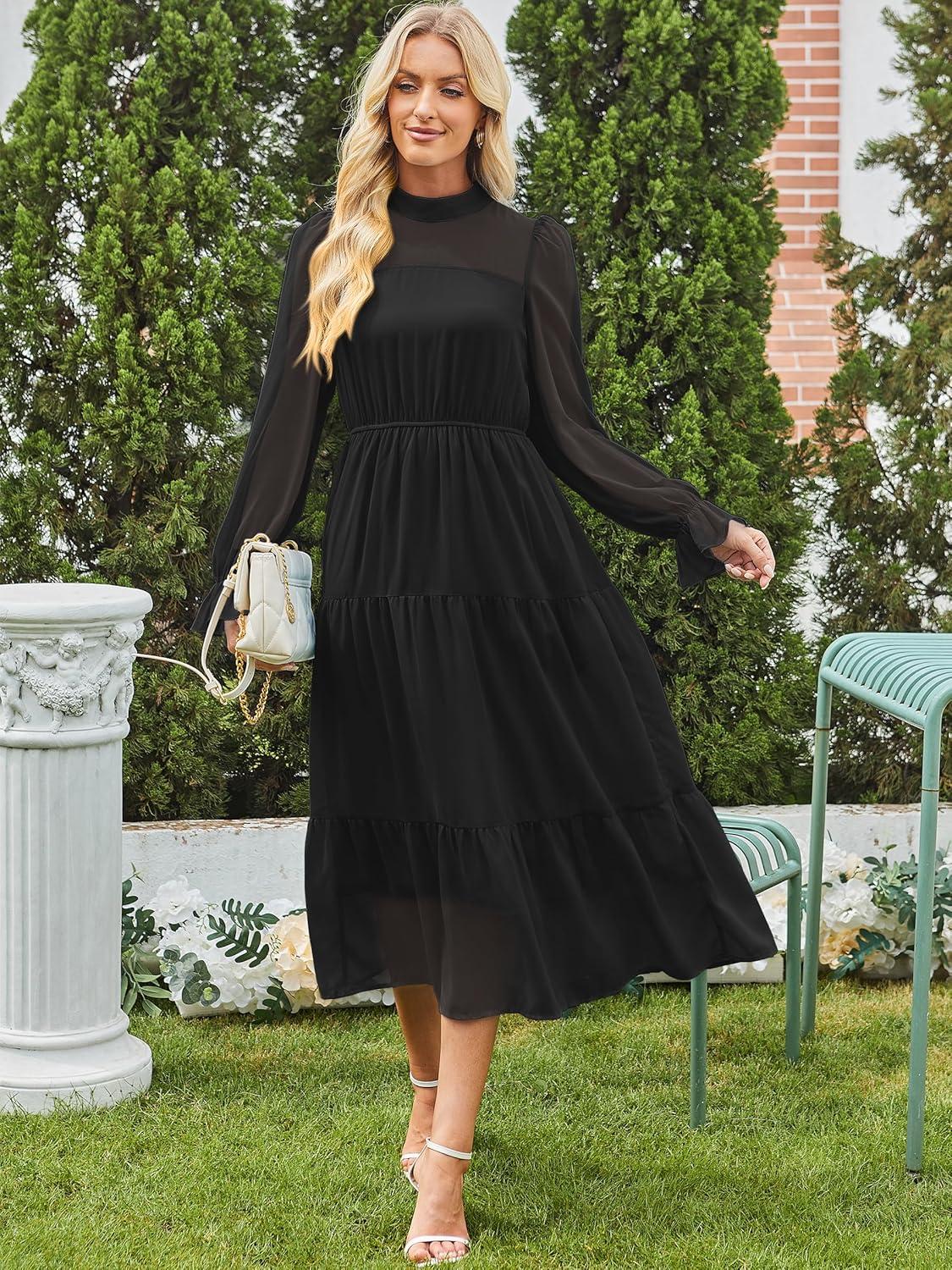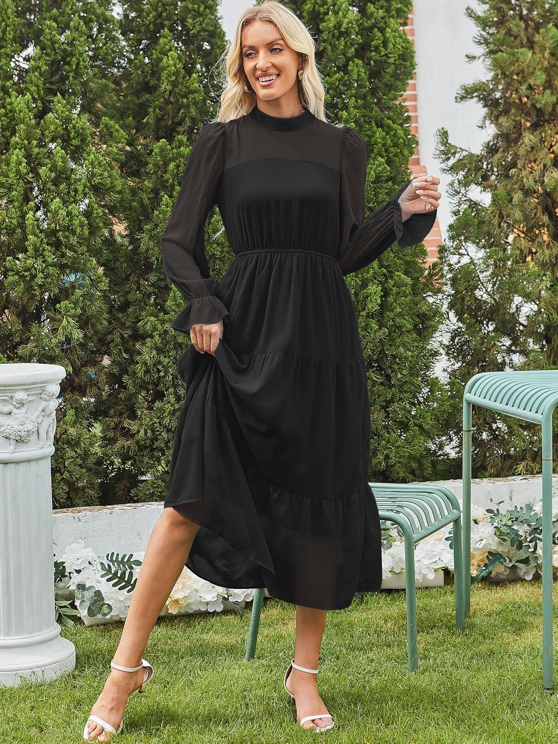 ANRABESS Womens Fall Vacation Guest Dress 2025 Long Sleeve Mock Neck Mesh Floral Boho Flowy Casual Tea Party Midi Dresses(Black)