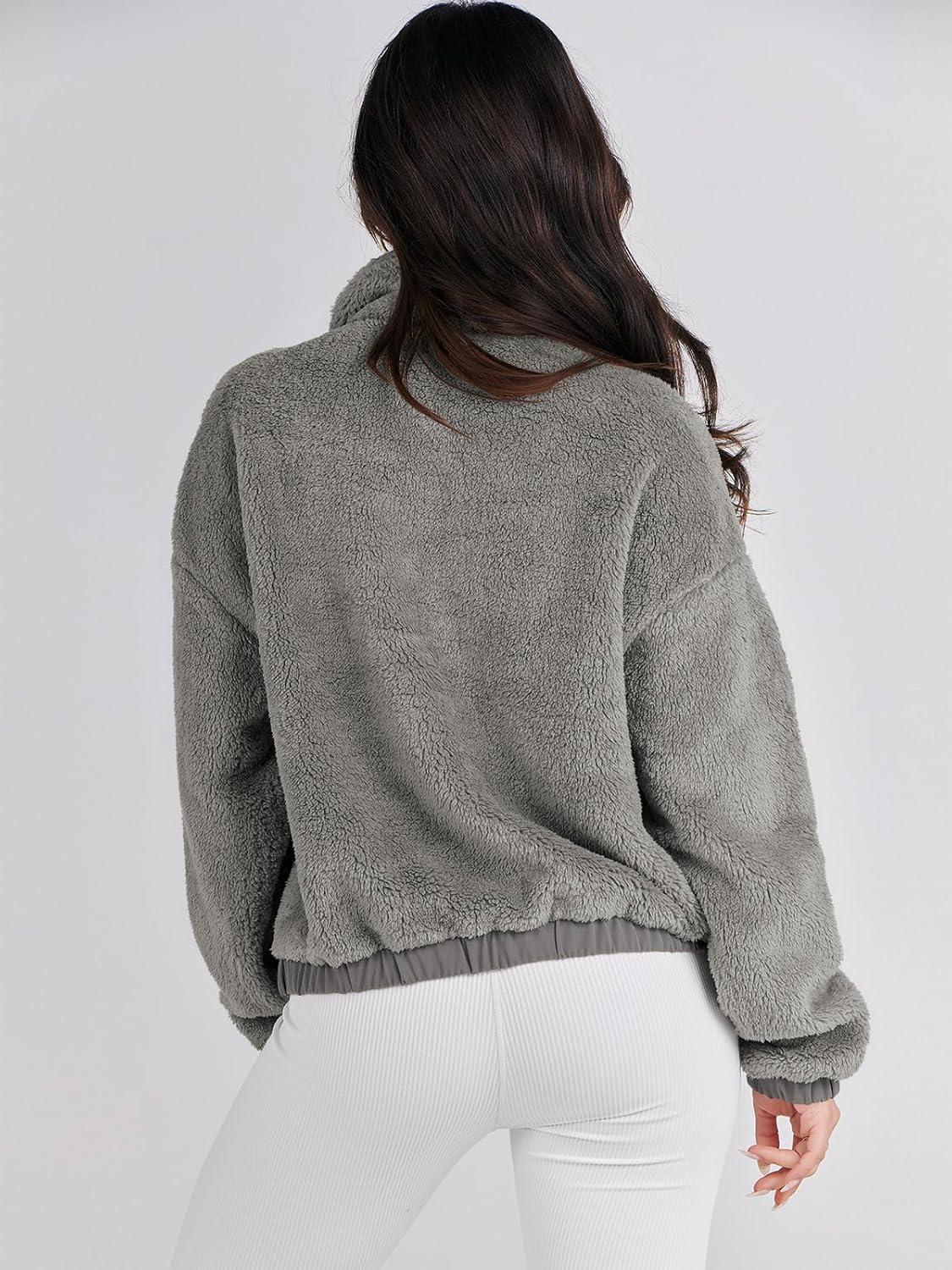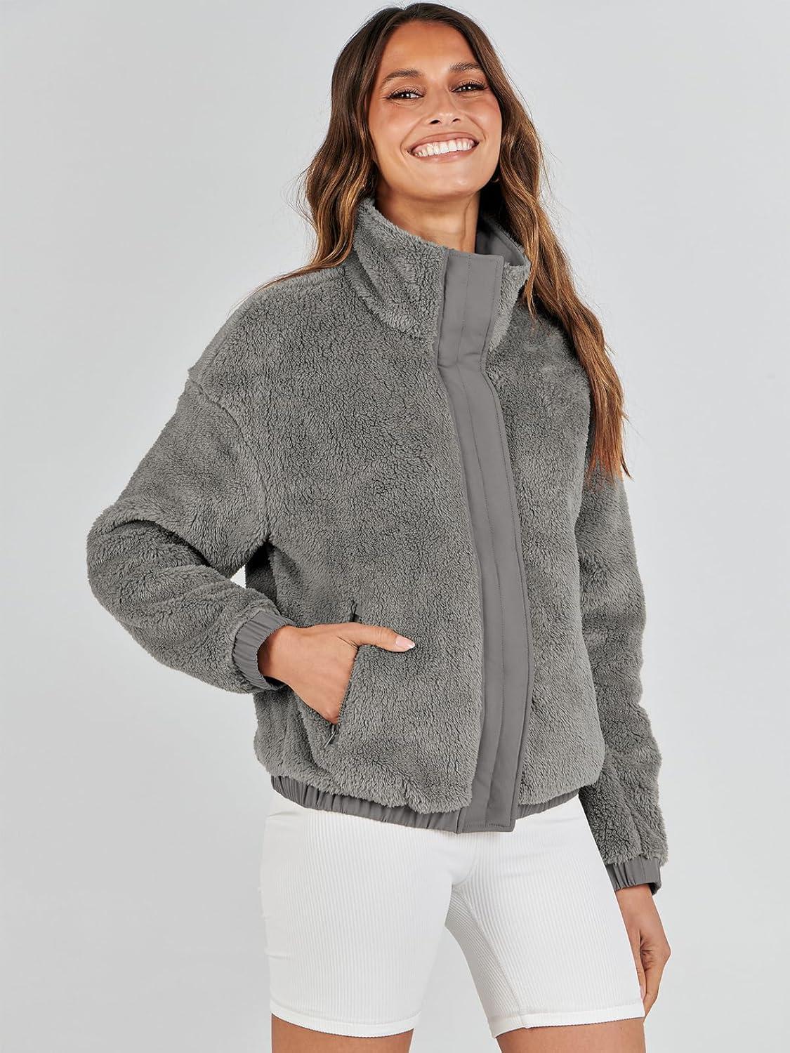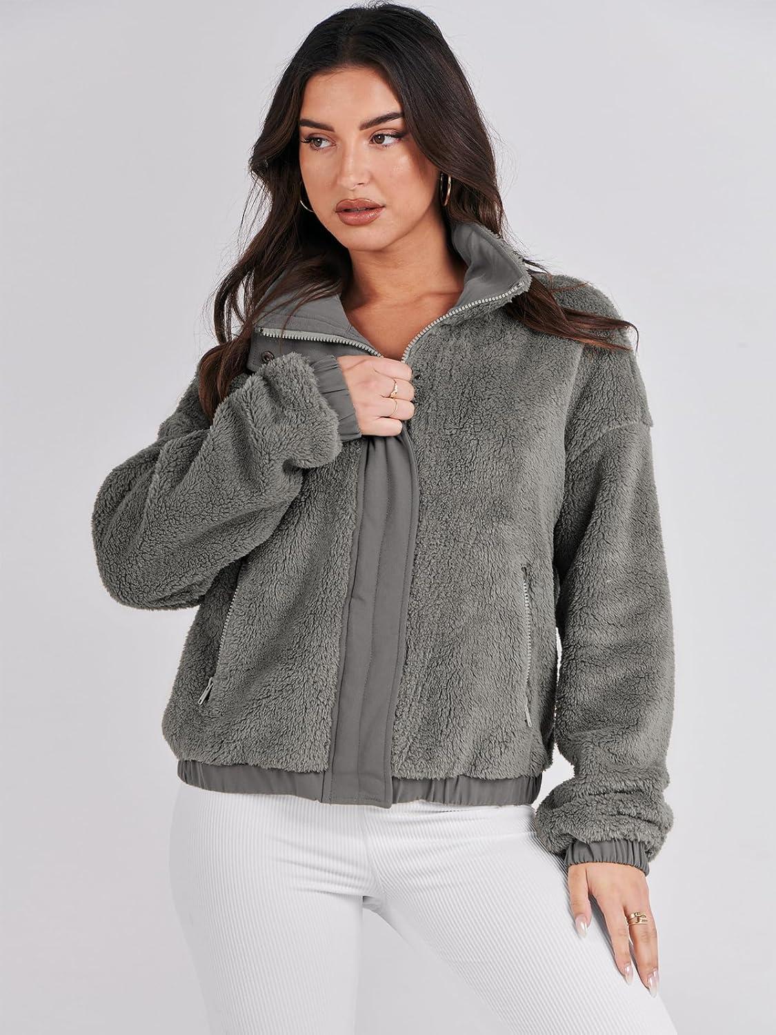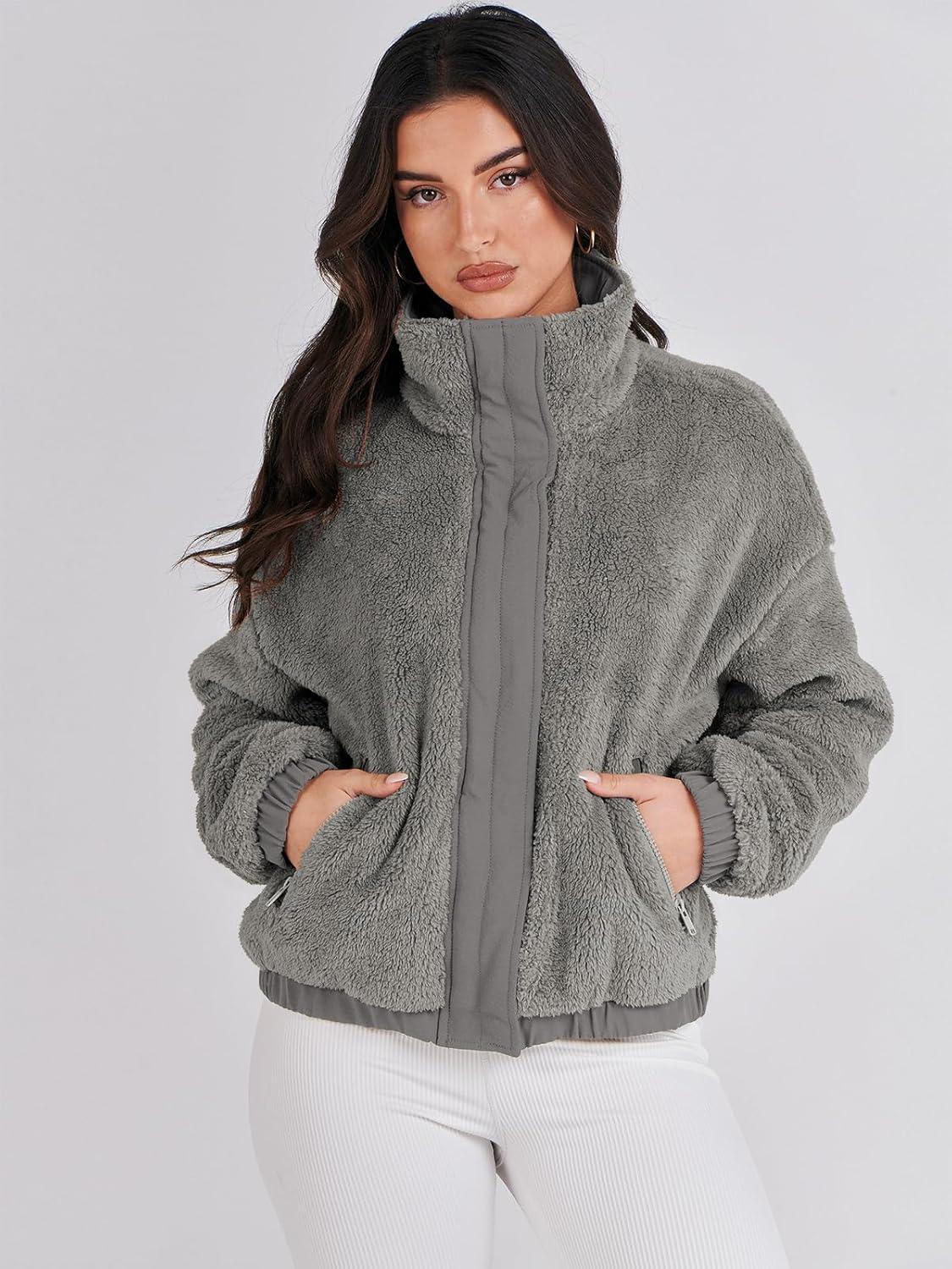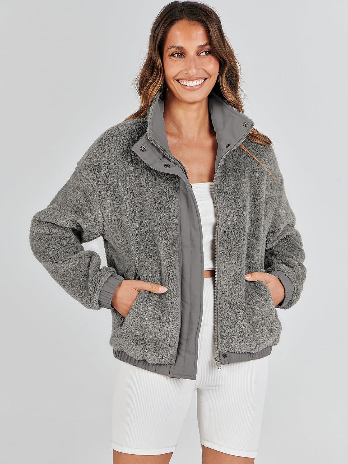 ANRABESS Womens Fleece Jacket Casual Long Sleeve Cropped Sherpa Button Down Fuzzy Warm Coats Fall Outwear With Pockets(Grey 2)