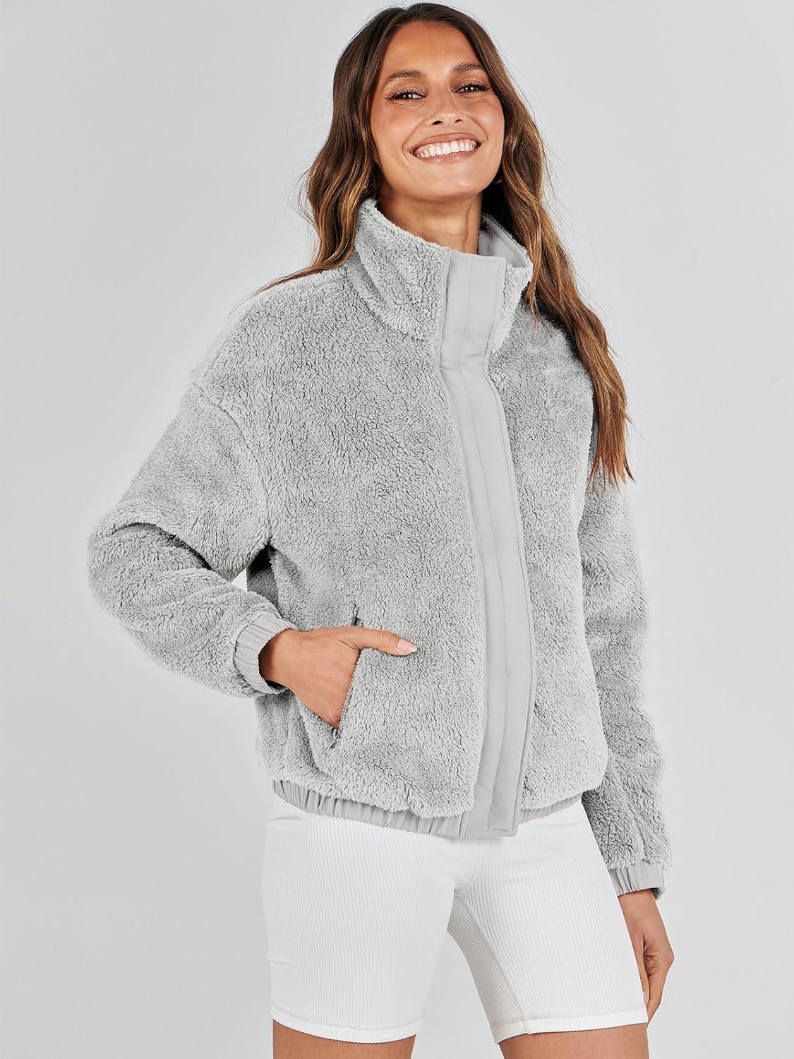 ANRABESS Womens Fleece Jacket Casual Long Sleeve Cropped Sherpa Button Down Fuzzy Warm Coats Fall Outwear With Pockets(Light Grey)