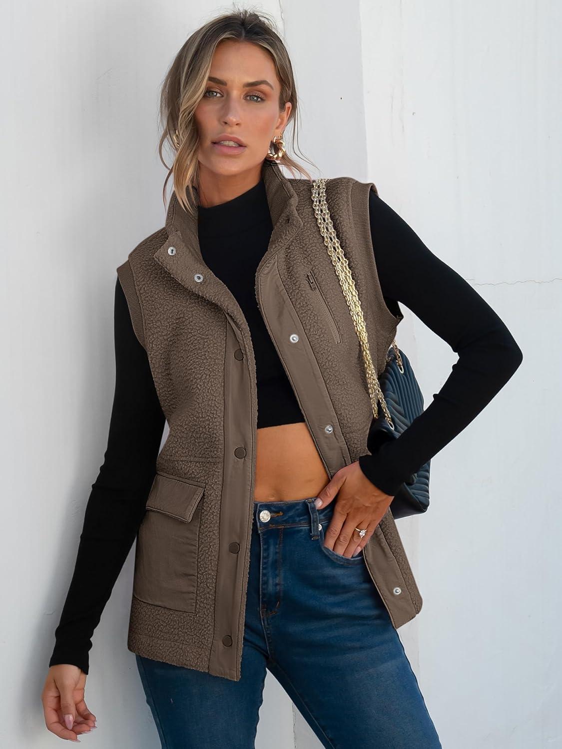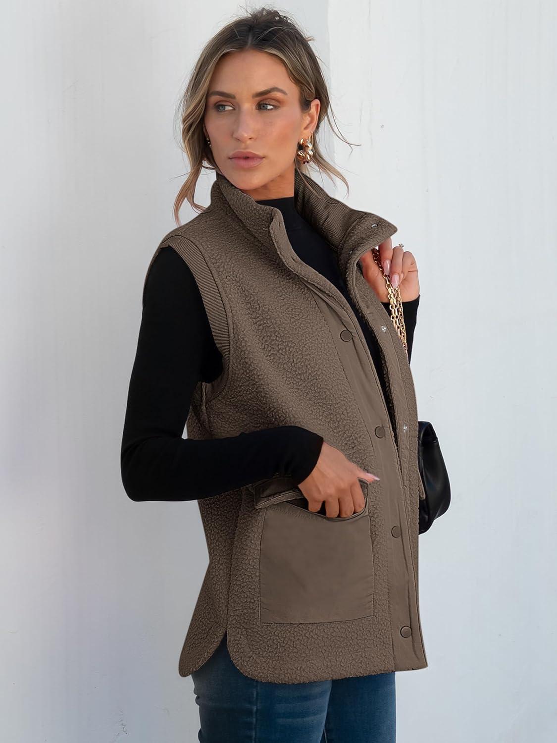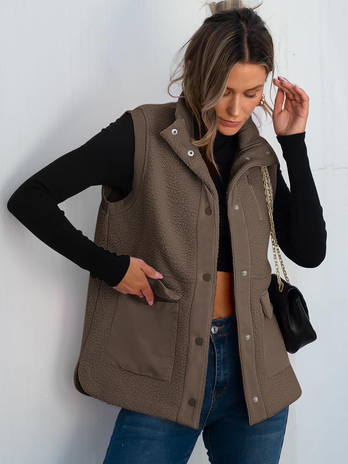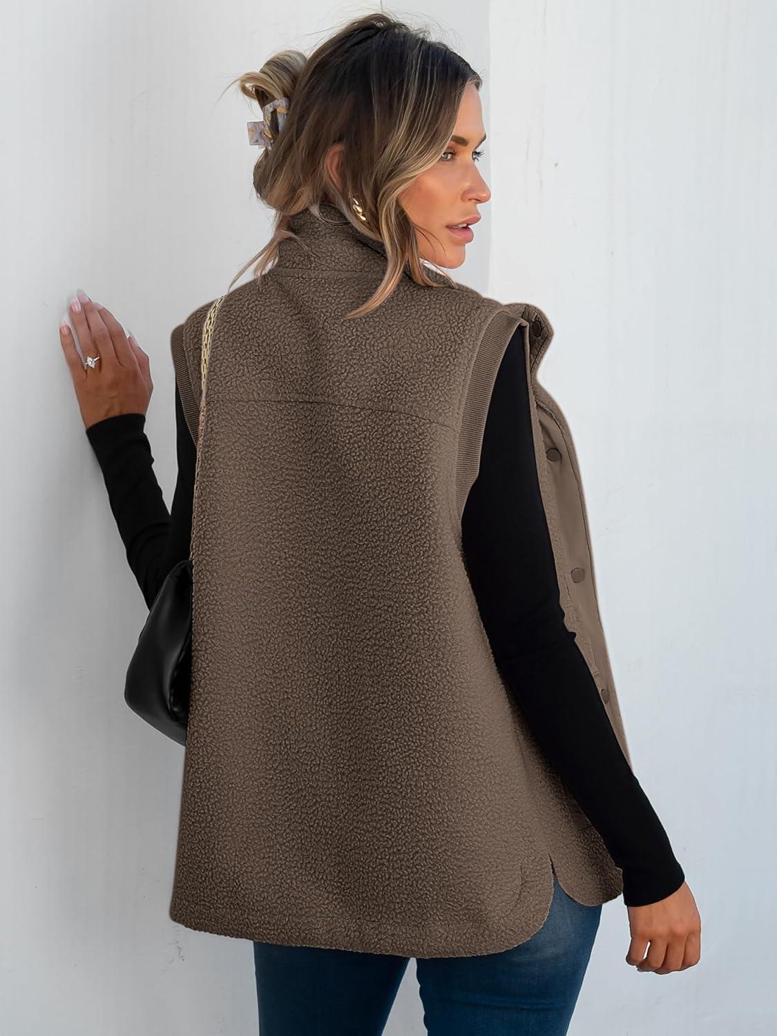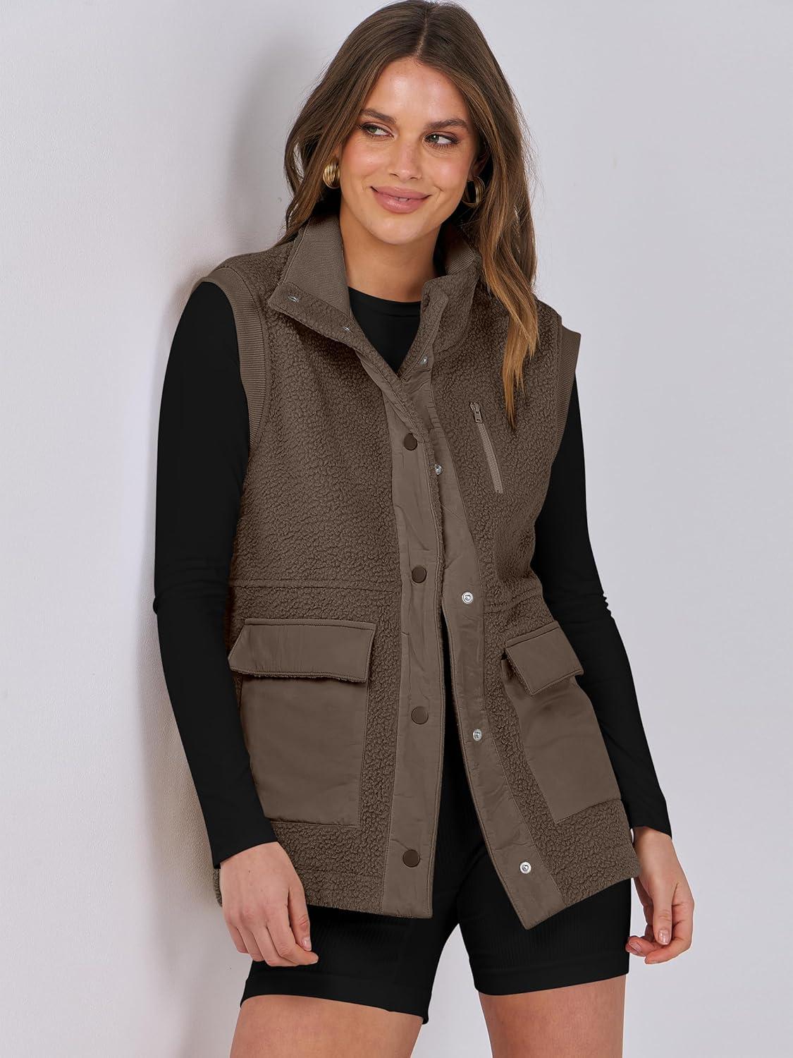 ANRABESS Womens Fleece Vest Loose Warm Button Down Fall Fuzzy Sherpa Jackets Fuzzy Vest With Pockets Winter Outerwear(Coffee)