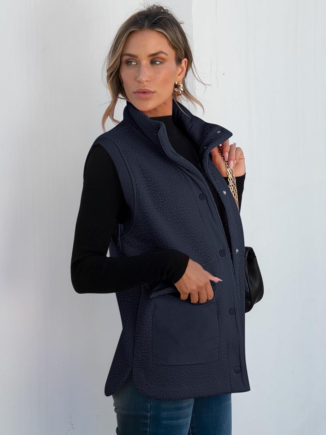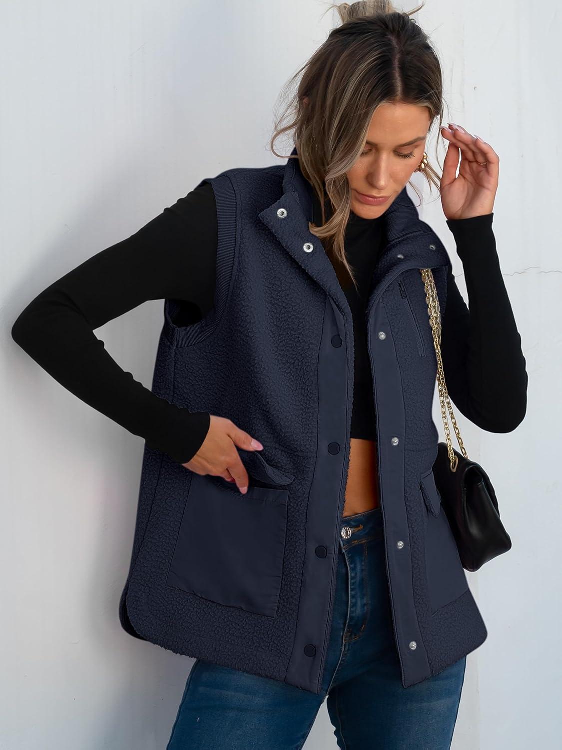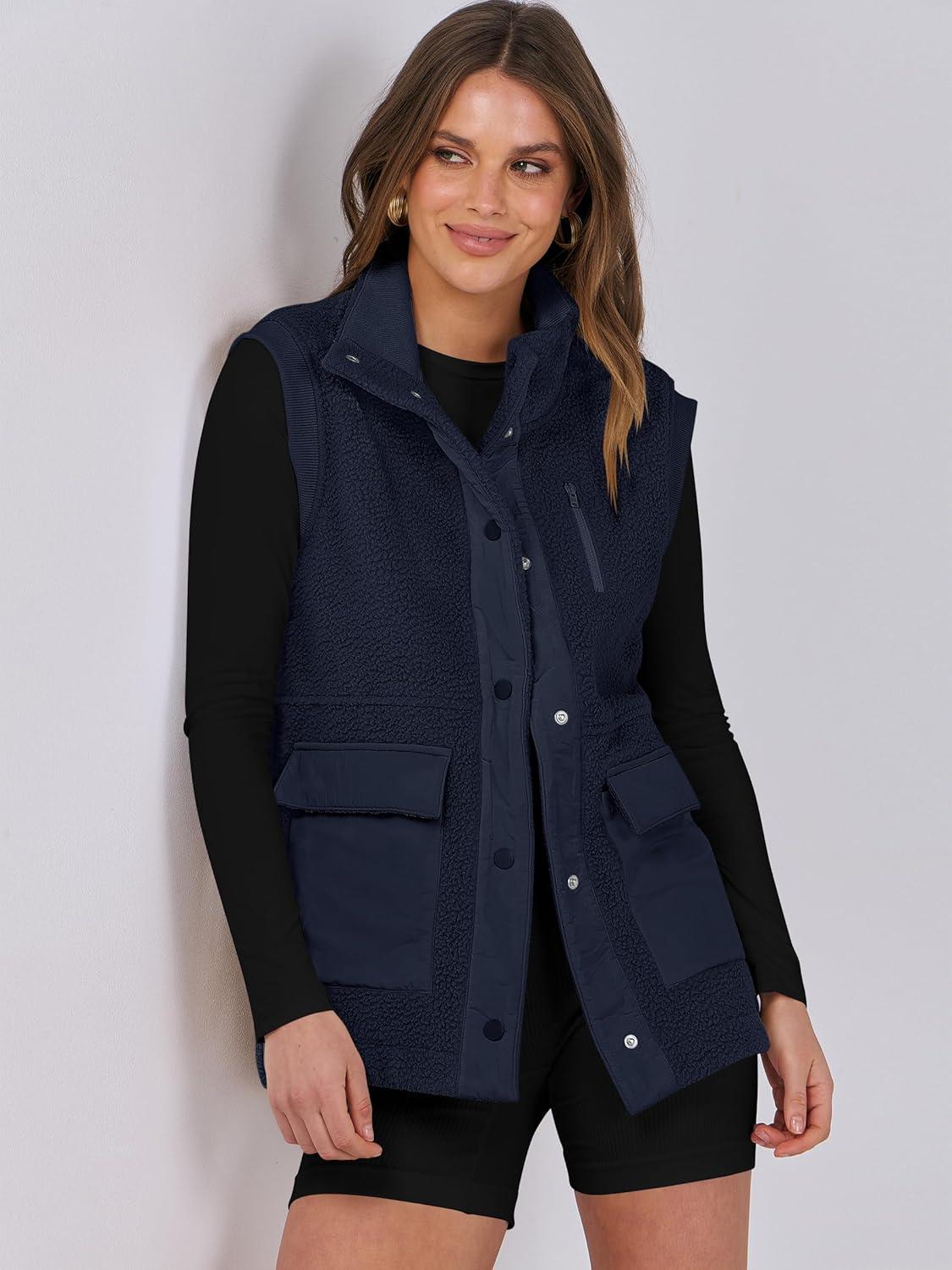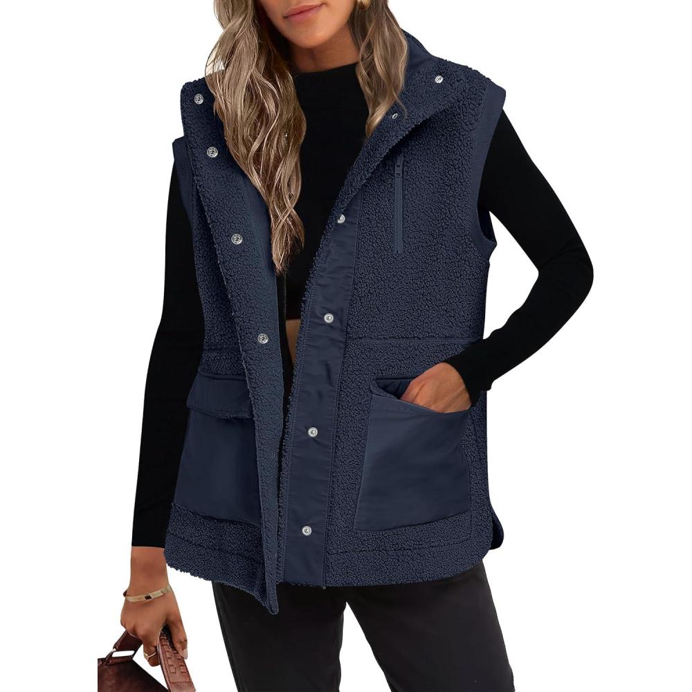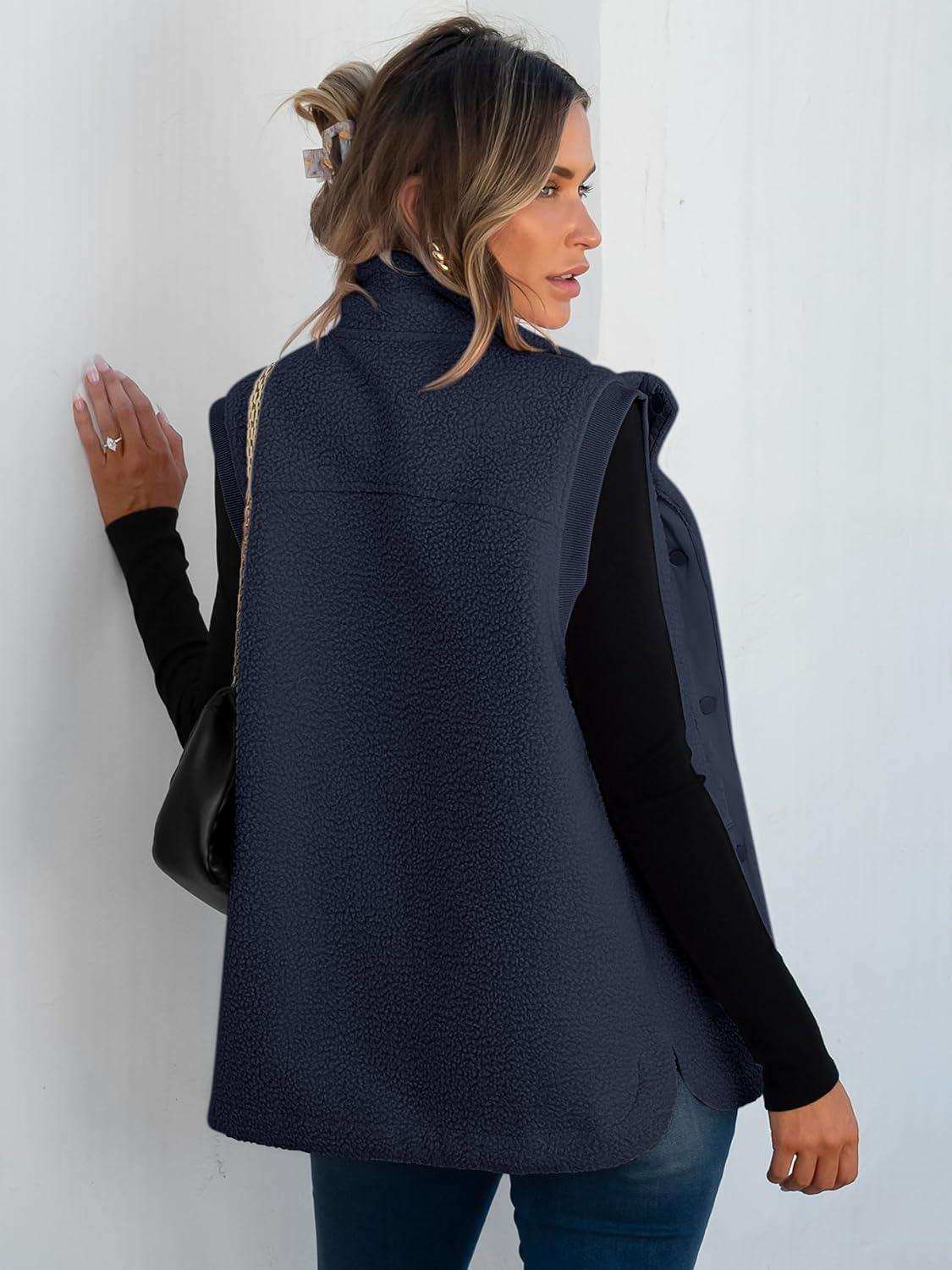 ANRABESS Womens Fleece Vest Loose Warm Button Down Fall Fuzzy Sherpa Jackets Fuzzy Vest With Pockets Winter Outerwear(Navy Blue)