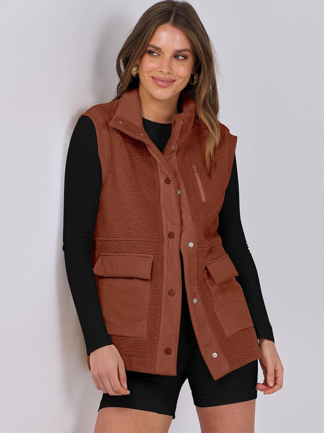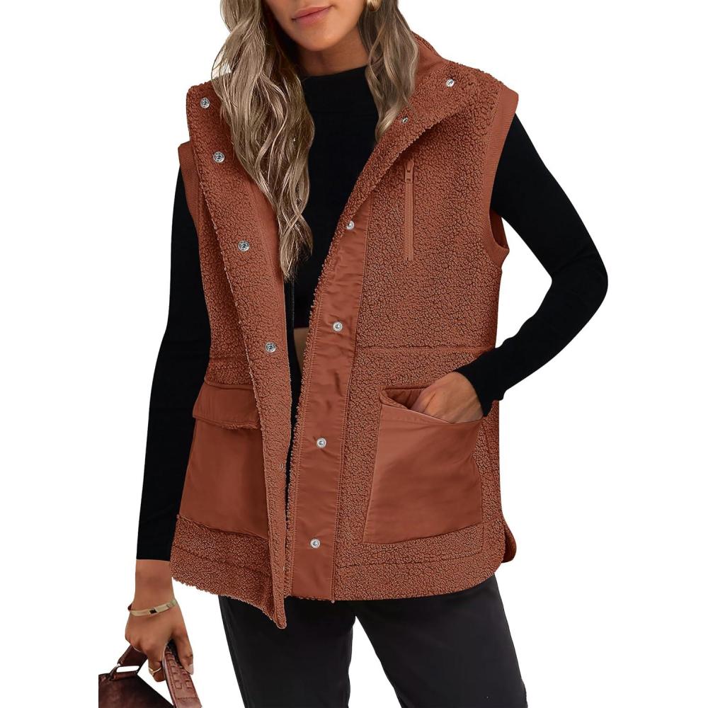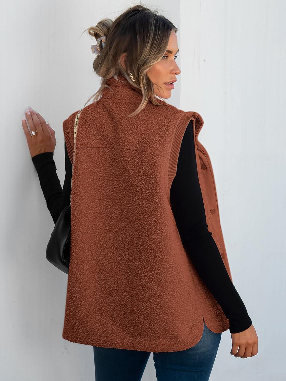ANRABESS Womens Fleece Vest Loose Warm Button Down Fall Fuzzy Sherpa Jackets Fuzzy Vest With Pockets Winter Outerwear(Rust Orange)