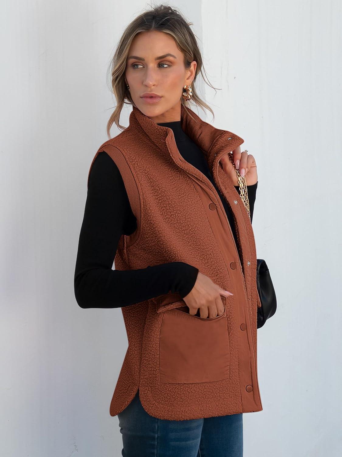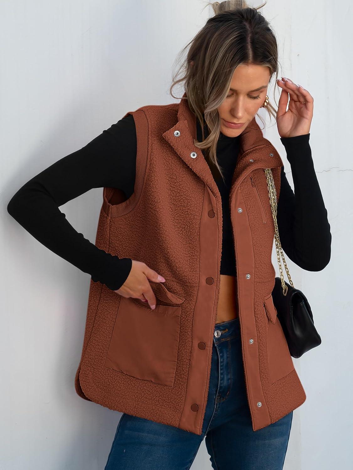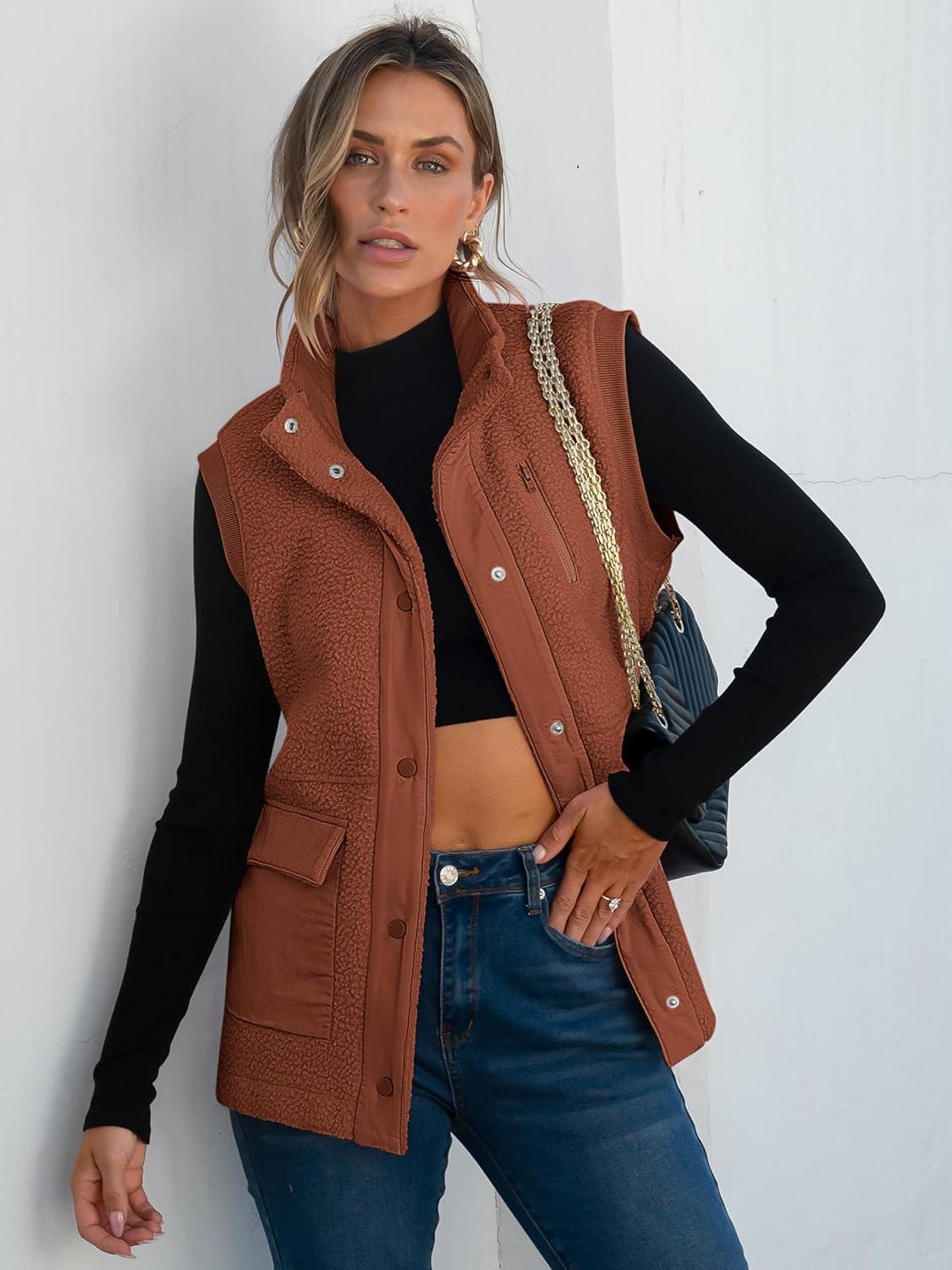 ANRABESS Womens Fleece Vest Loose Warm Button Down Fall Fuzzy Sherpa Jackets Fuzzy Vest With Pockets Winter Outerwear(Rust Orange)