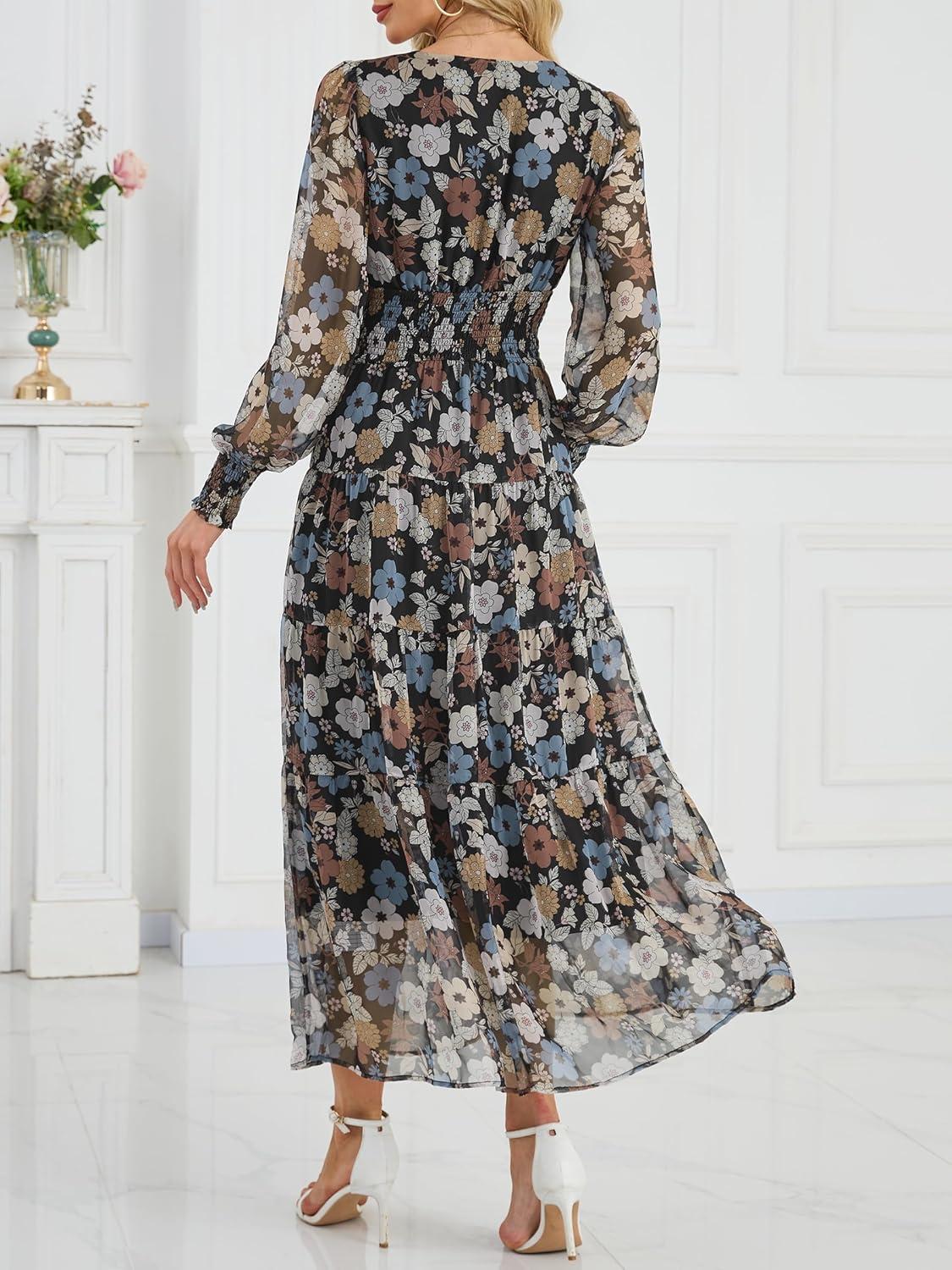 ANRABESS Womens Floral Long Sleeve Maxi Dress V Neck Chiffon Flowy Boho A-Line 2025 Fall Wedding Guest Party Wrap Dresses(Black)