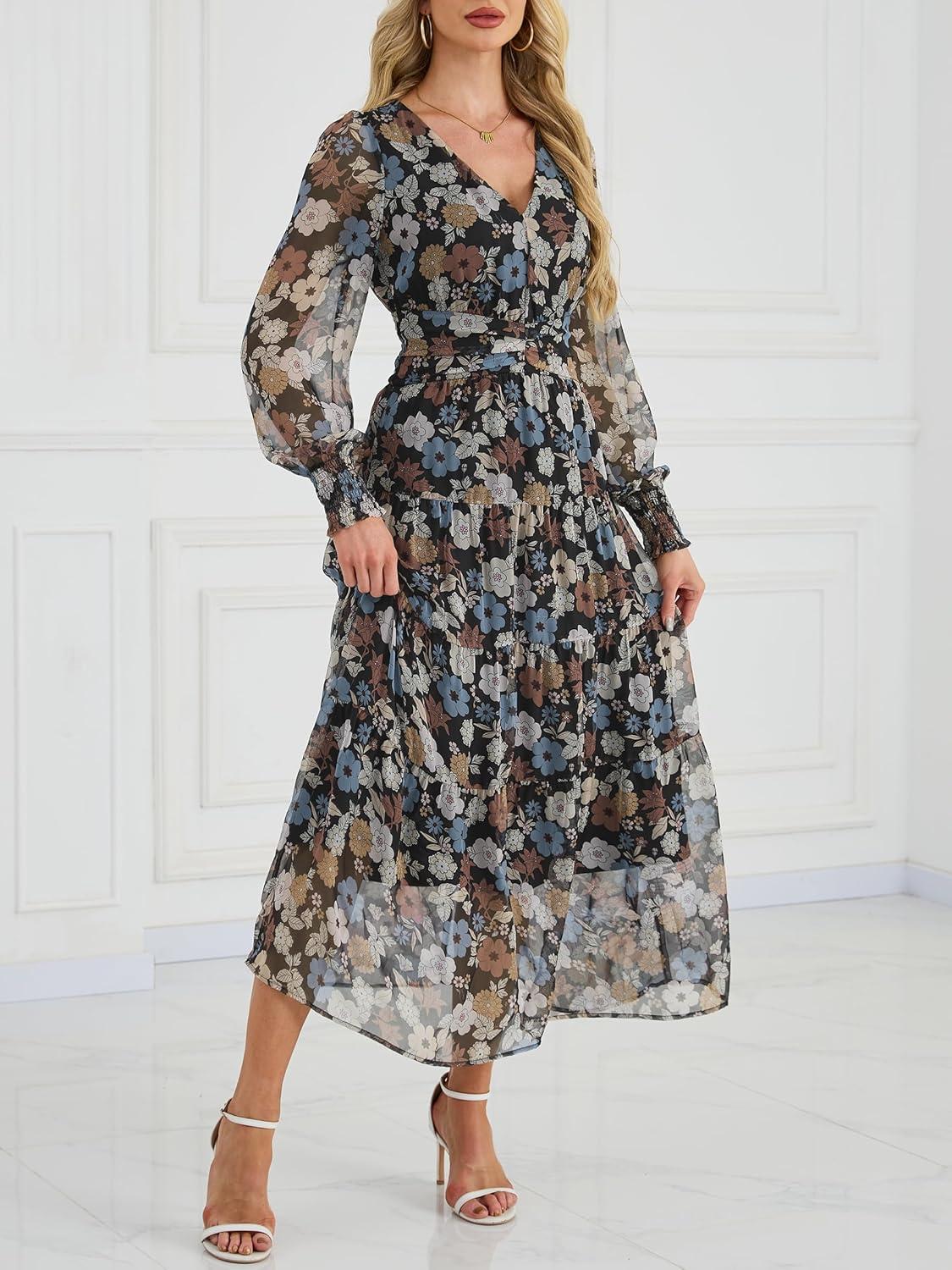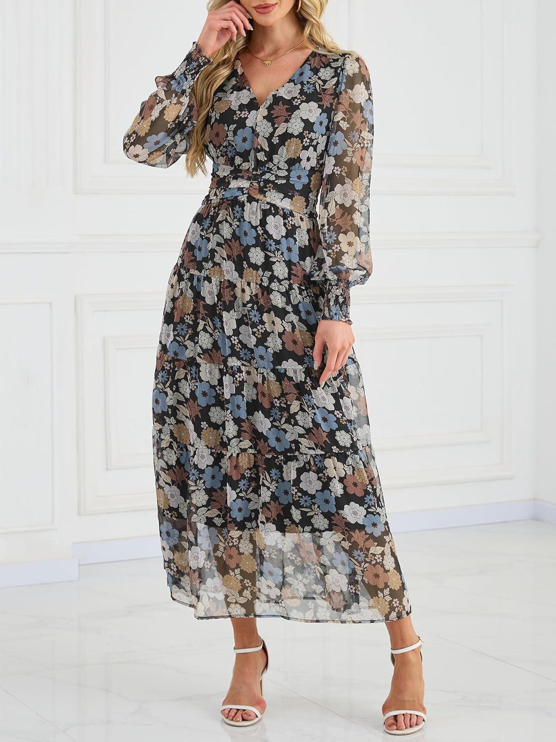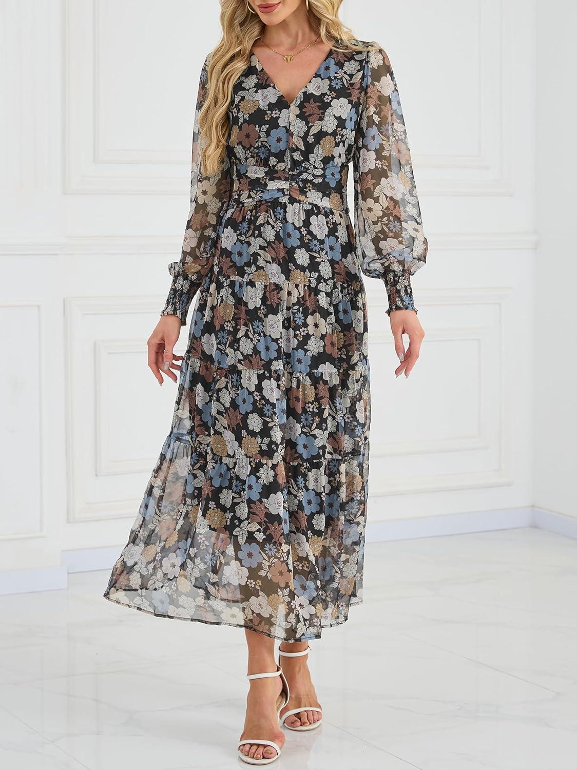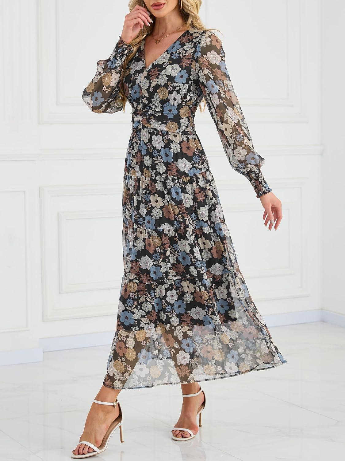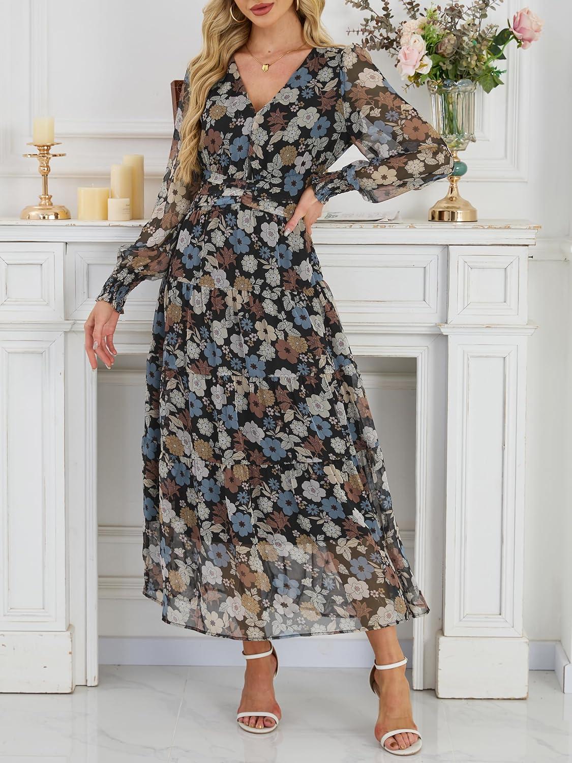 ANRABESS Womens Floral Long Sleeve Maxi Dress V Neck Chiffon Flowy Boho A-Line 2025 Fall Wedding Guest Party Wrap Dresses(Floral Black)