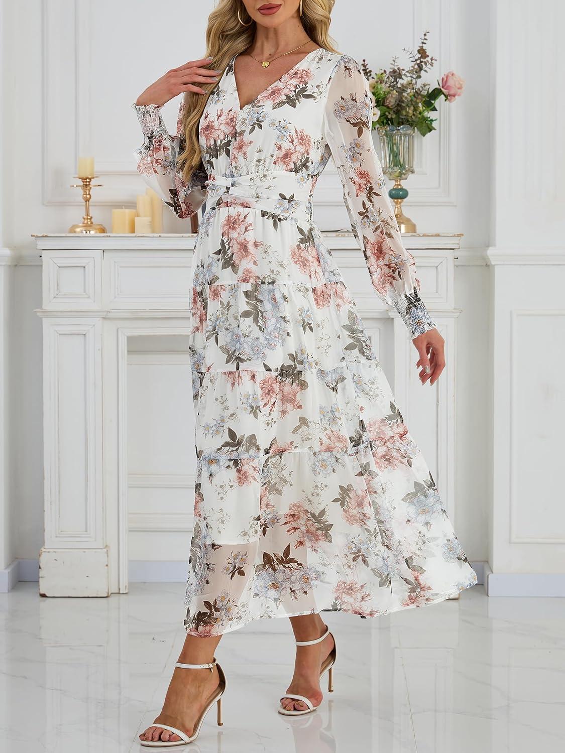 ANRABESS Womens Floral Long Sleeve Maxi Dress V Neck Chiffon Flowy Boho A-Line 2025 Fall Wedding Guest Party Wrap Dresses(Floral White)