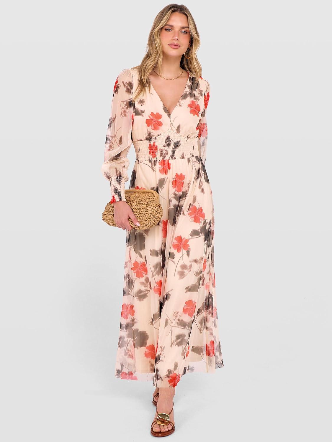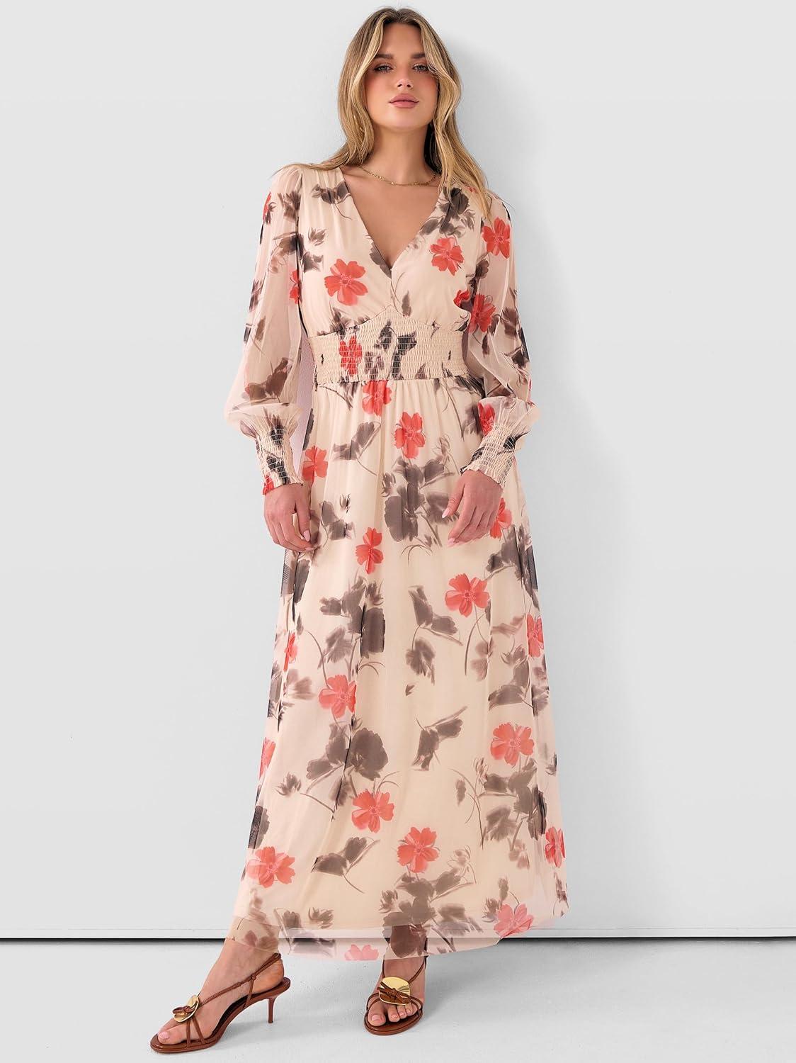 ANRABESS Women’s Floral Maxi Dress 2025 Fall V Neck Puff Long Sleeve Flowy Casual Wedding Guest Tea Party Tulle Dresses(Black Red Flower)