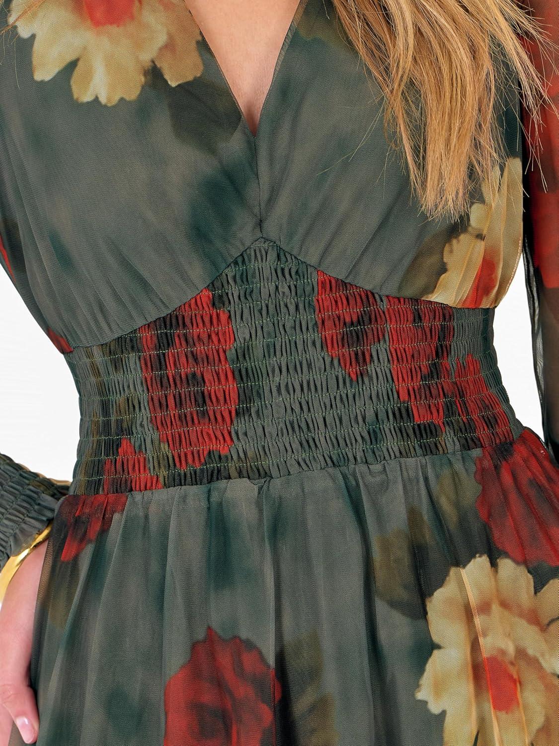 ANRABESS Women’s Floral Maxi Dress 2025 Fall V Neck Puff Long Sleeve Flowy Casual Wedding Guest Tea Party Tulle Dresses(Red and Yellow Rose)