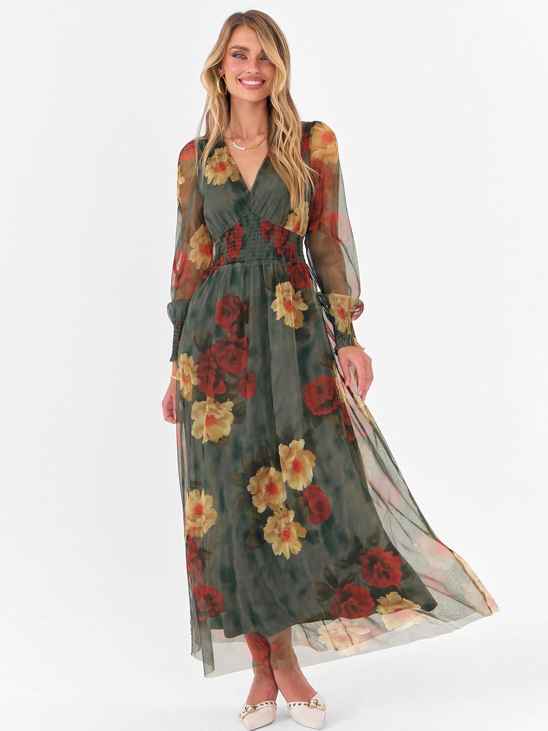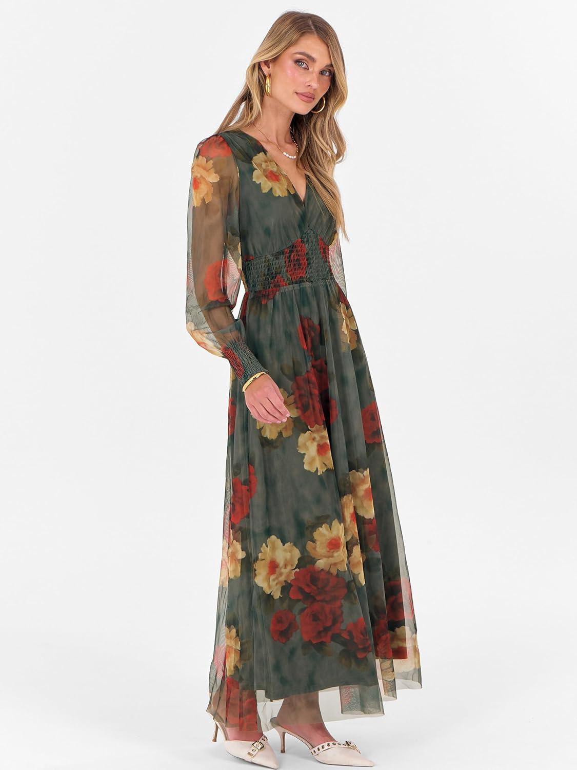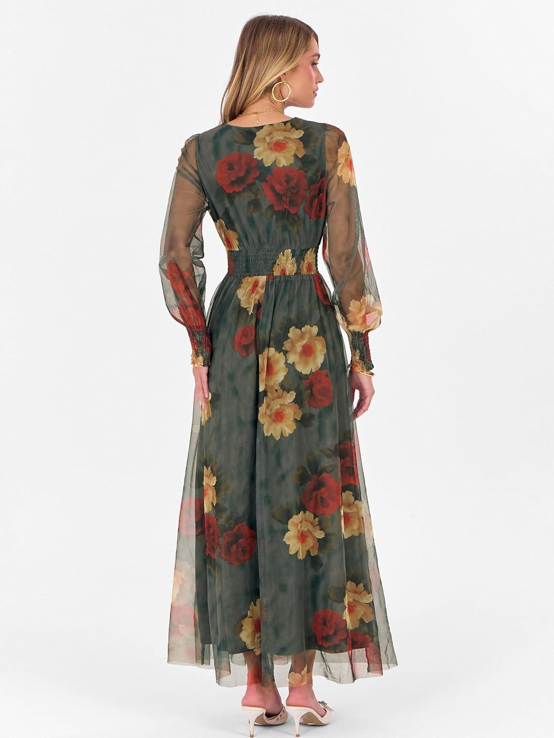 ANRABESS Women’s Floral Maxi Dress 2025 Fall V Neck Puff Long Sleeve Flowy Casual Wedding Guest Tea Party Tulle Dresses(Rose Red Flower)