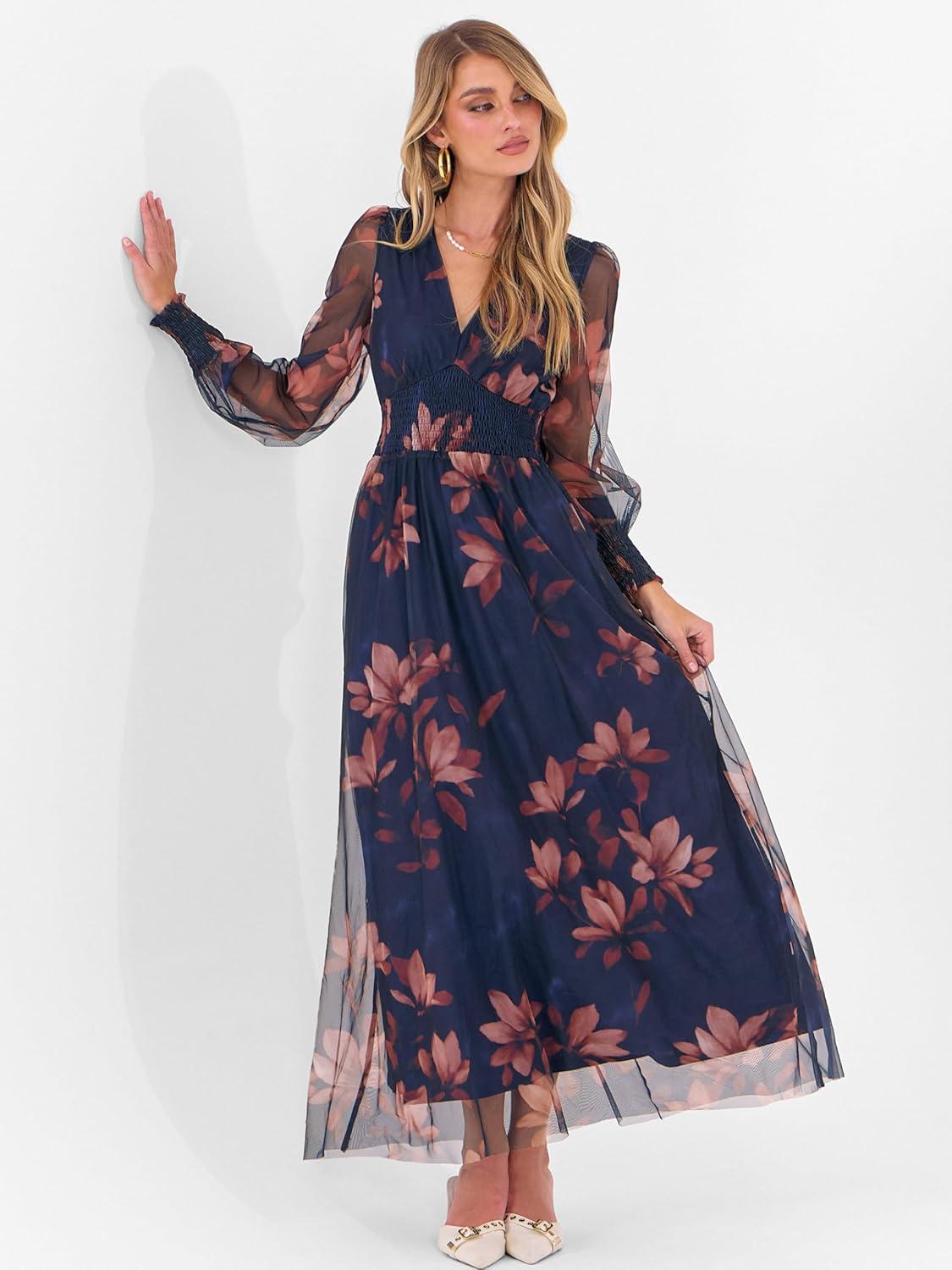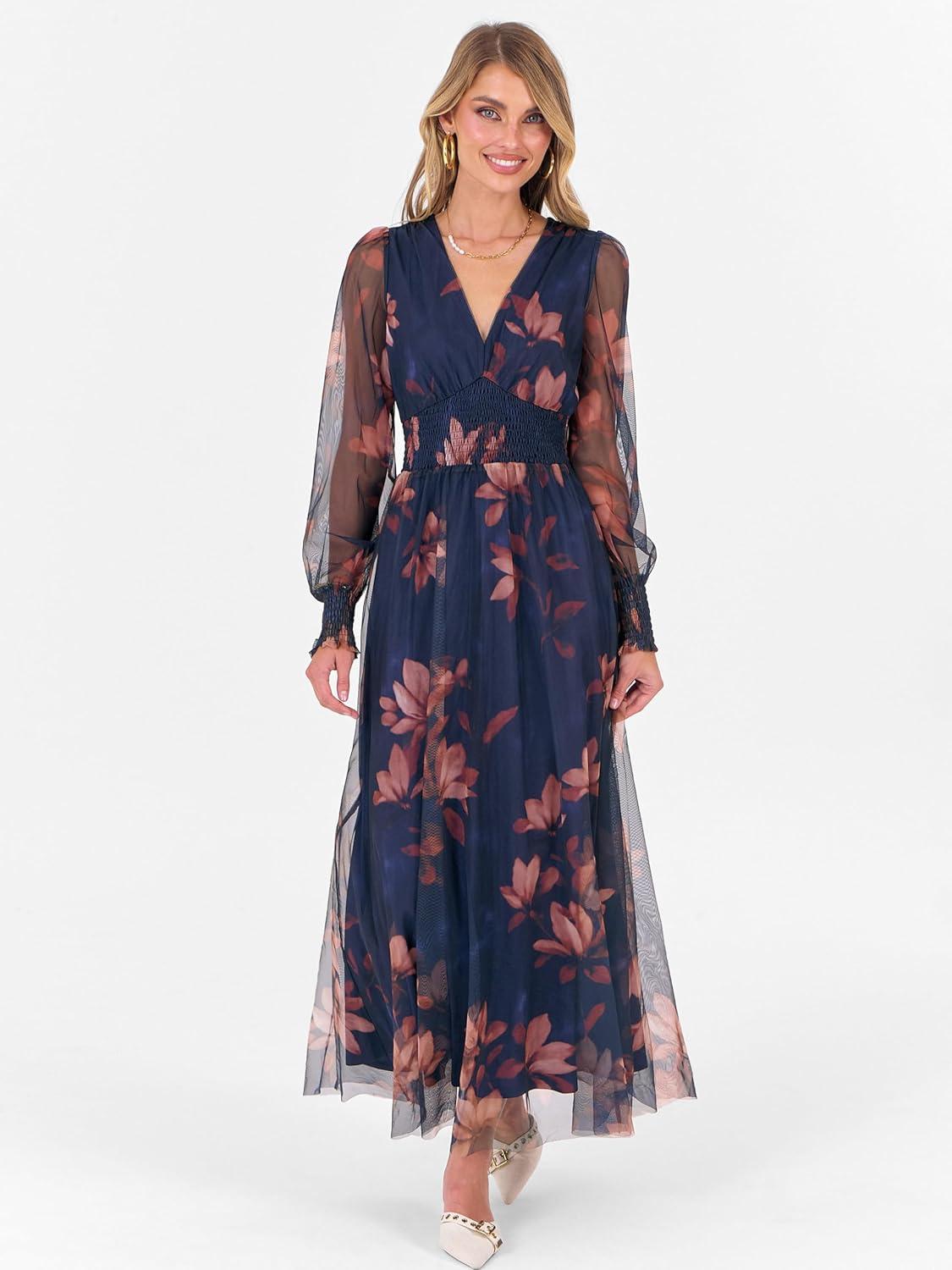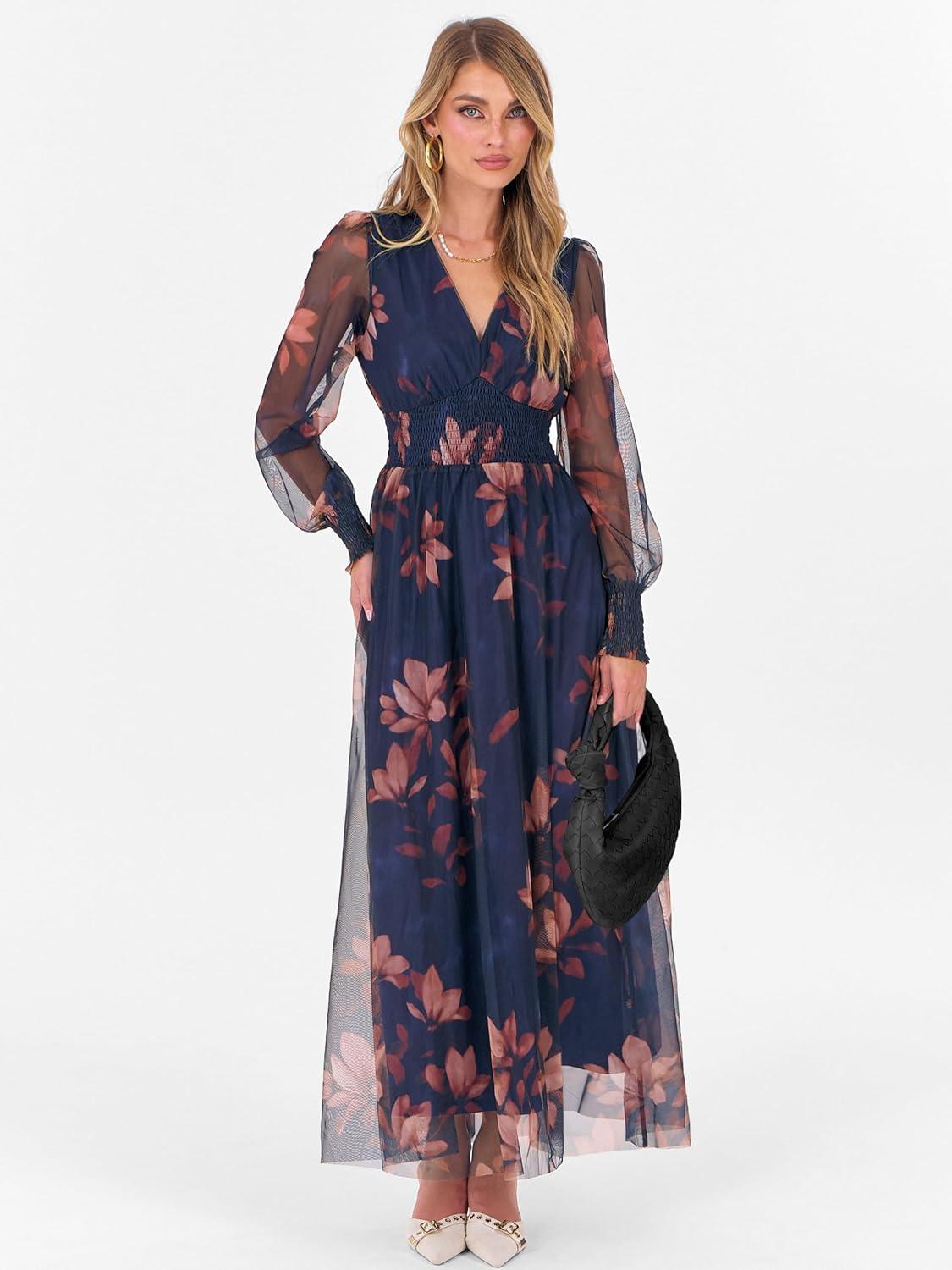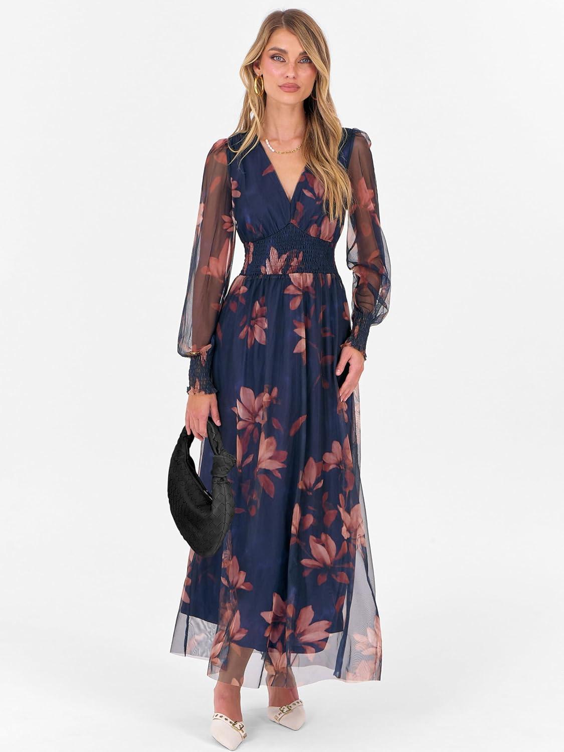 imageANRABESS Womens Floral Maxi Dress 2025 Fall V Neck Puff Long Sleeve Flowy Casual Wedding Guest Tee Party Tulle DressesBrown Floral Dark Blue