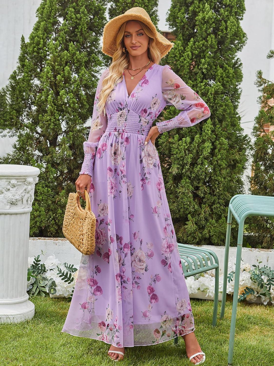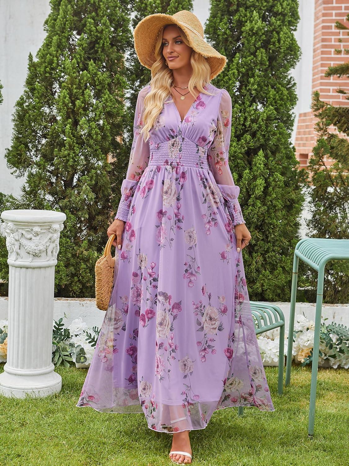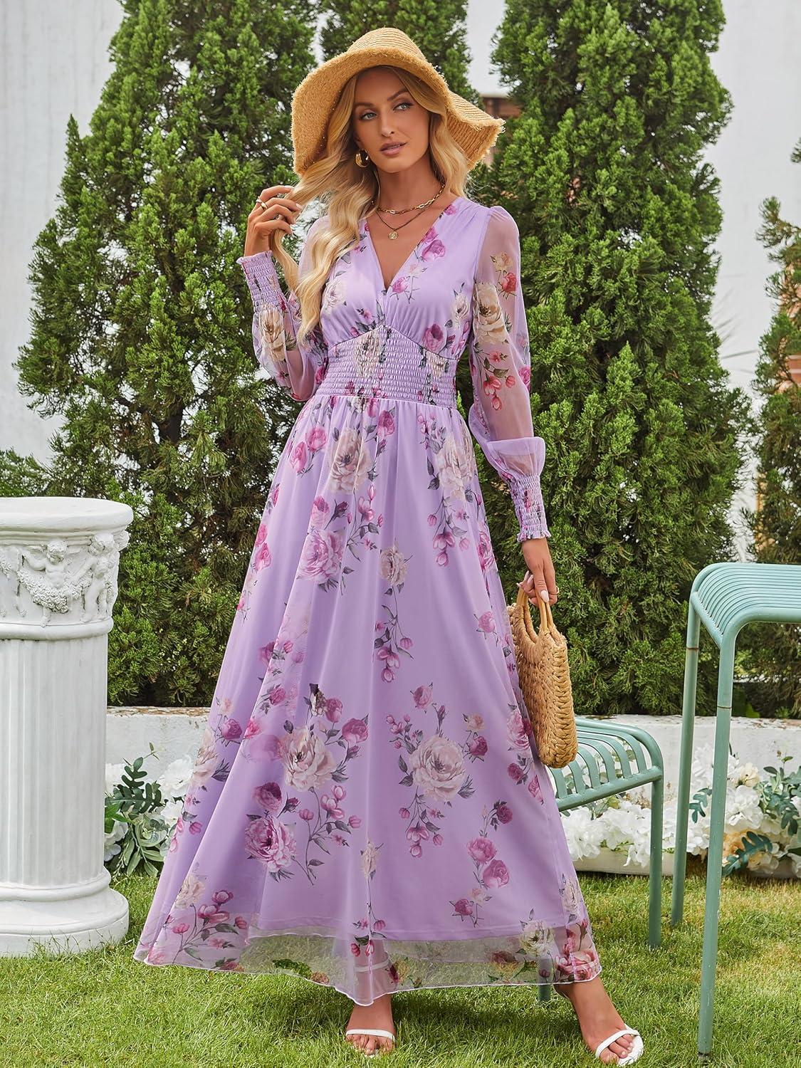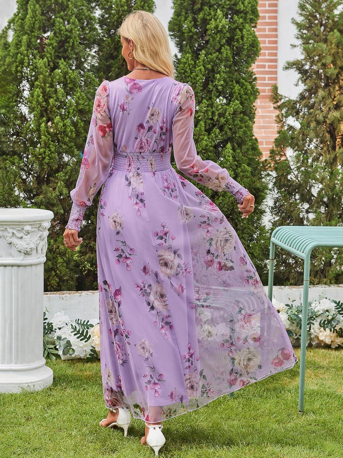 ANRABESS Women’s Floral Maxi Dress 2025 Fall V Neck Puff Long Sleeve Flowy Casual Wedding Guest Tee Party Tulle Dresses(Purple Rose)