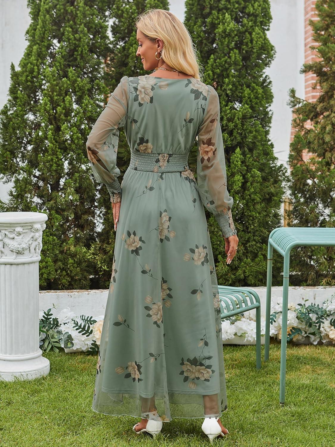 imageANRABESS Womens Floral Maxi Dress 2025 Fall V Neck Puff Long Sleeve Flowy Casual Wedding Guest Tee Party Tulle DressesYellow Floral Green