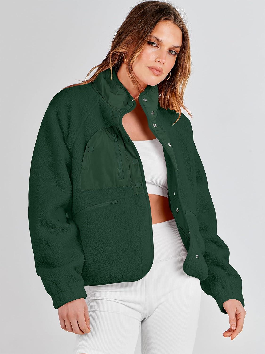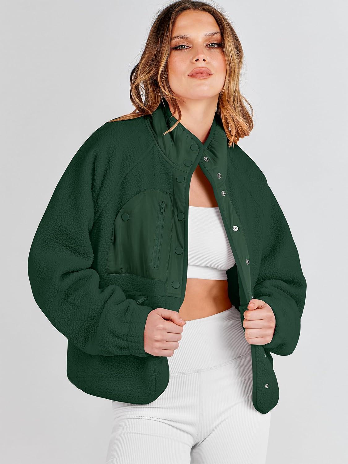 imageANRABESS Womens Fuzzy Fleece Jacket Fall Casual Long Sleeve Cropped Sherpa Button Down Shacket Coats Outwear With PocketsArmy Green
