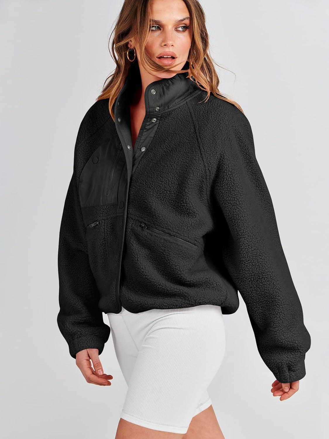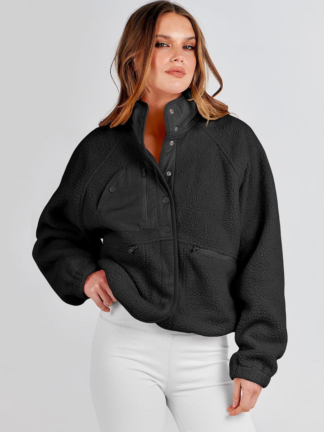 ANRABESS Womens Fuzzy Fleece Jacket Fall Casual Long Sleeve Cropped Sherpa Button Down Shacket Coats Outwear With Pockets(Black)