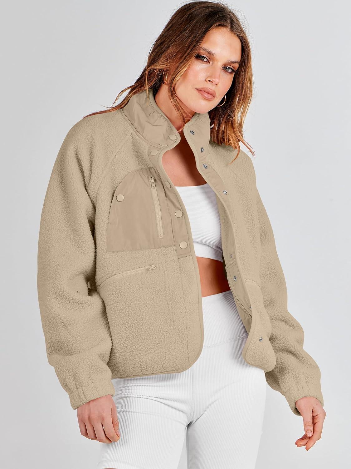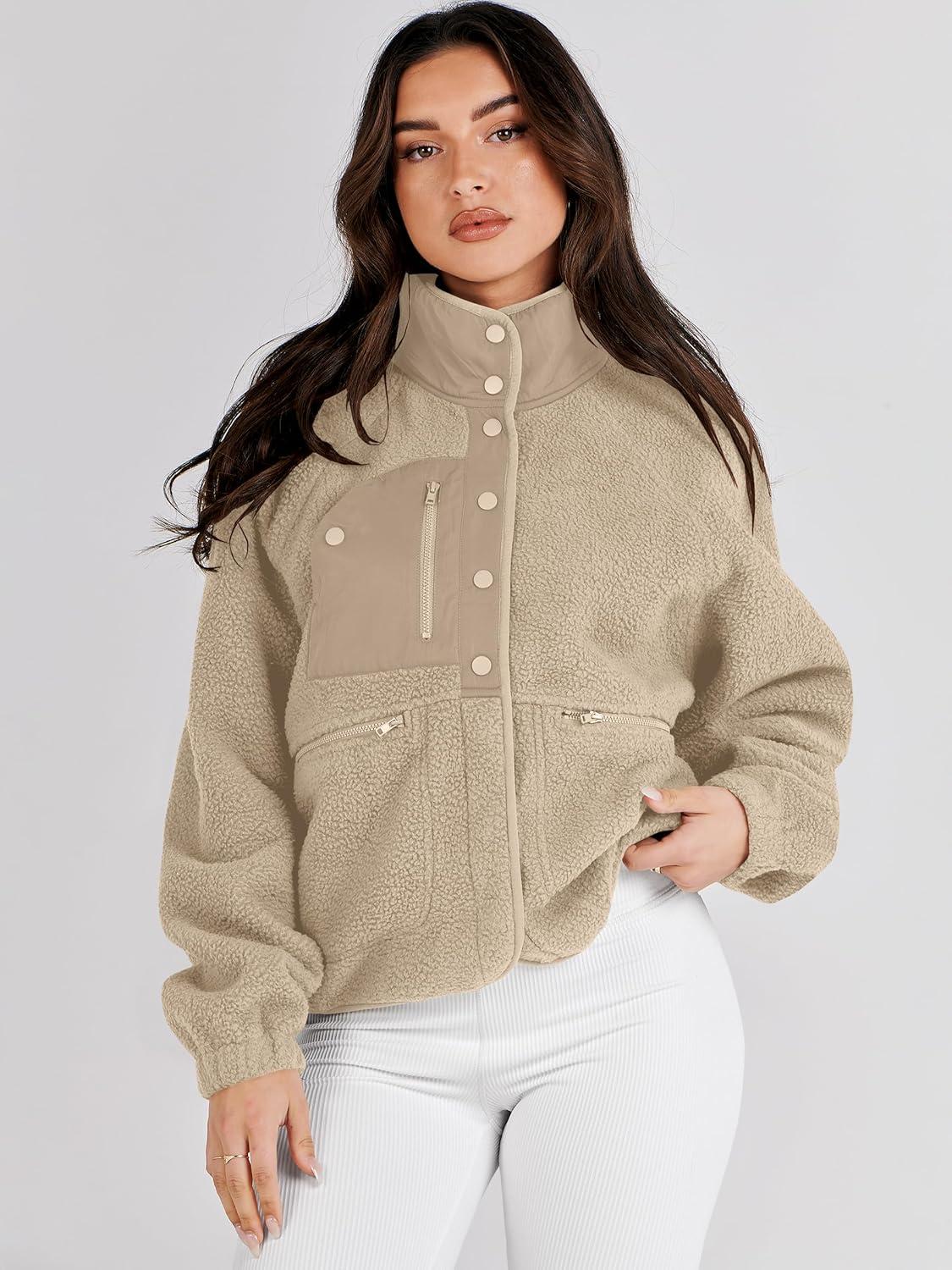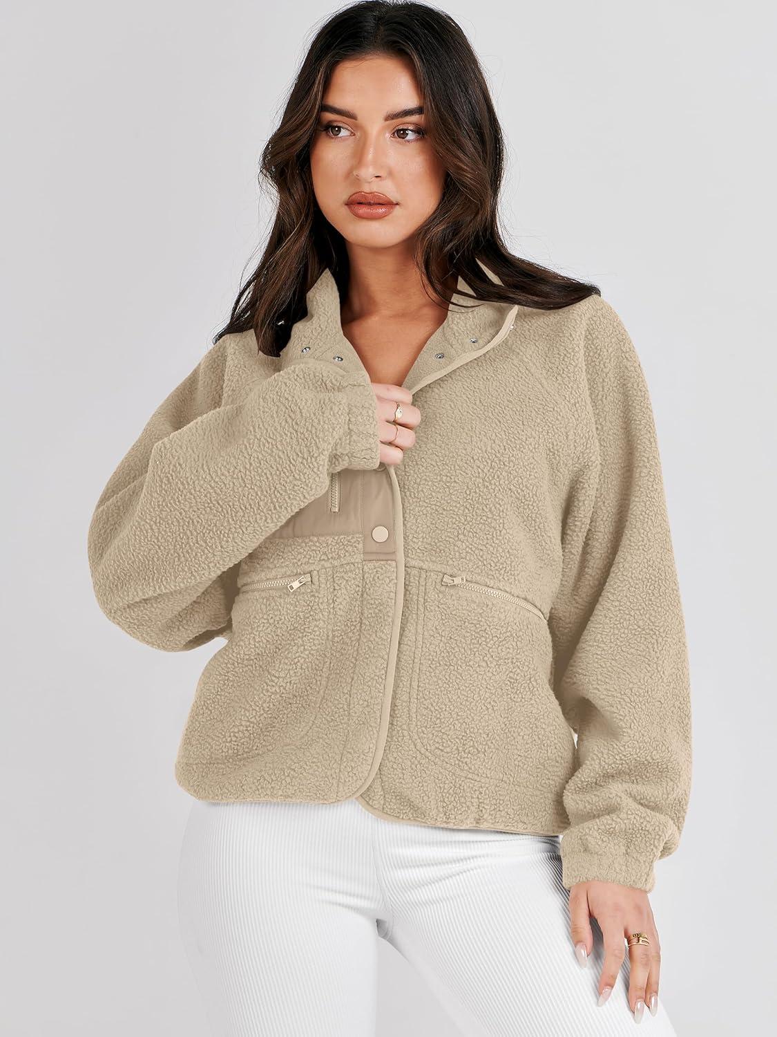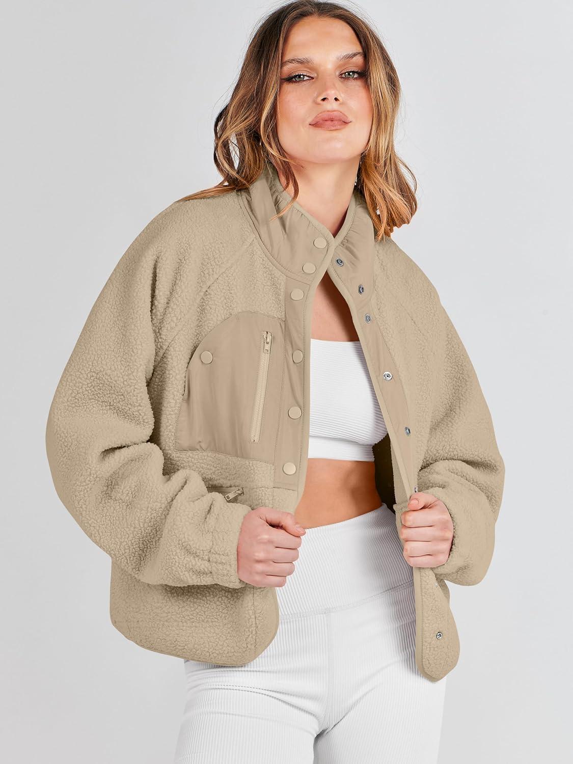 ANRABESS Womens Fuzzy Fleece Jacket Fall Casual Long Sleeve Cropped Sherpa Button Down Shacket Coats Outwear With Pockets(Khaki)