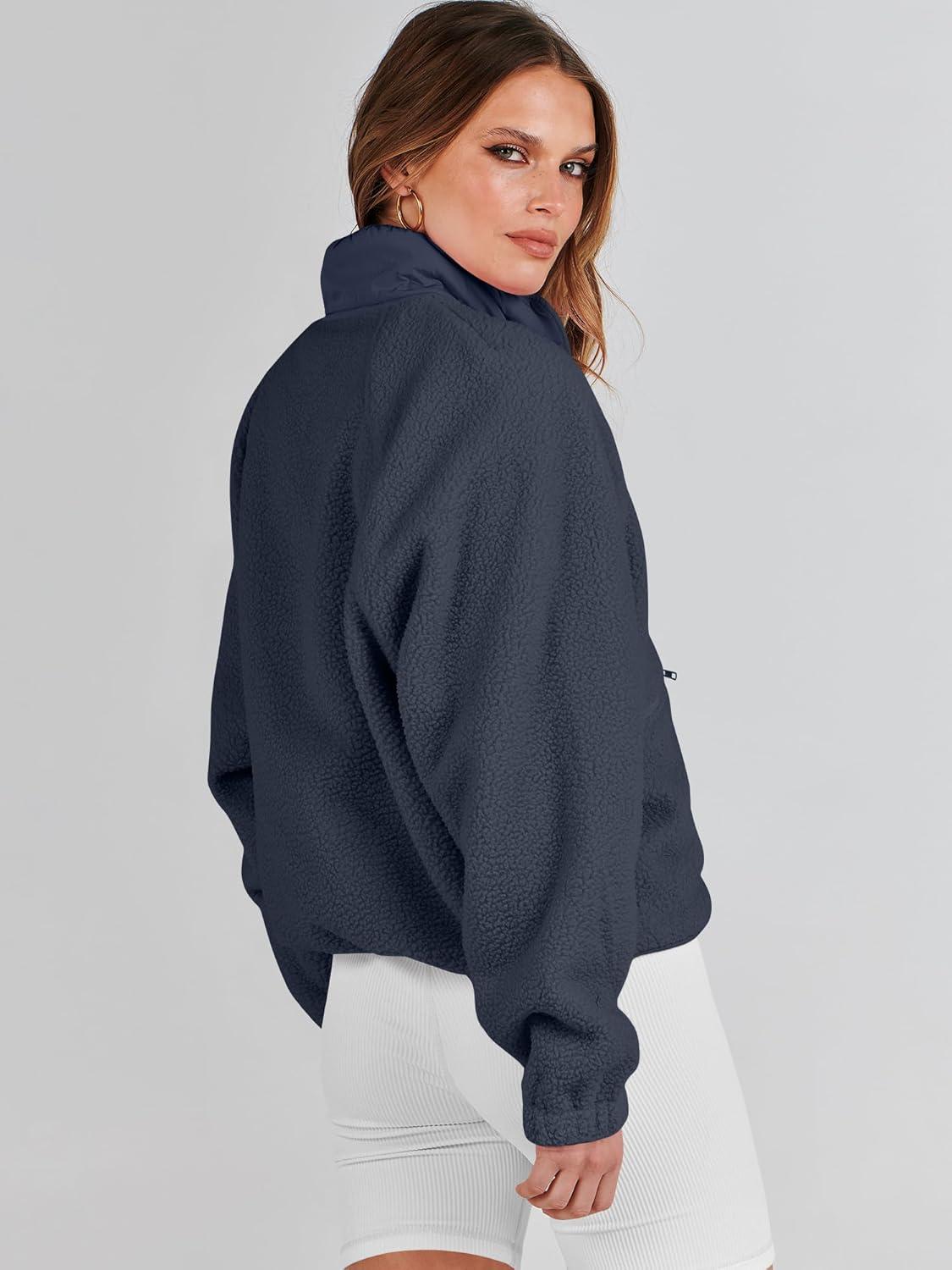 ANRABESS Womens Fuzzy Fleece Jacket Fall Casual Long Sleeve Cropped Sherpa Button Down Shacket Coats Outwear With Pockets(Navy Blue)