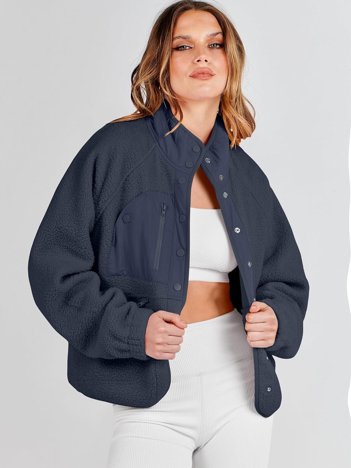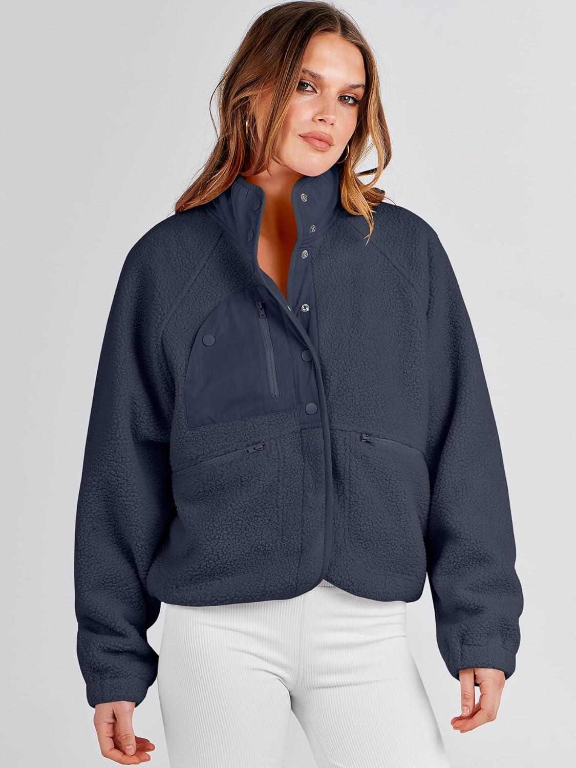 imageANRABESS Womens Fuzzy Fleece Jacket Fall Casual Long Sleeve Cropped Sherpa Button Down Shacket Coats Outwear With PocketsNavy Blue