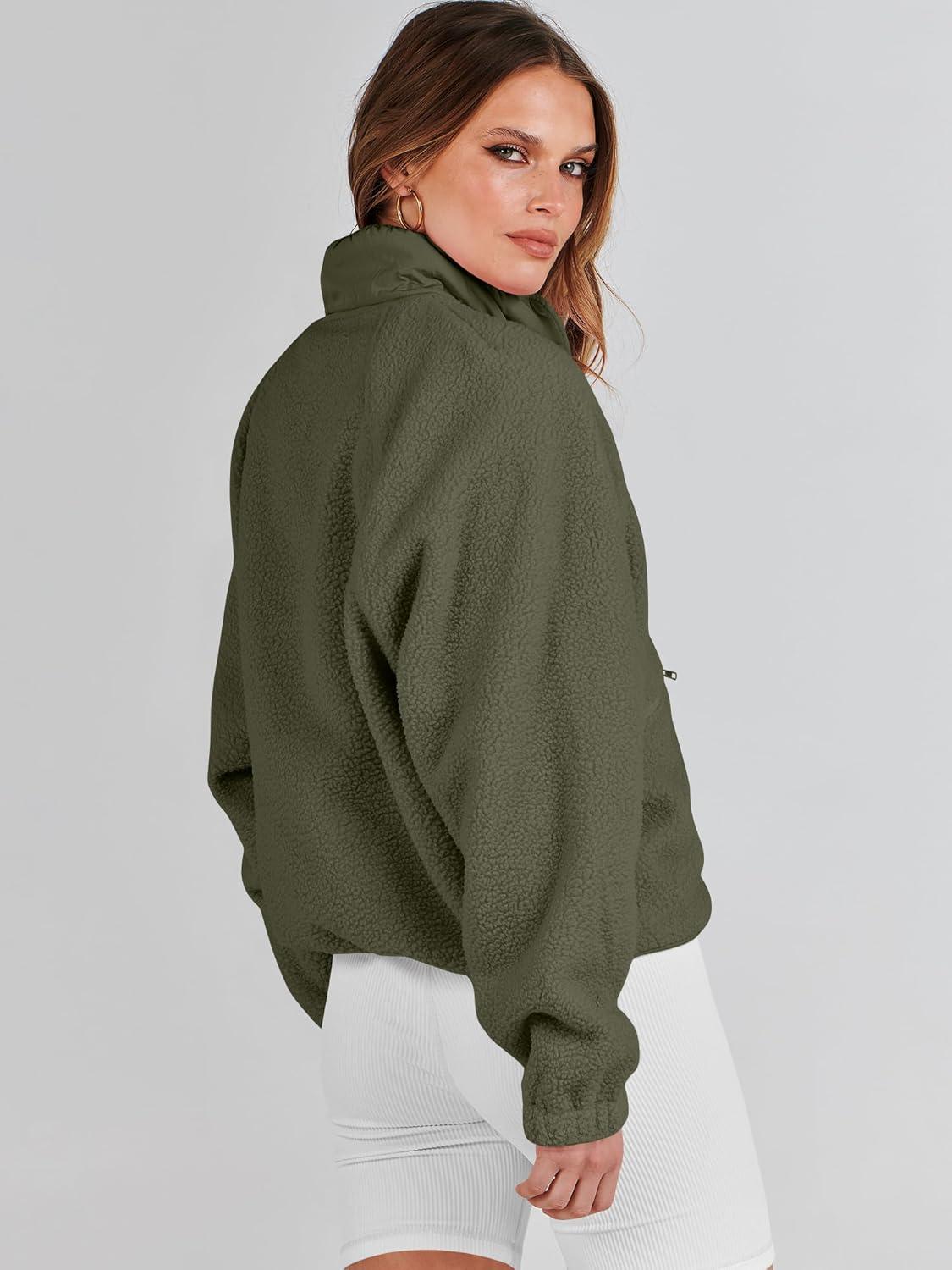 ANRABESS Womens Fuzzy Fleece Jacket Fall Casual Long Sleeve Cropped Sherpa Button Down Shacket Coats Outwear With Pockets(Olive)
