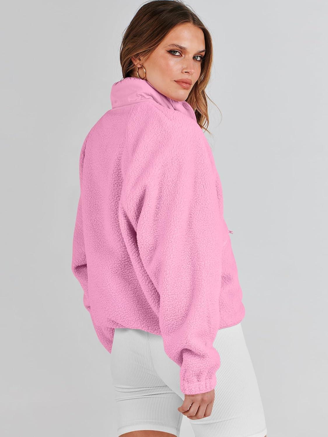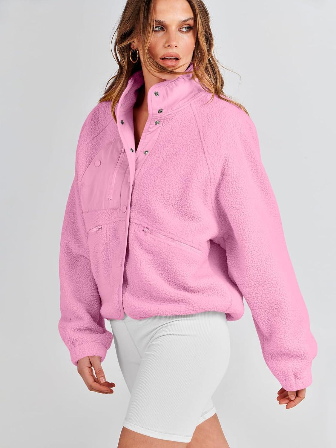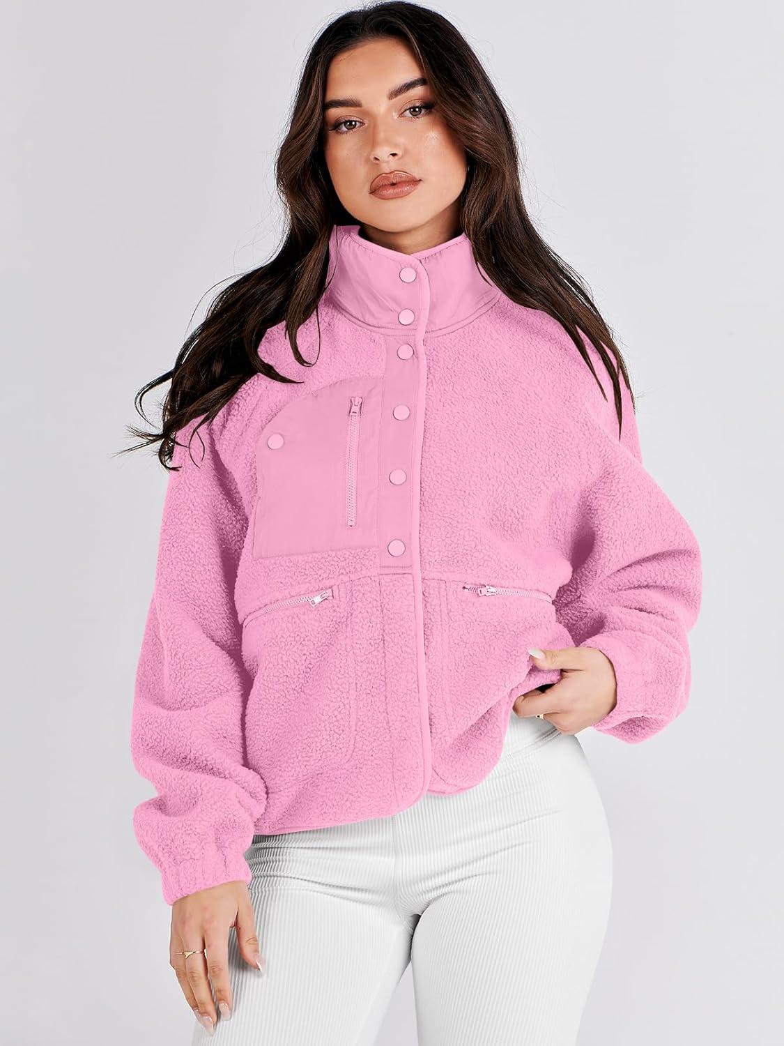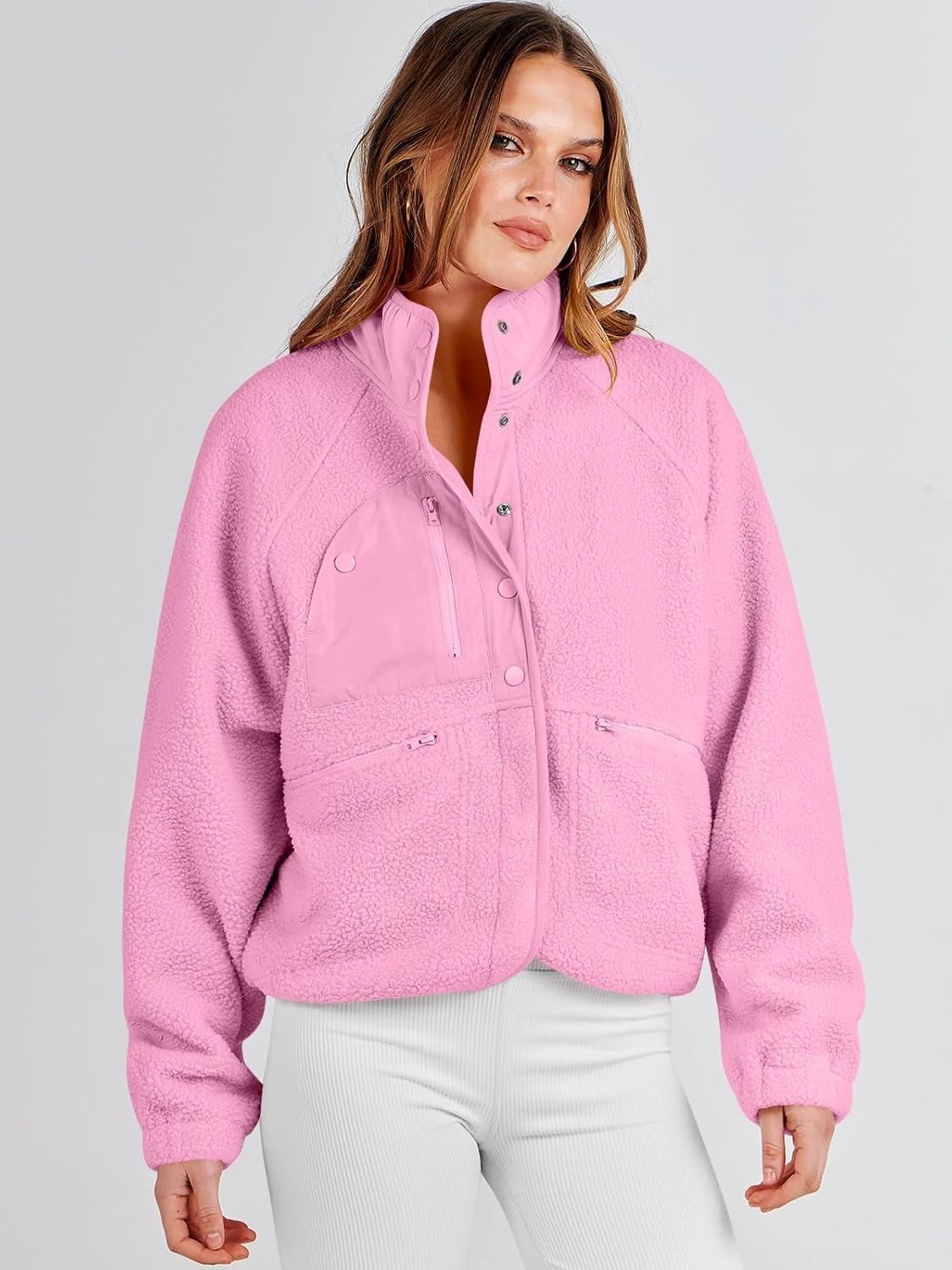 ANRABESS Womens Fuzzy Fleece Jacket Fall Casual Long Sleeve Cropped Sherpa Button Down Shacket Coats Outwear With Pockets(Pink)