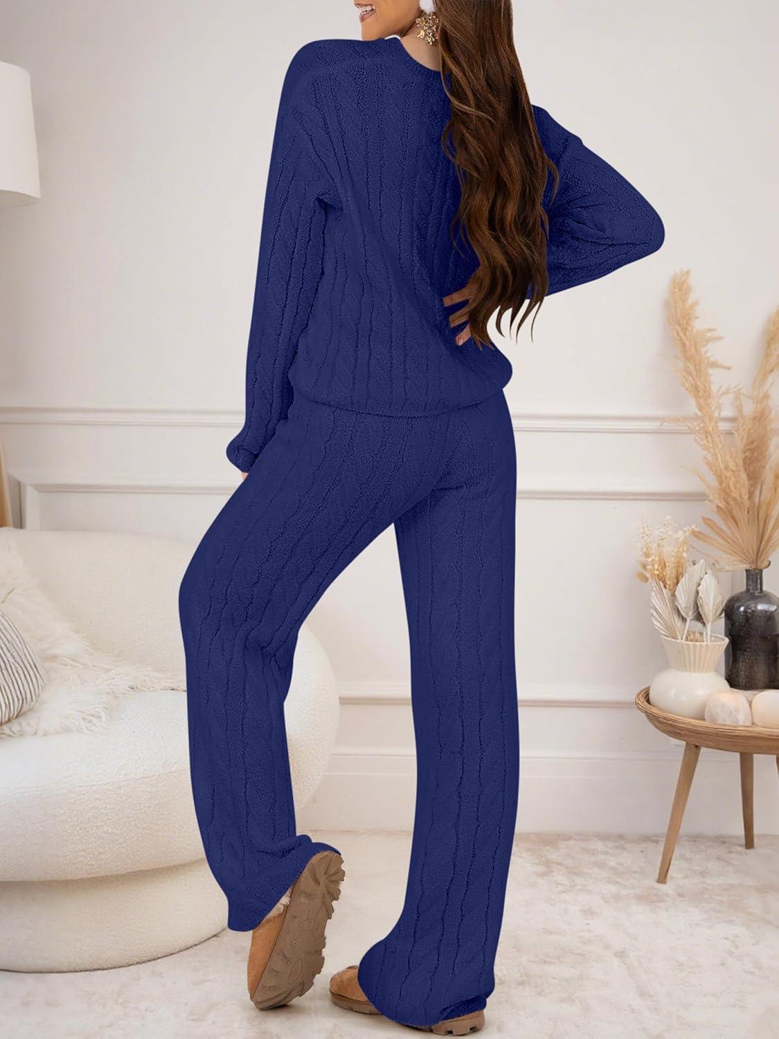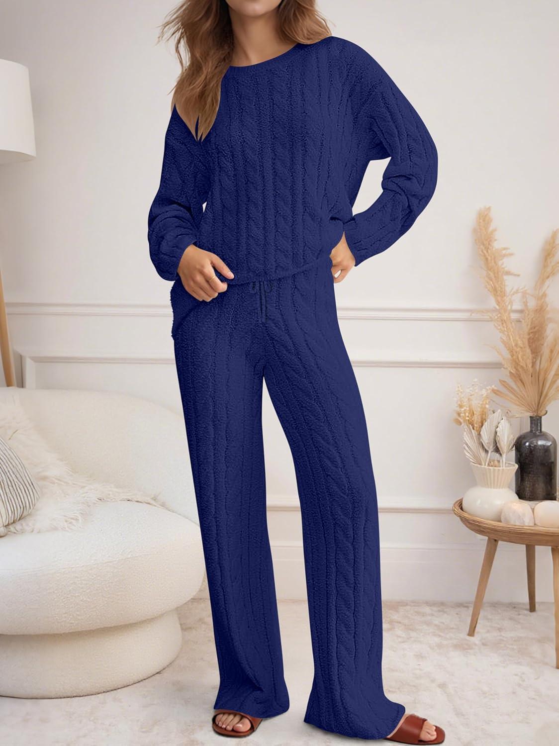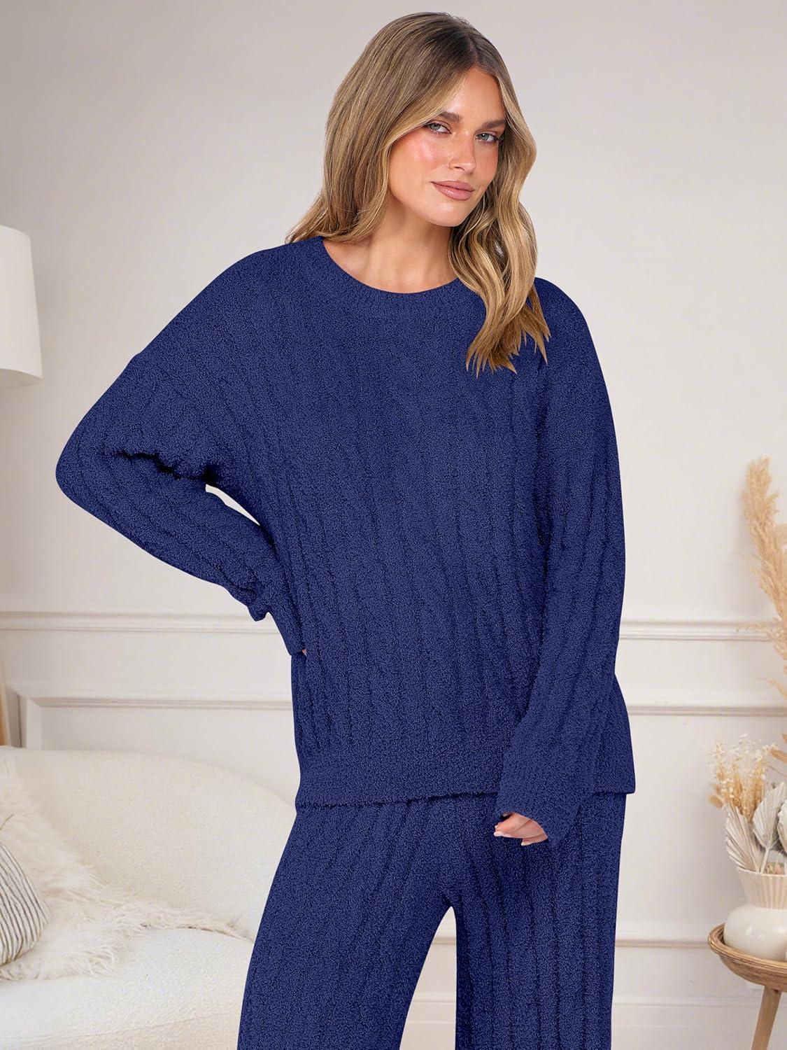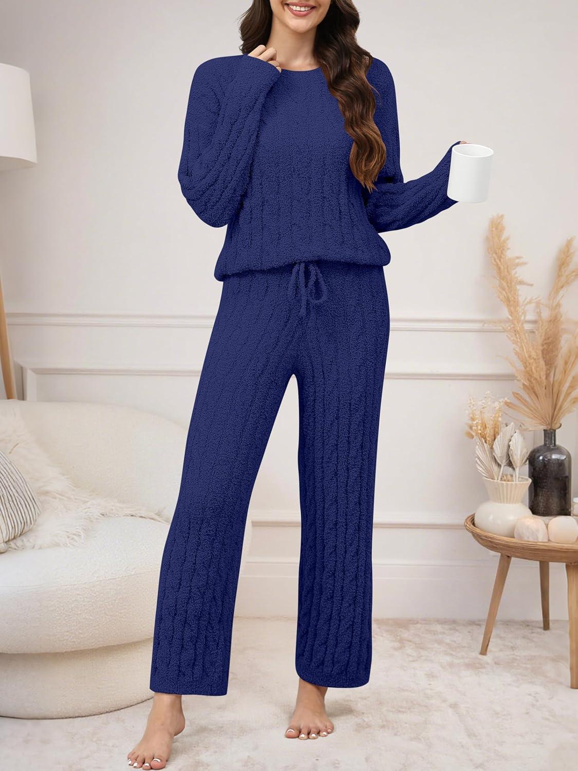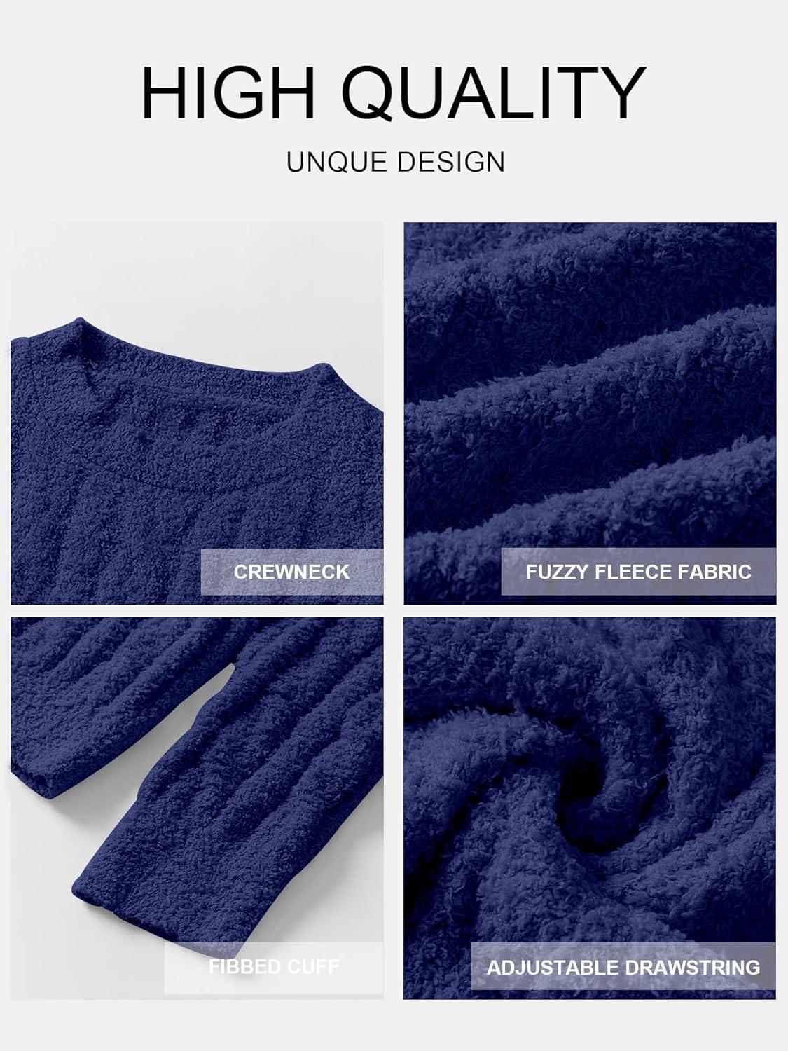 ANRABESS Women's Fuzzy Fleece Pajama Set 2 Piece Outfits Lounge Knit Oversized Sweater Pj Sets 2025 Fall Winter Loungewear(Navy Blue)