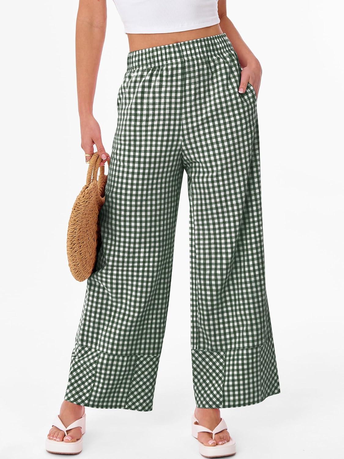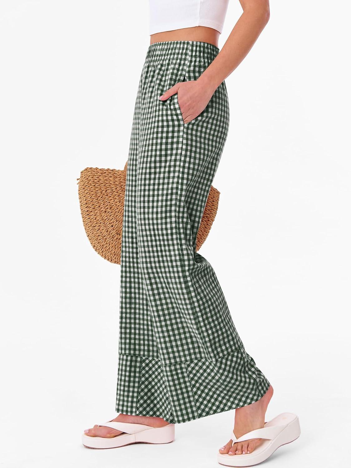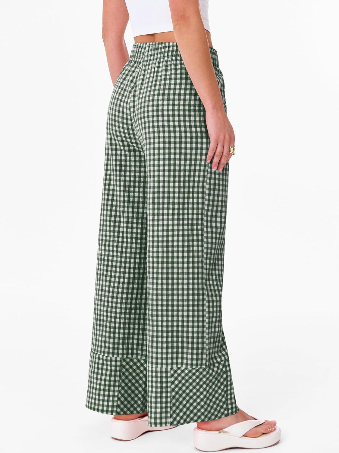 ANRABESS Womens Gingham Striped Boxer Pants Pajama Lounge PJ Bottoms Plaid Wide Leg Casual Cute Fall Trousers with Pockets(Green White Plaid)