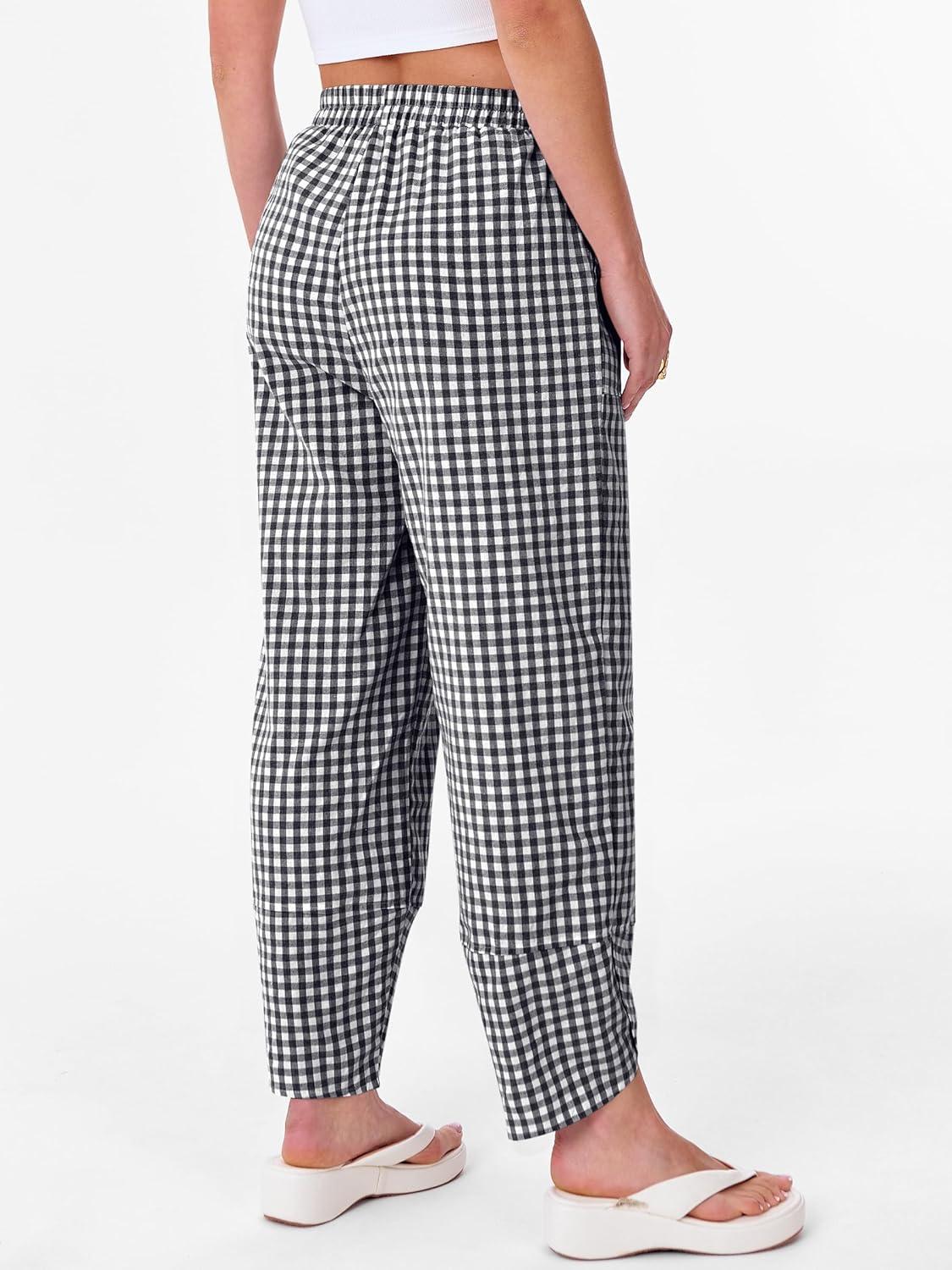 imageANRABESS Womens Gingham Striped Palazzo Pants Wide Leg Pajama Lounge Crop Pants Plaid PJ Bottoms Casual Trousers with PocketsBlack White Plaid