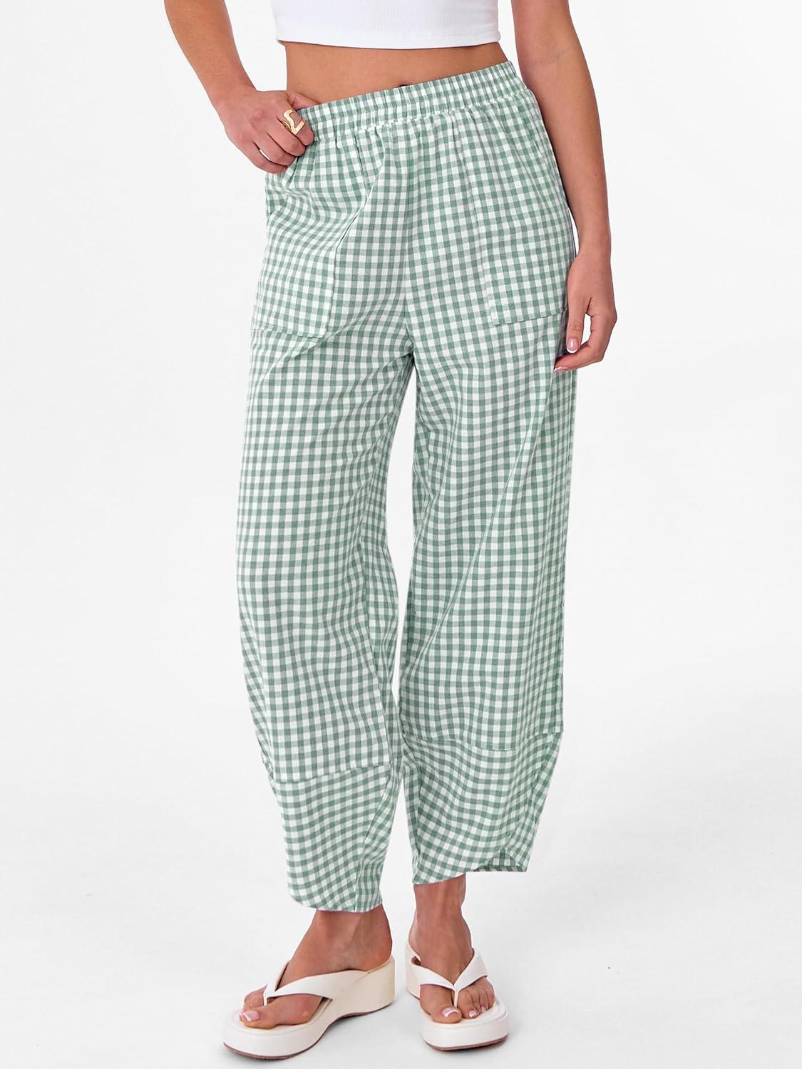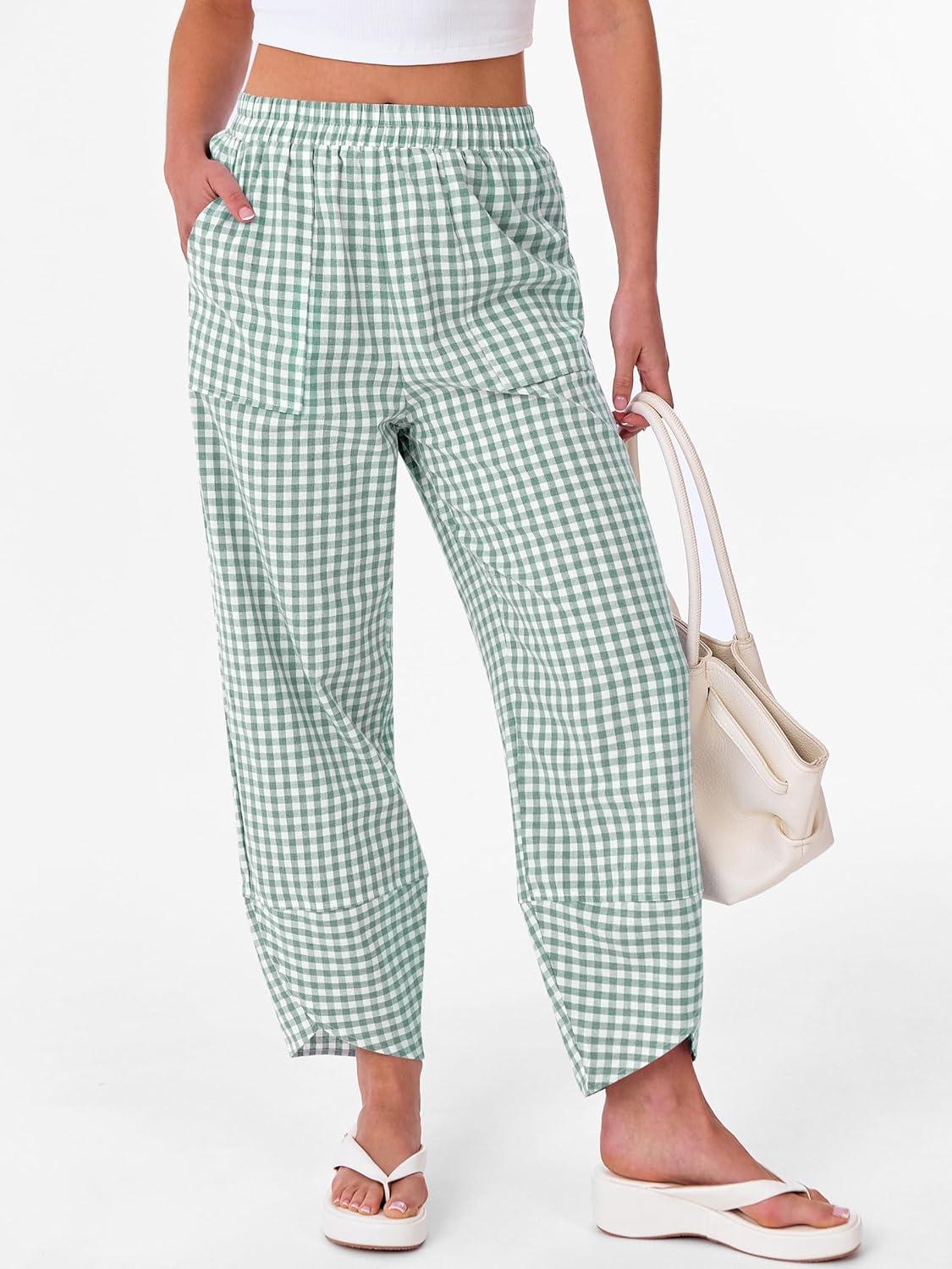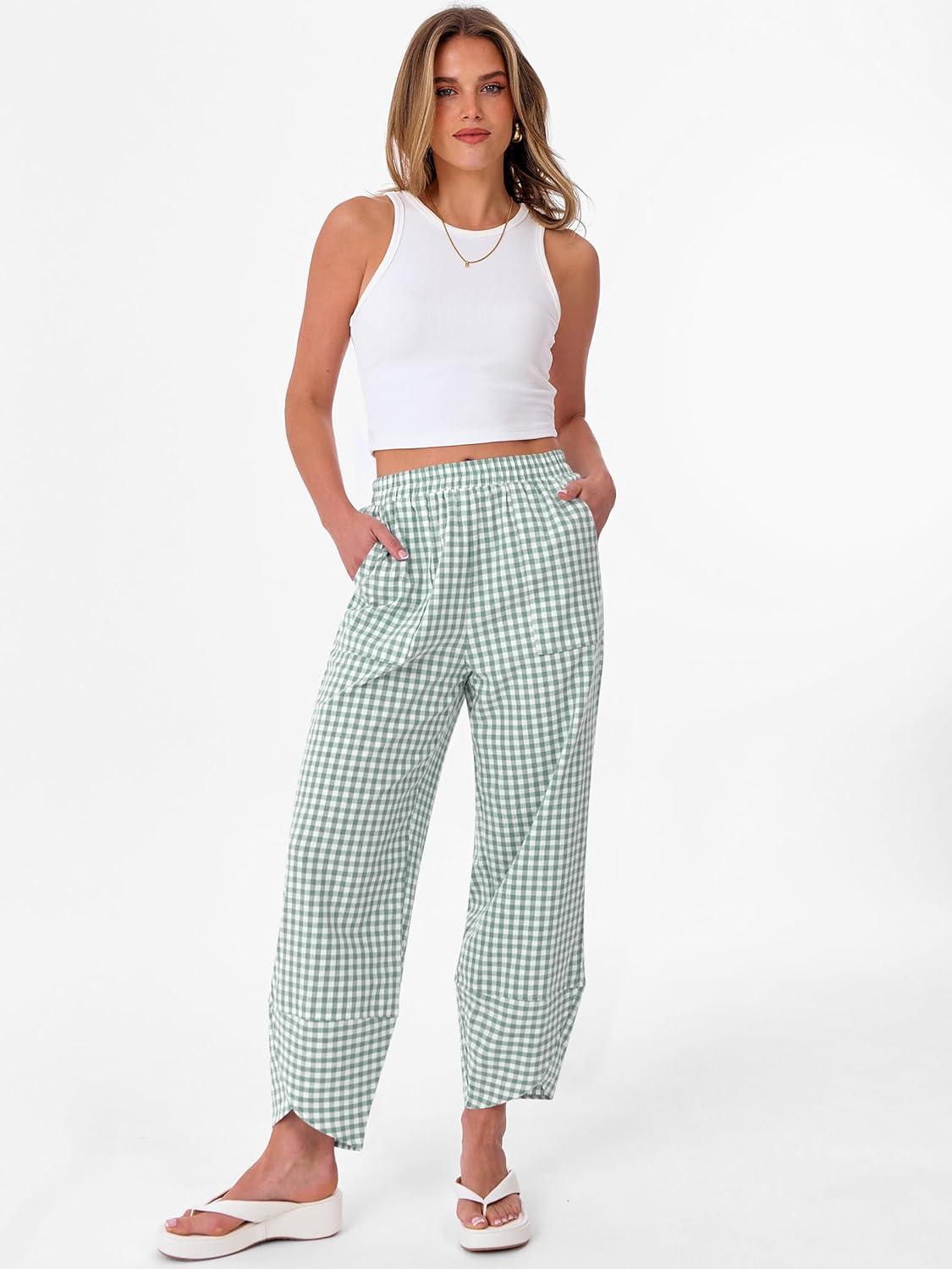 imageANRABESS Womens Gingham Striped Palazzo Pants Wide Leg Pajama Lounge Crop Pants Plaid PJ Bottoms Casual Trousers with PocketsGreen White Plaid