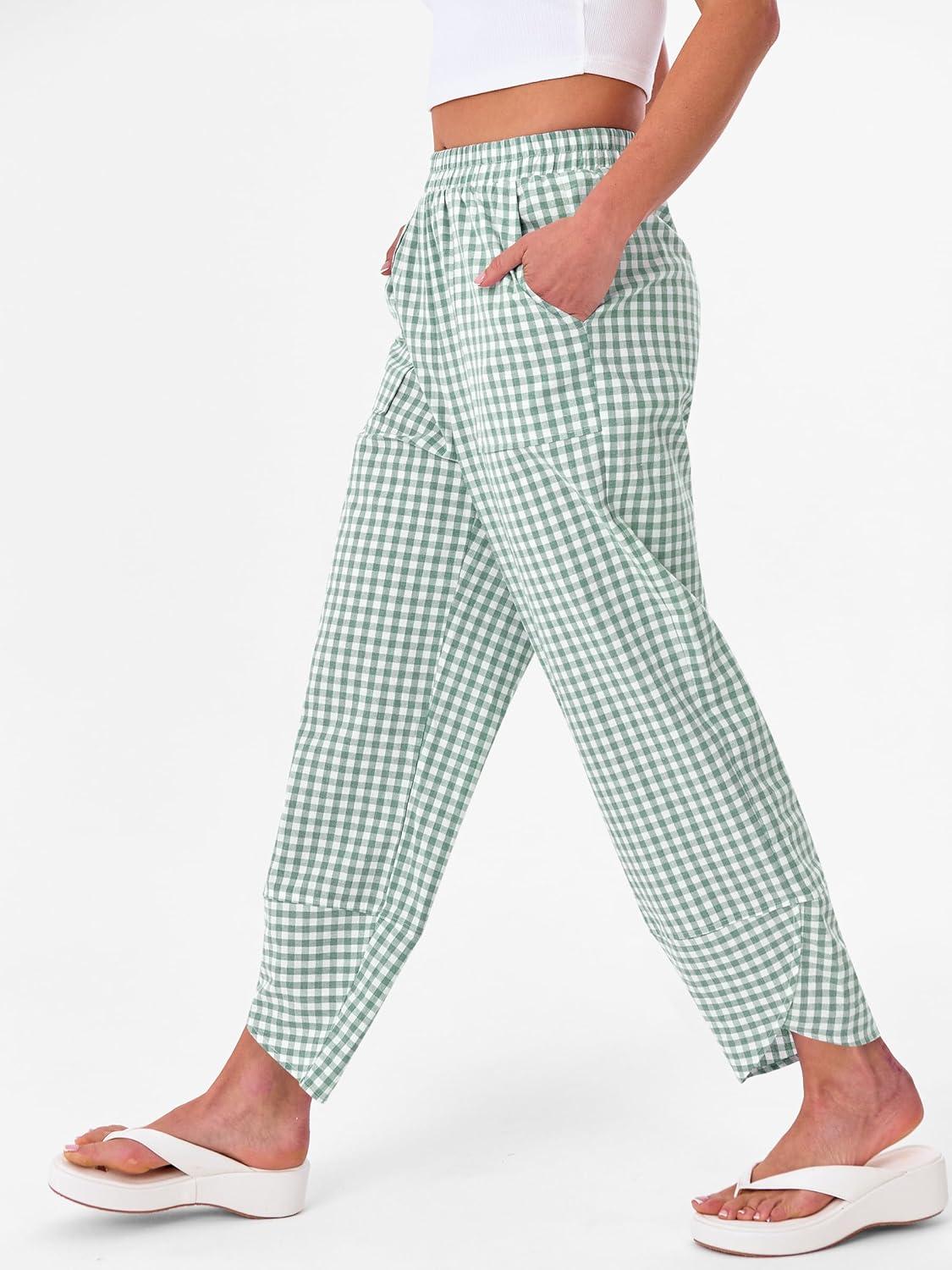 ANRABESS Womens Gingham Striped Palazzo Pants Wide Leg Pajama Lounge Crop Pants Plaid PJ Bottoms Casual Trousers with Pockets(Green White Plaid)