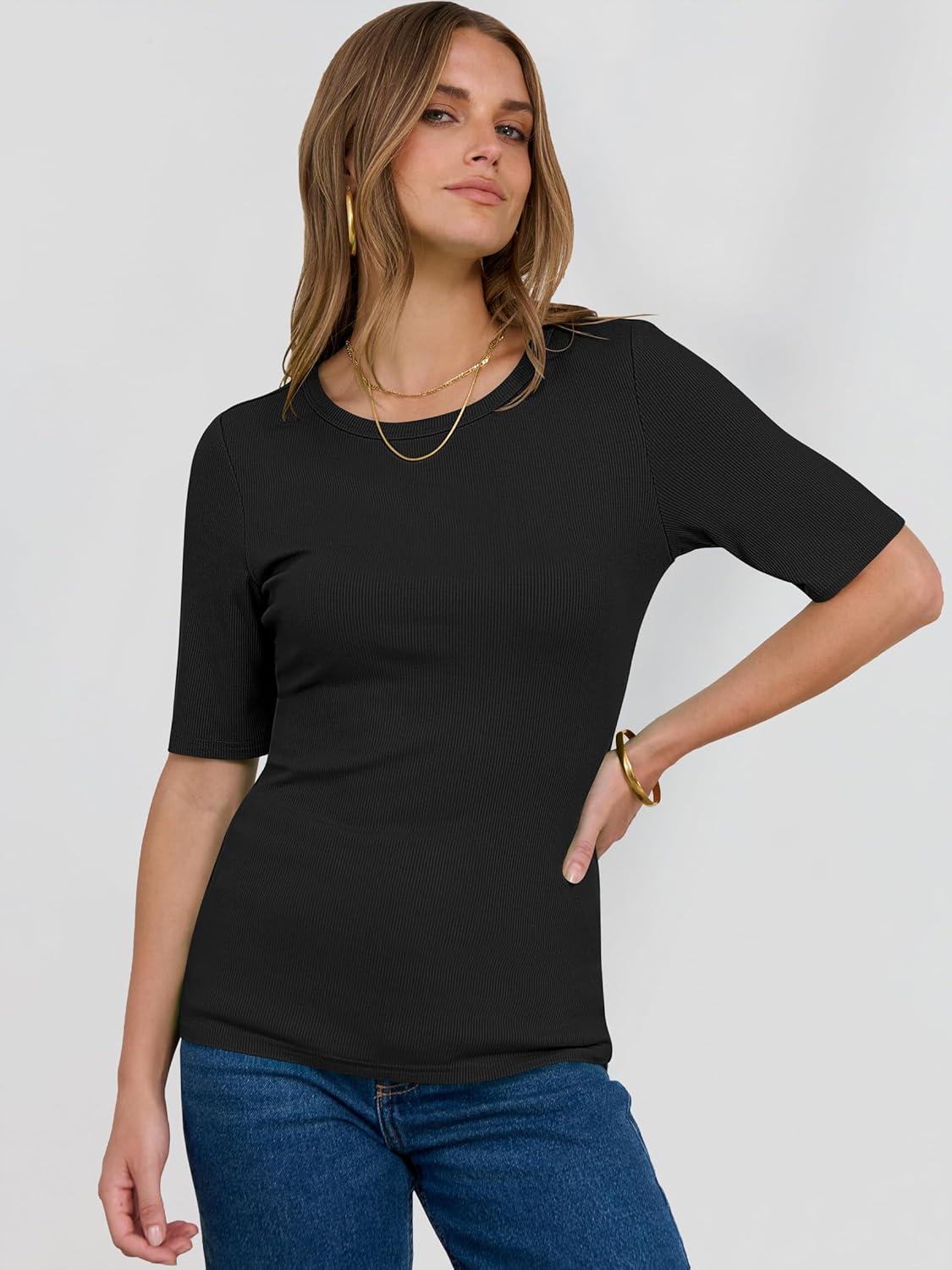 ANRABESS Womens Half Sleeve Crewneck Tops Ribbed Knit Slim Fit Shirts Basic Tee 2025 Spring Summer Dressy Casual T-Shirts(Black)
