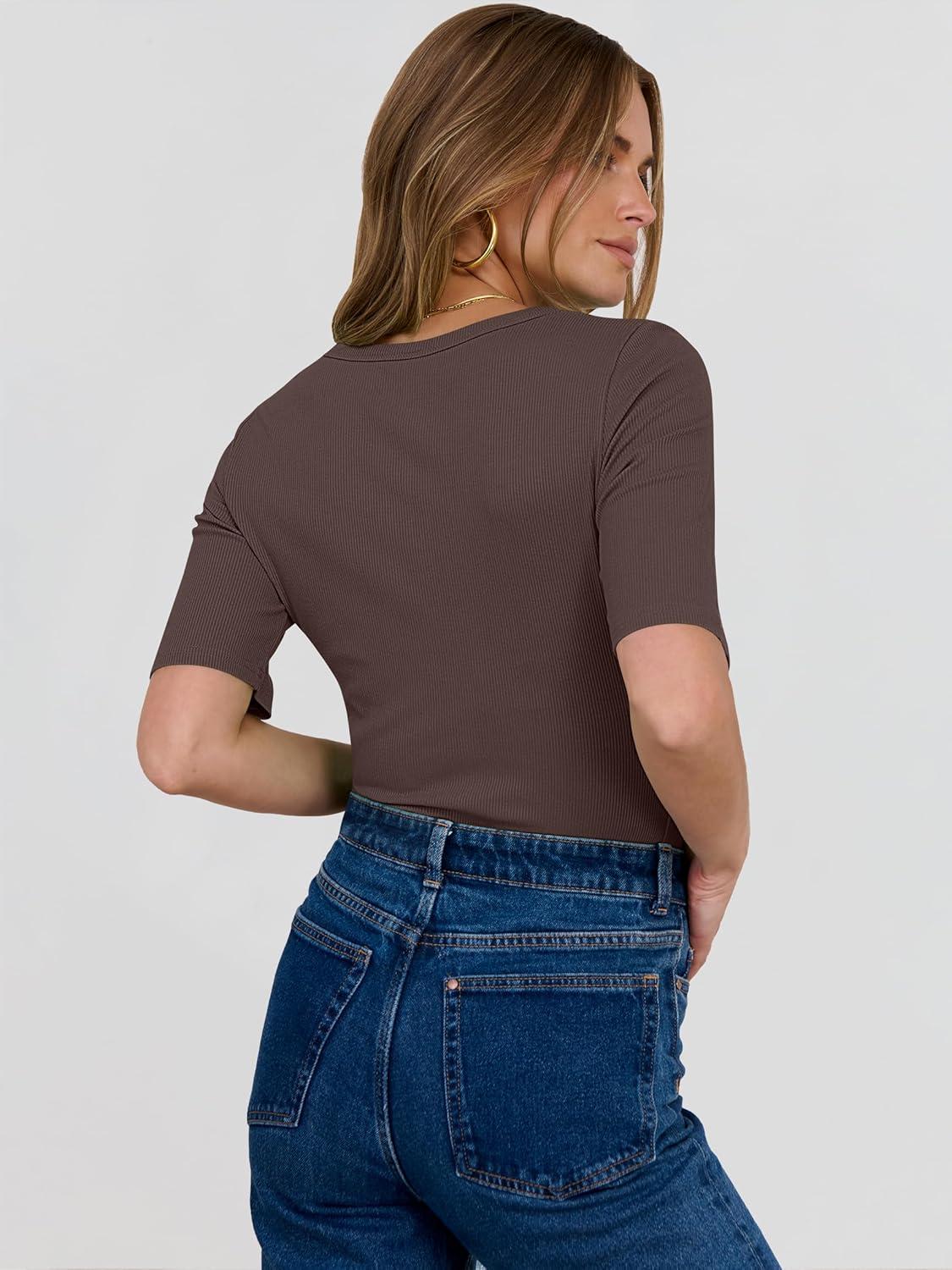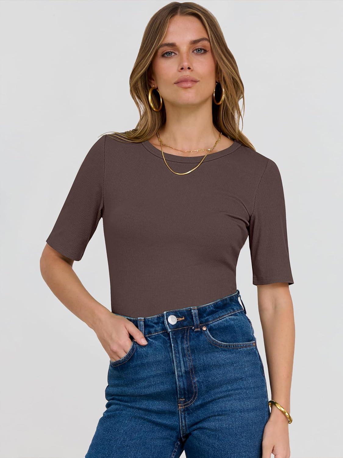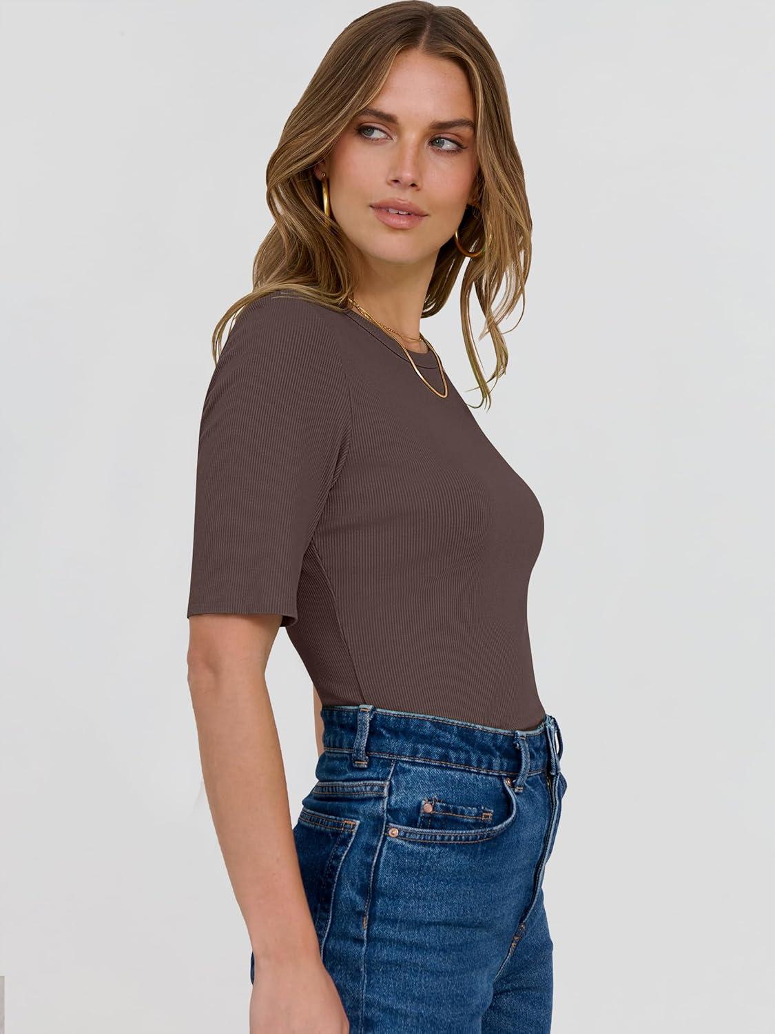 imageANRABESS Womens Half Sleeve Crewneck Tops Ribbed Knit Slim Fit Shirts Basic Tee 2025 Spring Summer Dressy Casual TShirtsCoffee