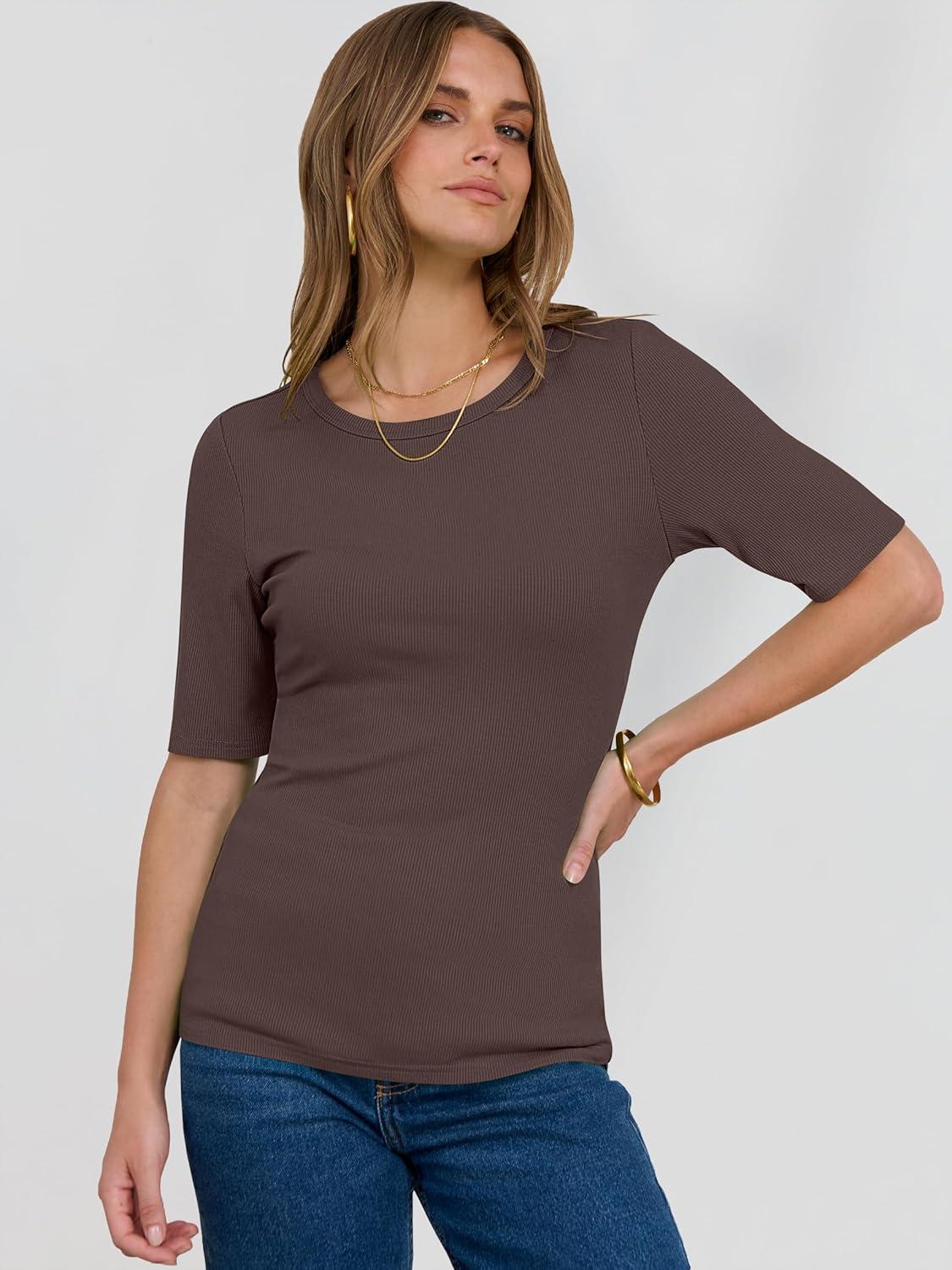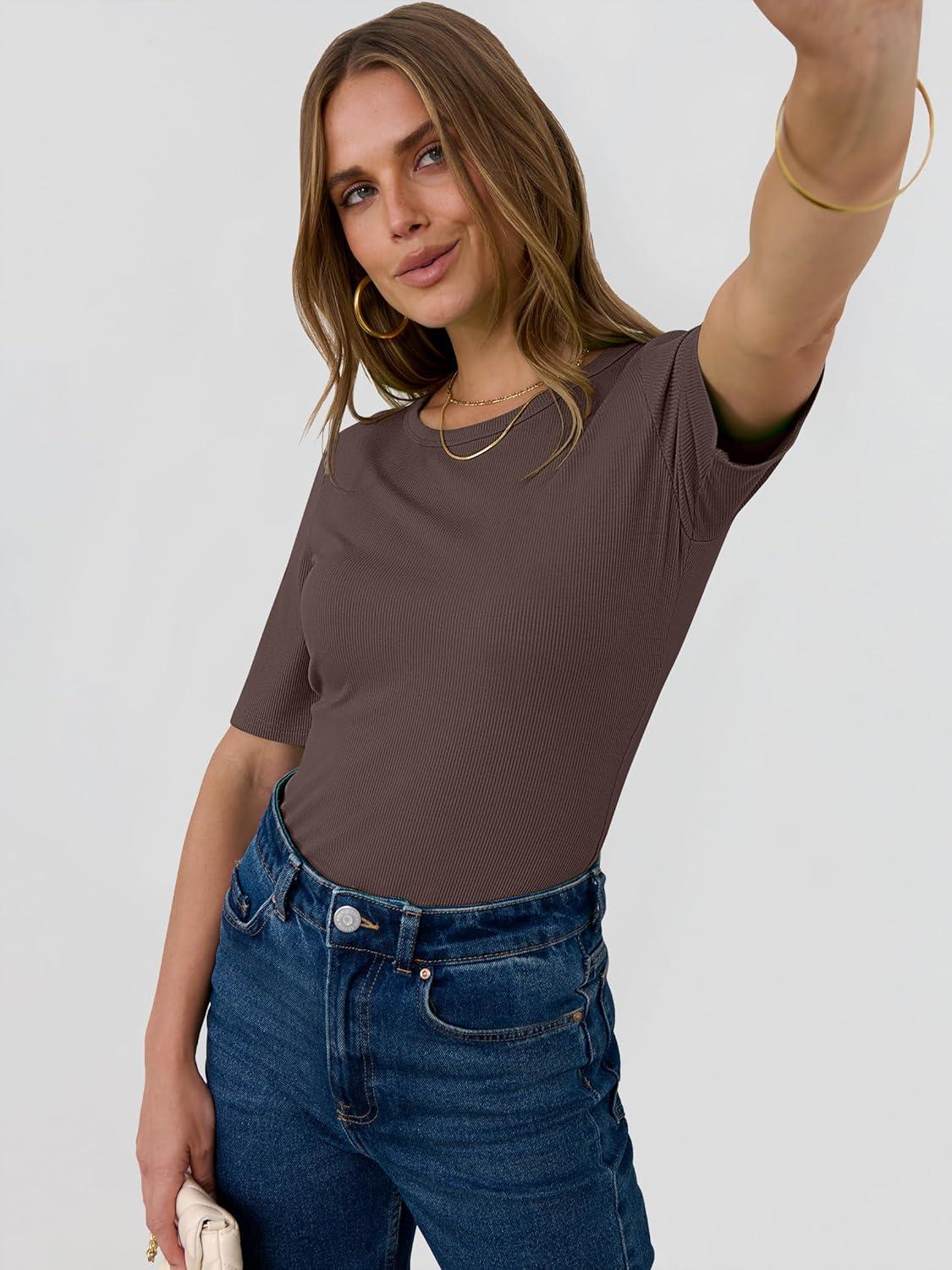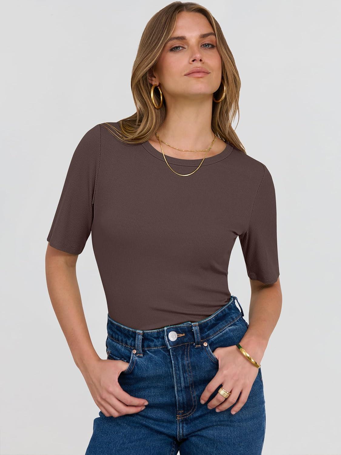 ANRABESS Womens Half Sleeve Crewneck Tops Ribbed Knit Slim Fit Shirts Basic Tee 2025 Spring Summer Dressy Casual T-Shirts(Coffee)